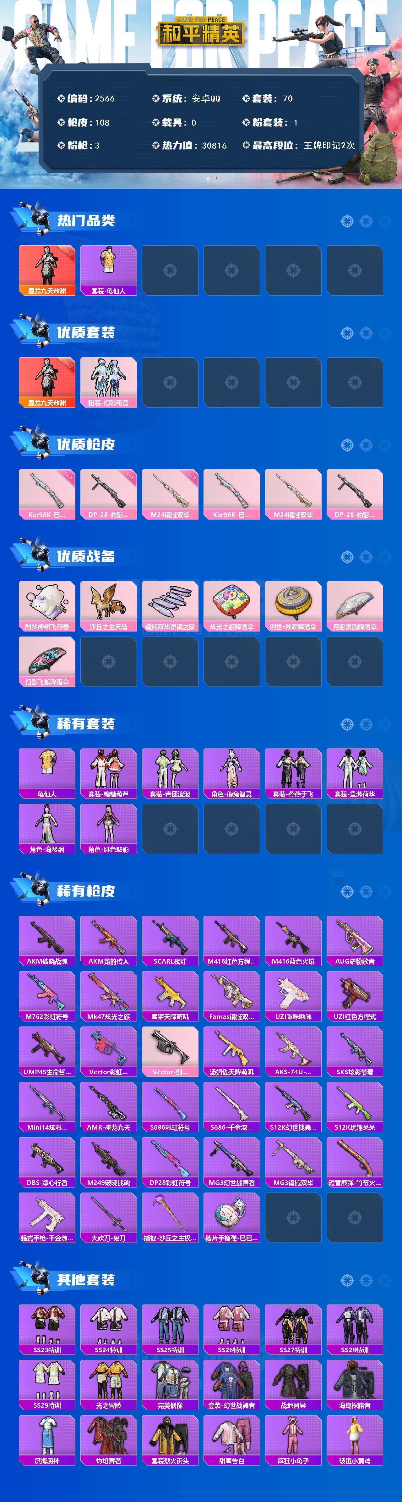 0载具-70套装-108呛皮-70套装/呛械3/装备124/战备69/王牌印记2/热力值30816/五级kar98k-巳巳如意/三级m24-镜域双华/五级dp-28-豹影疾电/二级墨龙九天-敖渊/墨龙九天-敖渊/套装-龟仙人/粉装-幻彩电音/kar98k-巳巳如意/m24-镜域双华/dp-28-豹影疾电/酣梦熊熊飞行器/沙丘之主天马/镜域双华-灵镜之阶/炫光之旅降落伞/创世·救赎降落伞/月影灵韵降落伞/幻影飞狐降落伞/炫彩
