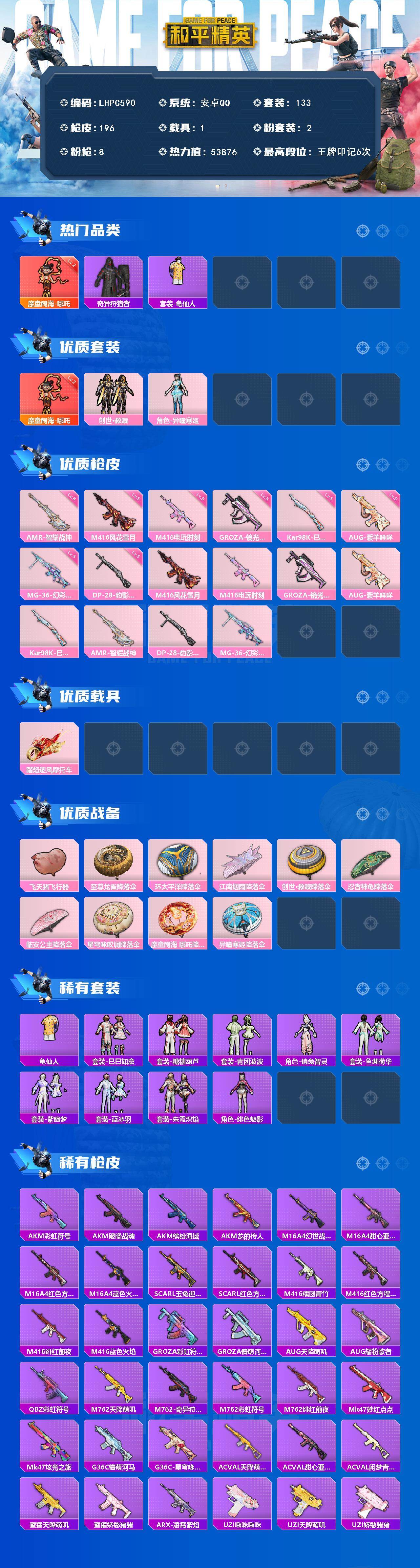 1载具-133套装-196呛皮-【特价出售/店主推荐】安卓 手q-1神装-2粉装-8特效呛-1载具-2粉色飞行器-53876热力值-6王牌印记-133套装-196呛皮 【红色神装等级】:魔童闹海-哪吒二级 【红色角色神装】:魔童闹海-哪吒 【热门品类】:套装-奇异狩猎者,套装-龟仙人 【粉色套装】:套装-创世·救赎,角色-异瞳