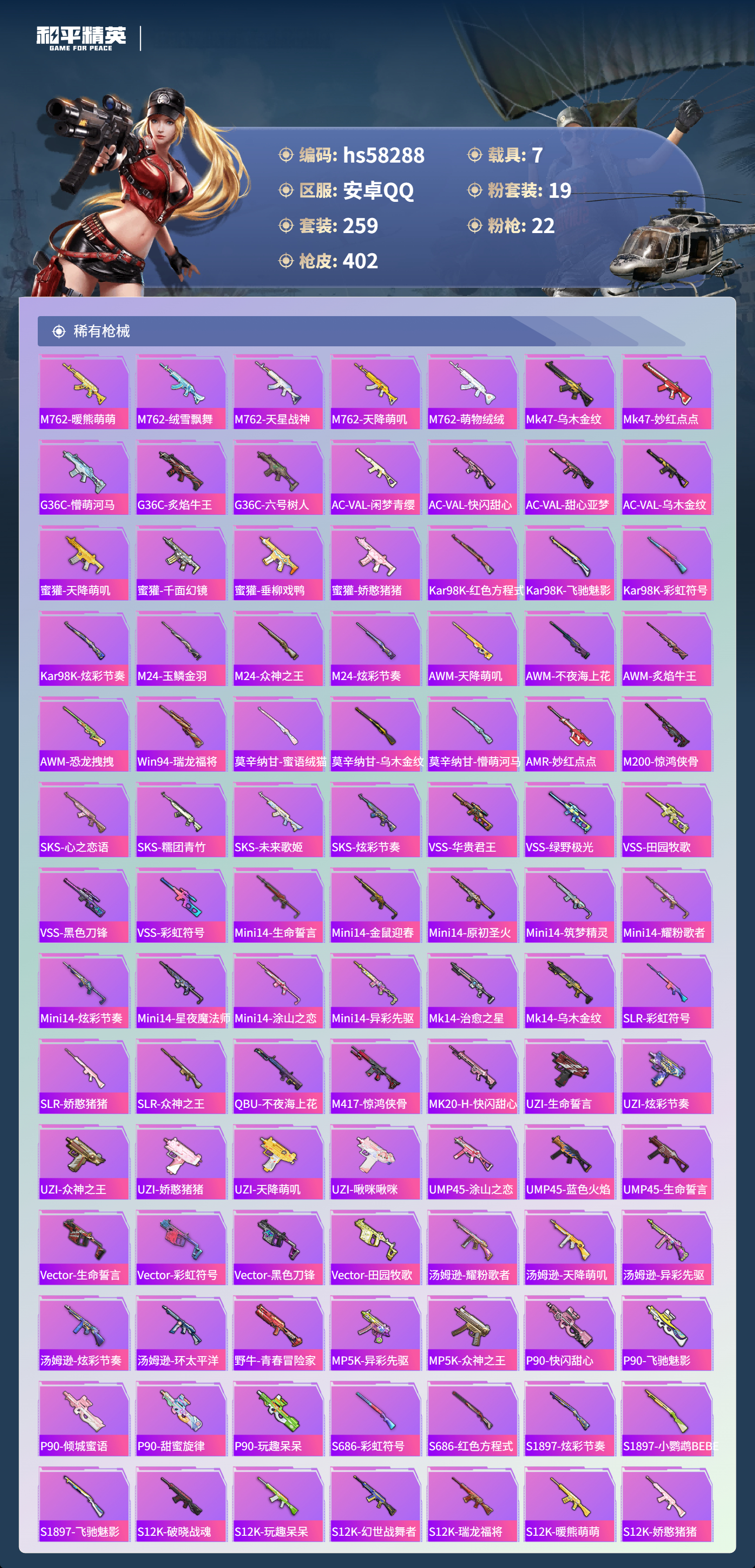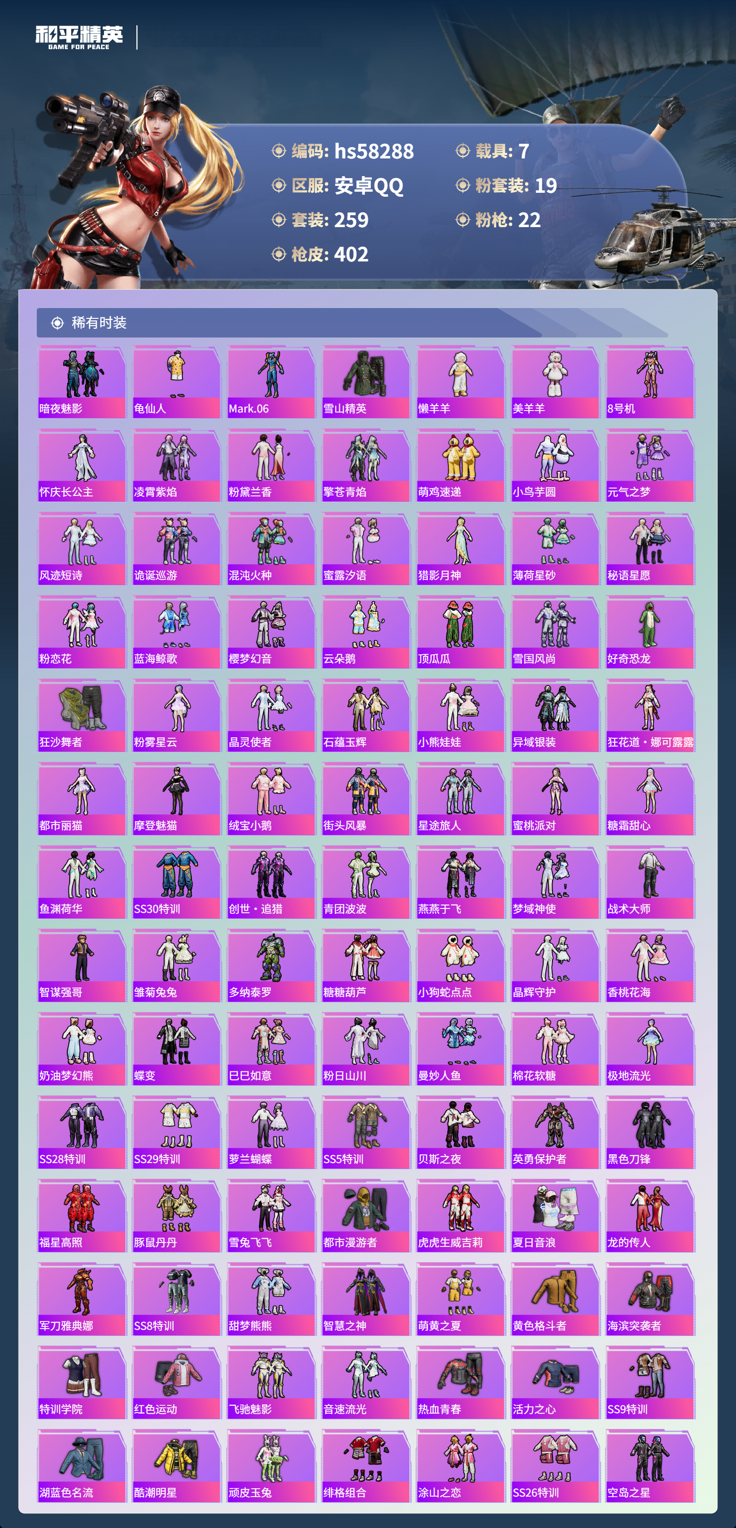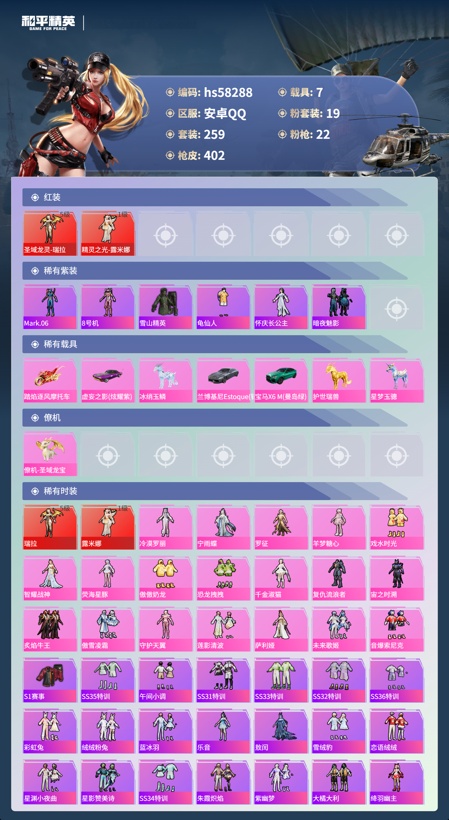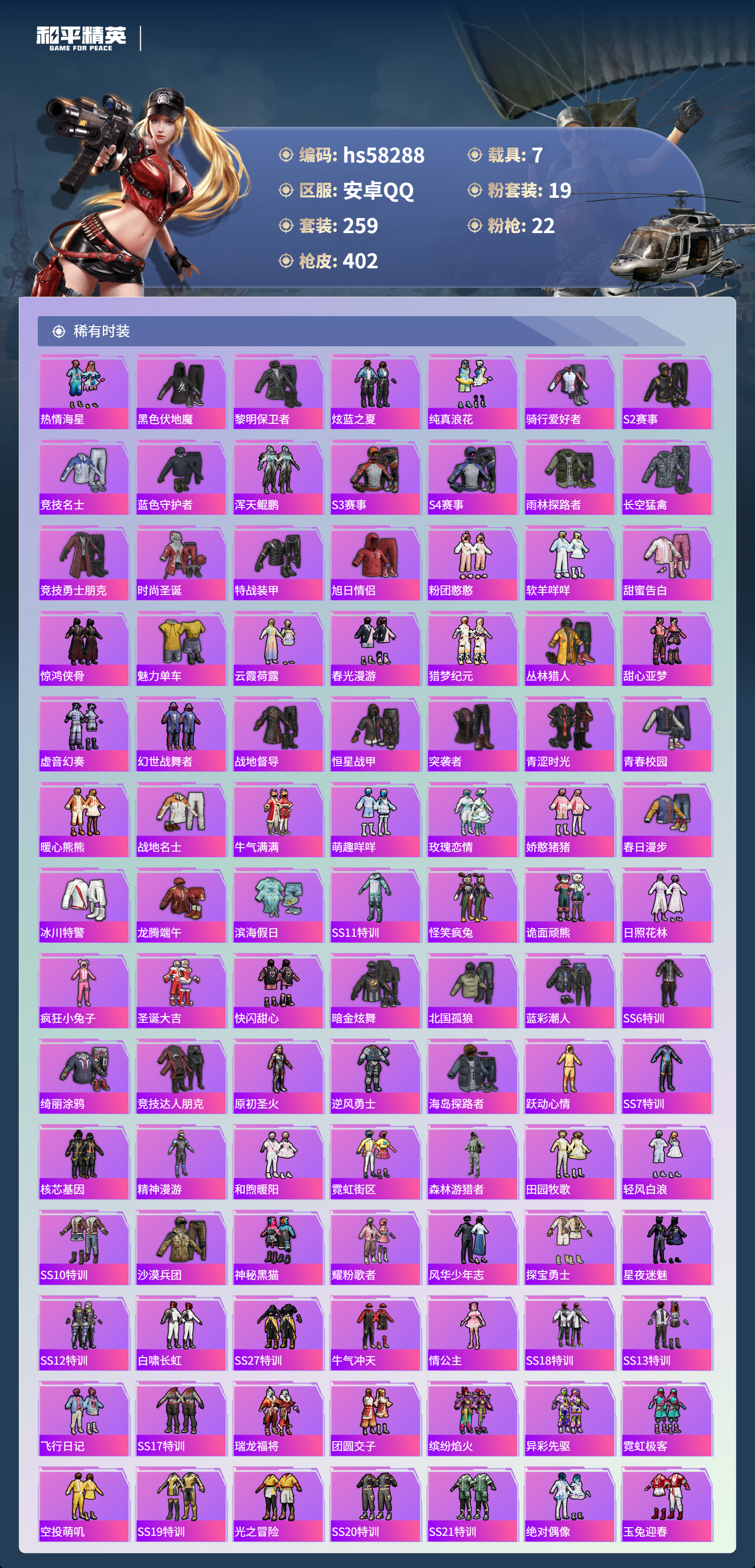7载具-259套装-402呛皮-hs58288 安卓手q-25王牌印记-有战神框-2红装-19粉装-22特效呛-7载具-热力值-259套装-402呛皮-7卓越印记-5传奇印记【2红装】圣域龙灵-瑞拉/5级精灵之光-露米娜/1级【19粉装】角色-守护天翼角色-千金淑猫套装-未来歌姬角色-萨利娅角色-羊梦糖心角色-宁雨蝶角色-宙之时溯套装-音爆索尼克角色-罗征套装-恐龙拽拽角色-智耀战神角色-