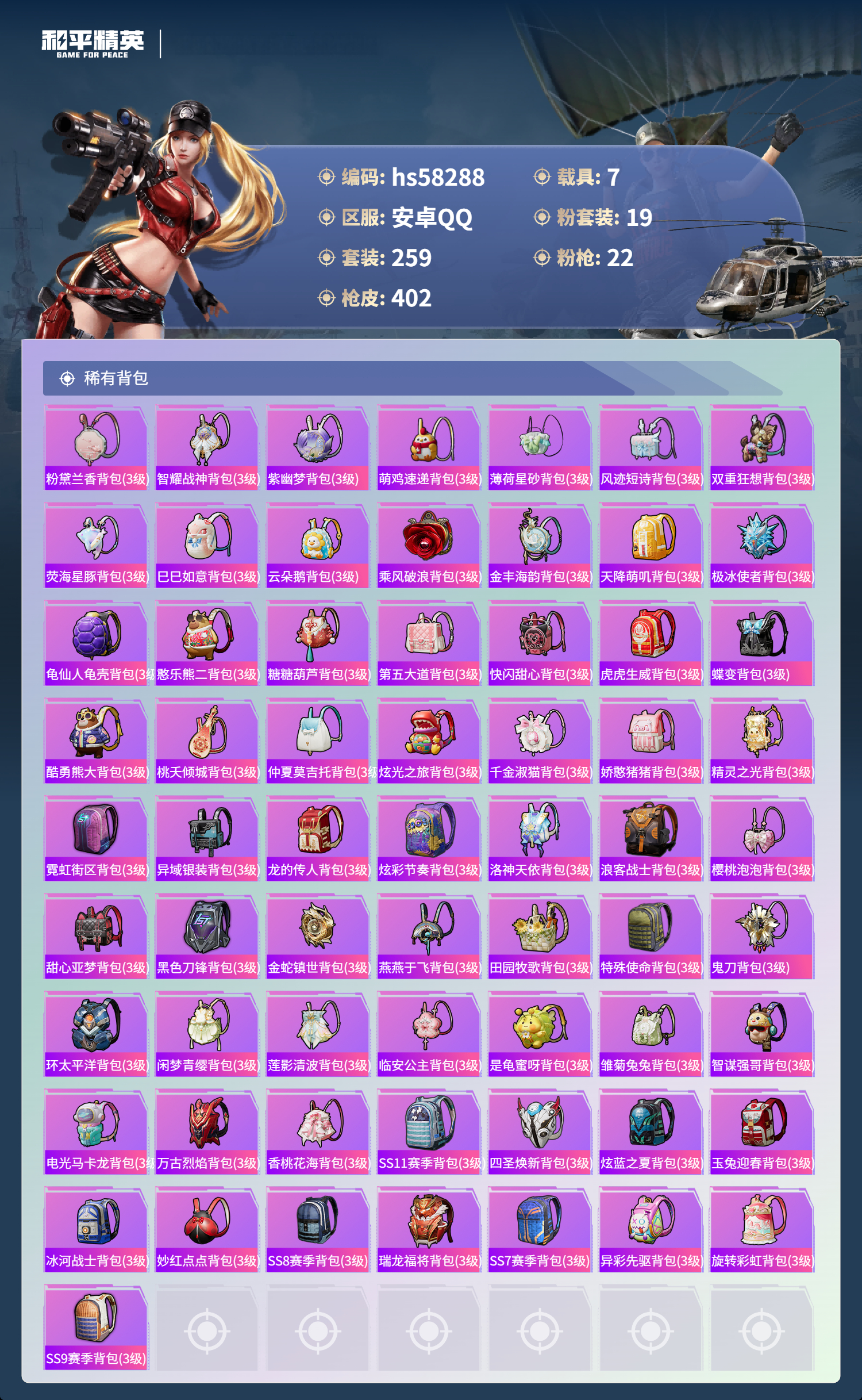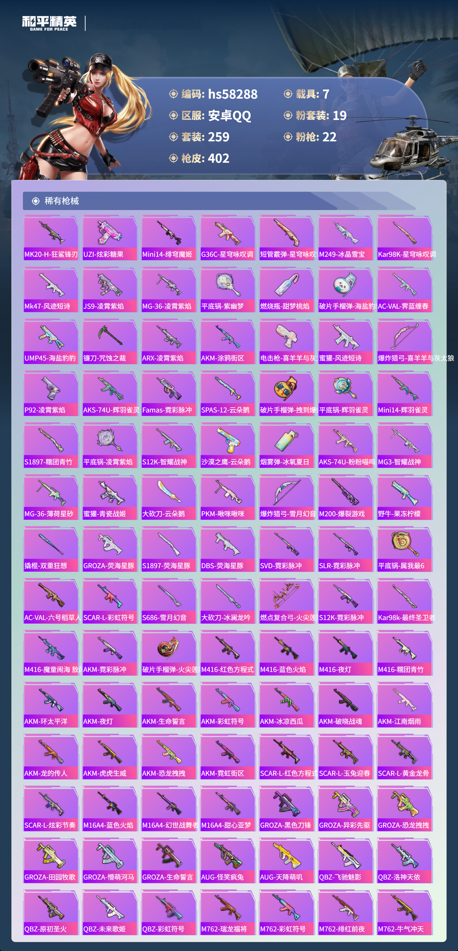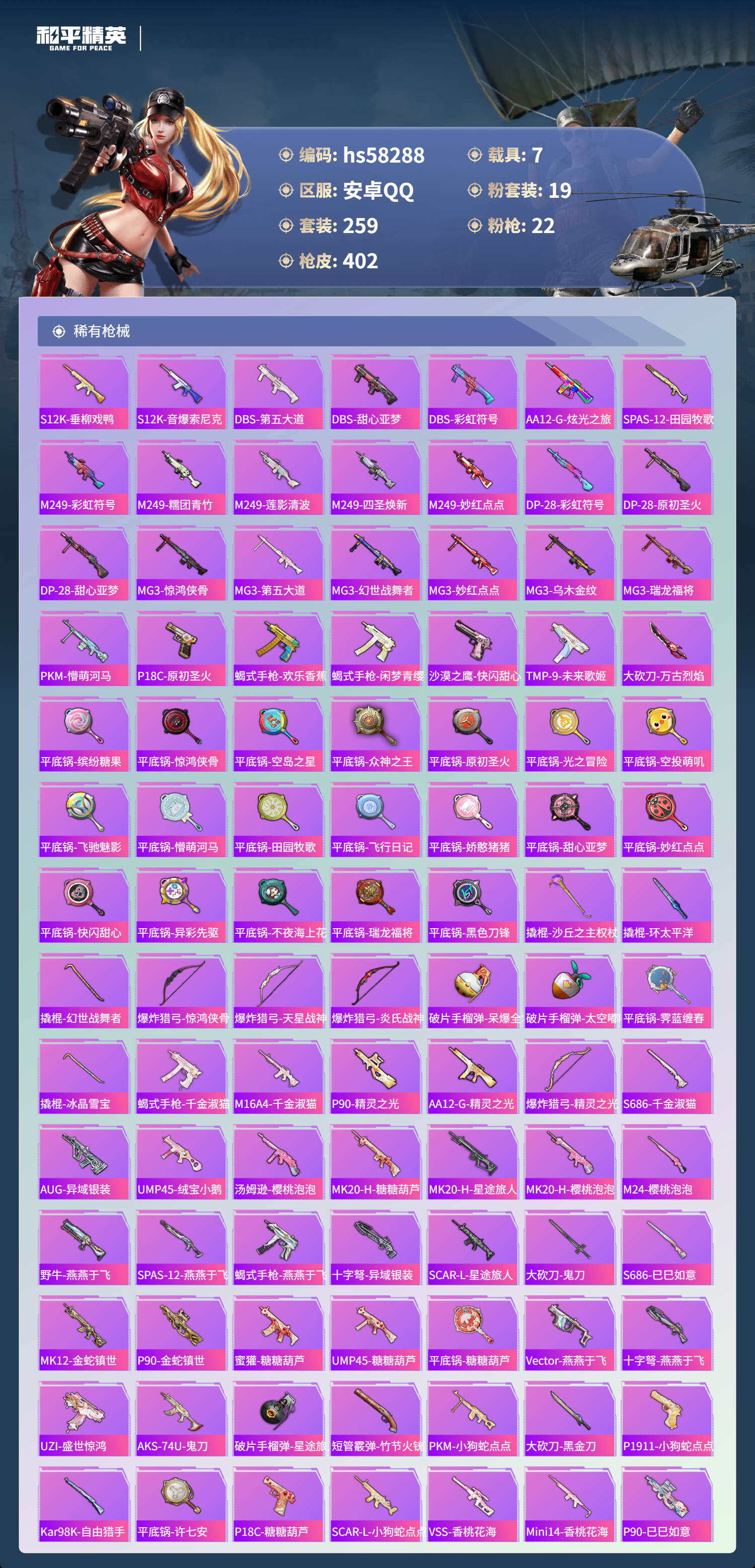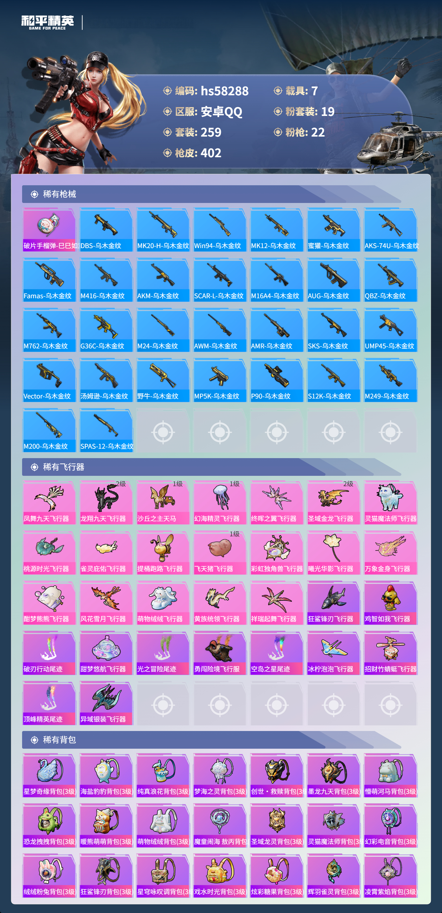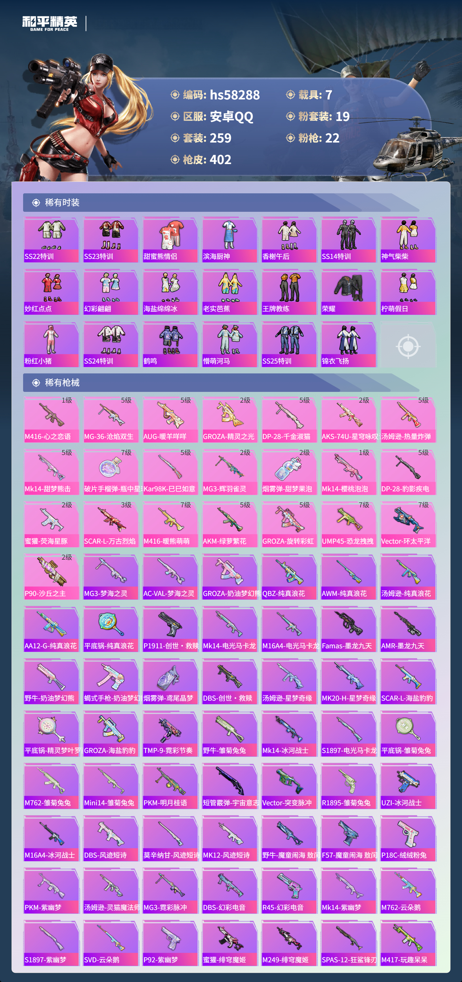 7载具-259套装-402呛皮-hs58288 安卓手q-25王牌印记-有战神框-2红装-19粉装-22特效呛-7载具-热力值-259套装-402呛皮-7卓越印记-5传奇印记【2红装】圣域龙灵-瑞拉/5级精灵之光-露米娜/1级【19粉装】角色-守护天翼角色-千金淑猫套装-未来歌姬角色-萨利娅角色-羊梦糖心角色-宁雨蝶角色-宙之时溯套装-音爆索尼克角色-罗征套装-恐龙拽拽角色-智耀战神角色-