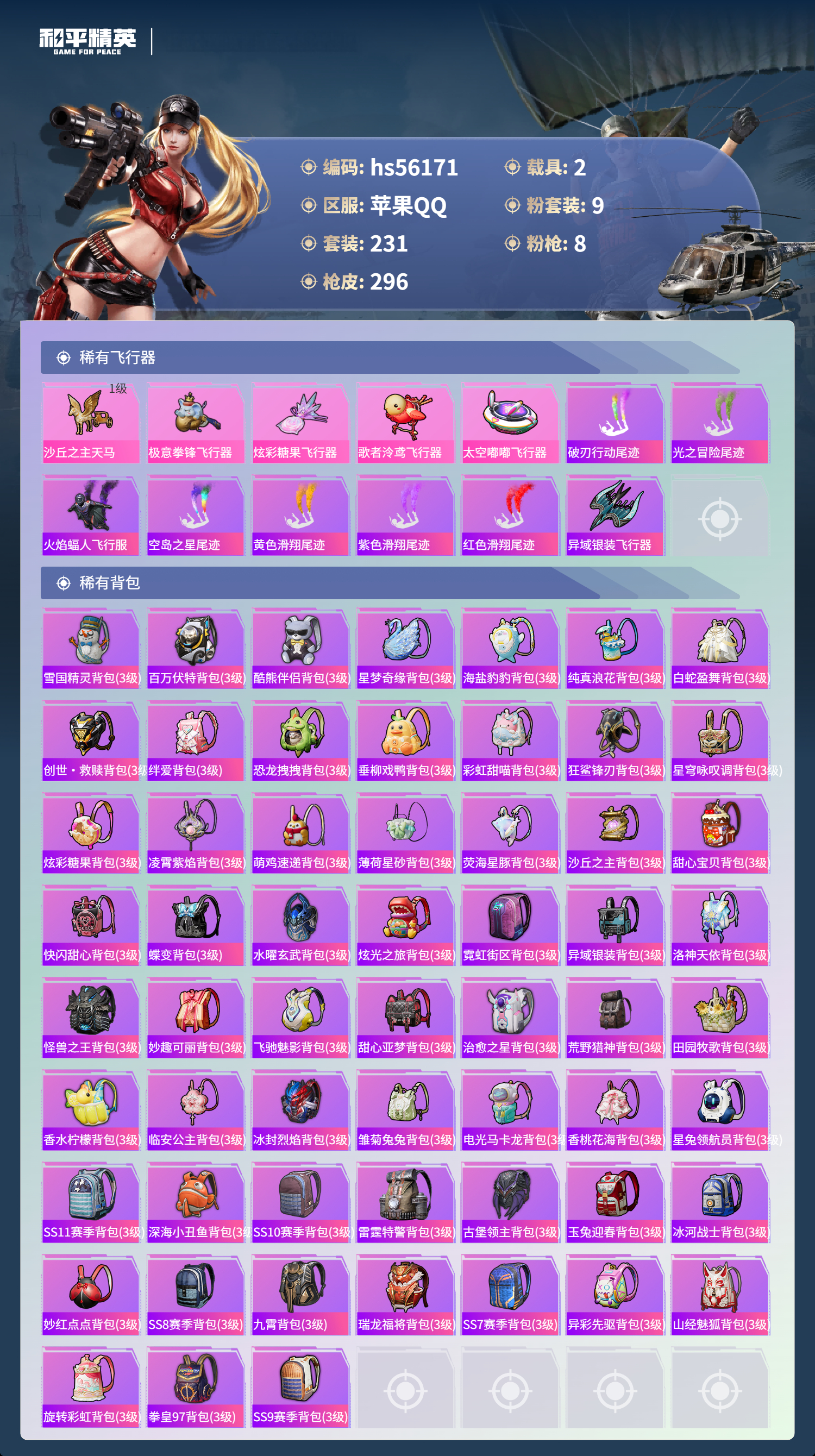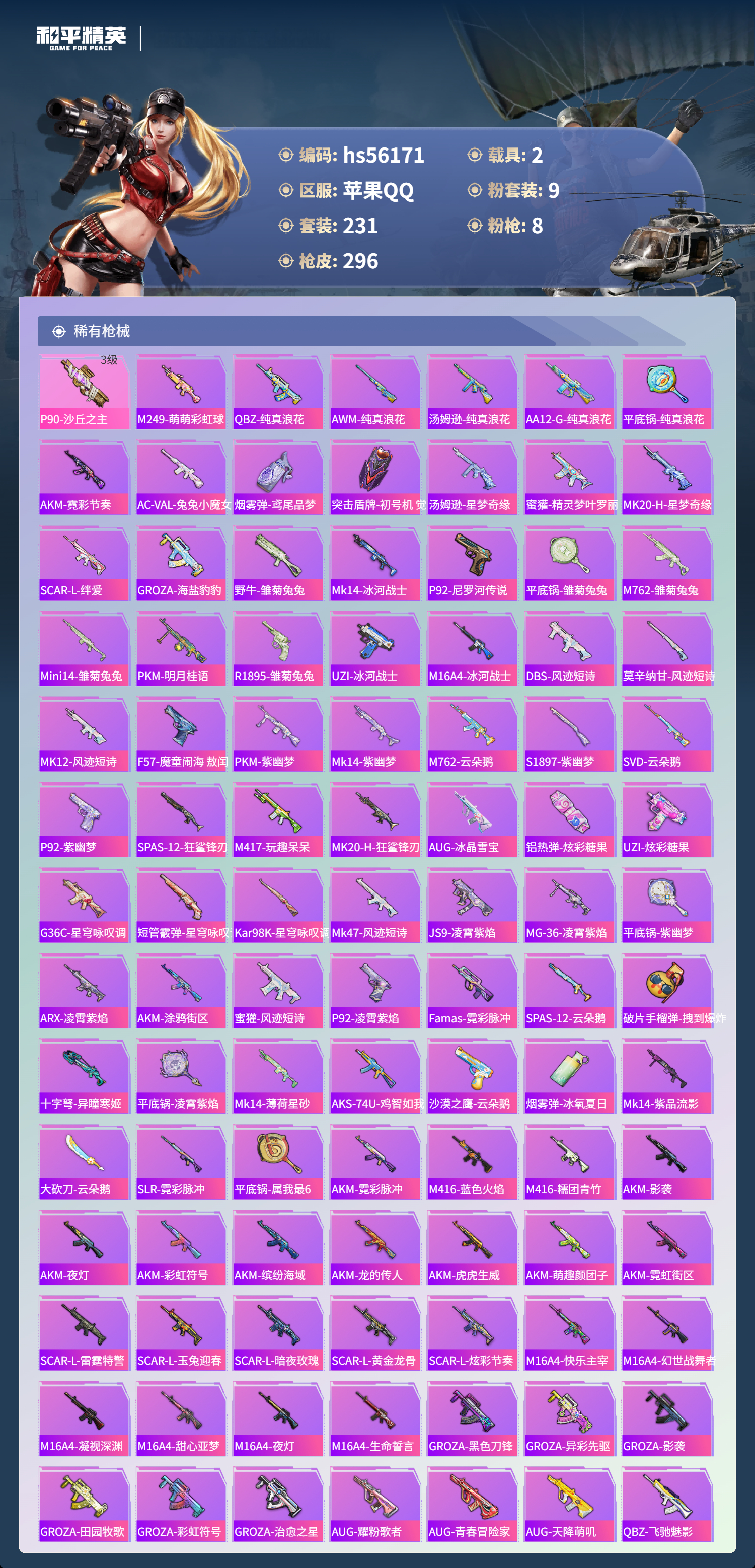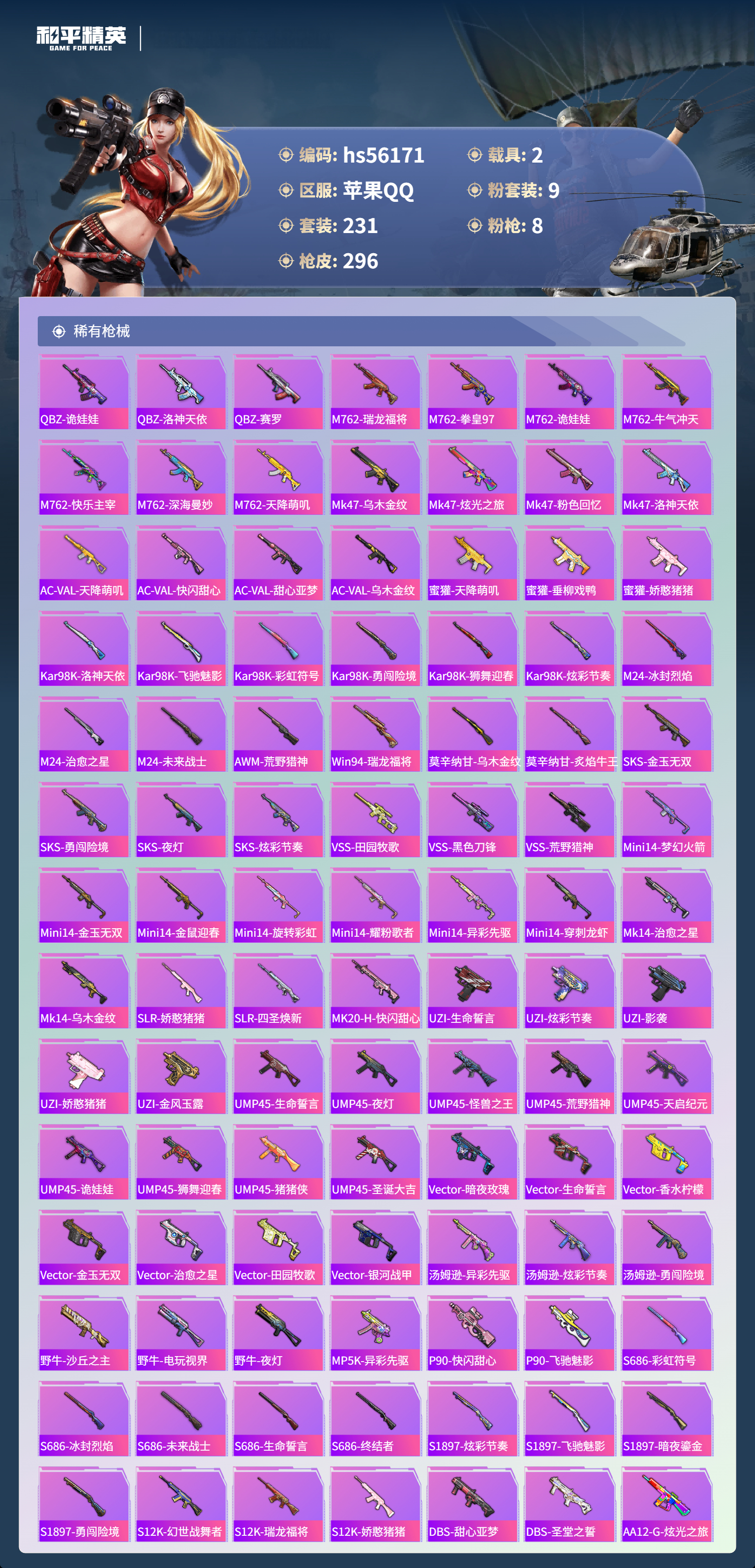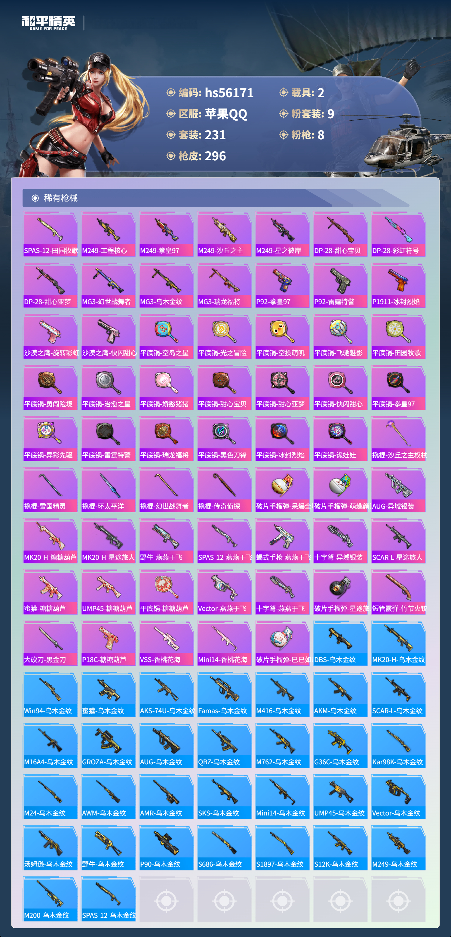 2载具-231套装-296呛皮-hs56171 苹果手q-20王牌印记-有战神框-1红装-9粉装-8特效呛-2载具-热力值-231套装-296呛皮-8卓越印记-7传奇印记【1红装】沙丘之主-图卡盟/5级【9粉装】套装-火曜朱雀套装-未来歌姬角色-洛天依套装-智能音符套装-金曜白虎套装-香水柠檬套装-星穹咏叹调套装-守护骑士套装-橘柚倾心【8特效呛】破片手留单-美味星星糖/7级aug-星梦奇缘/