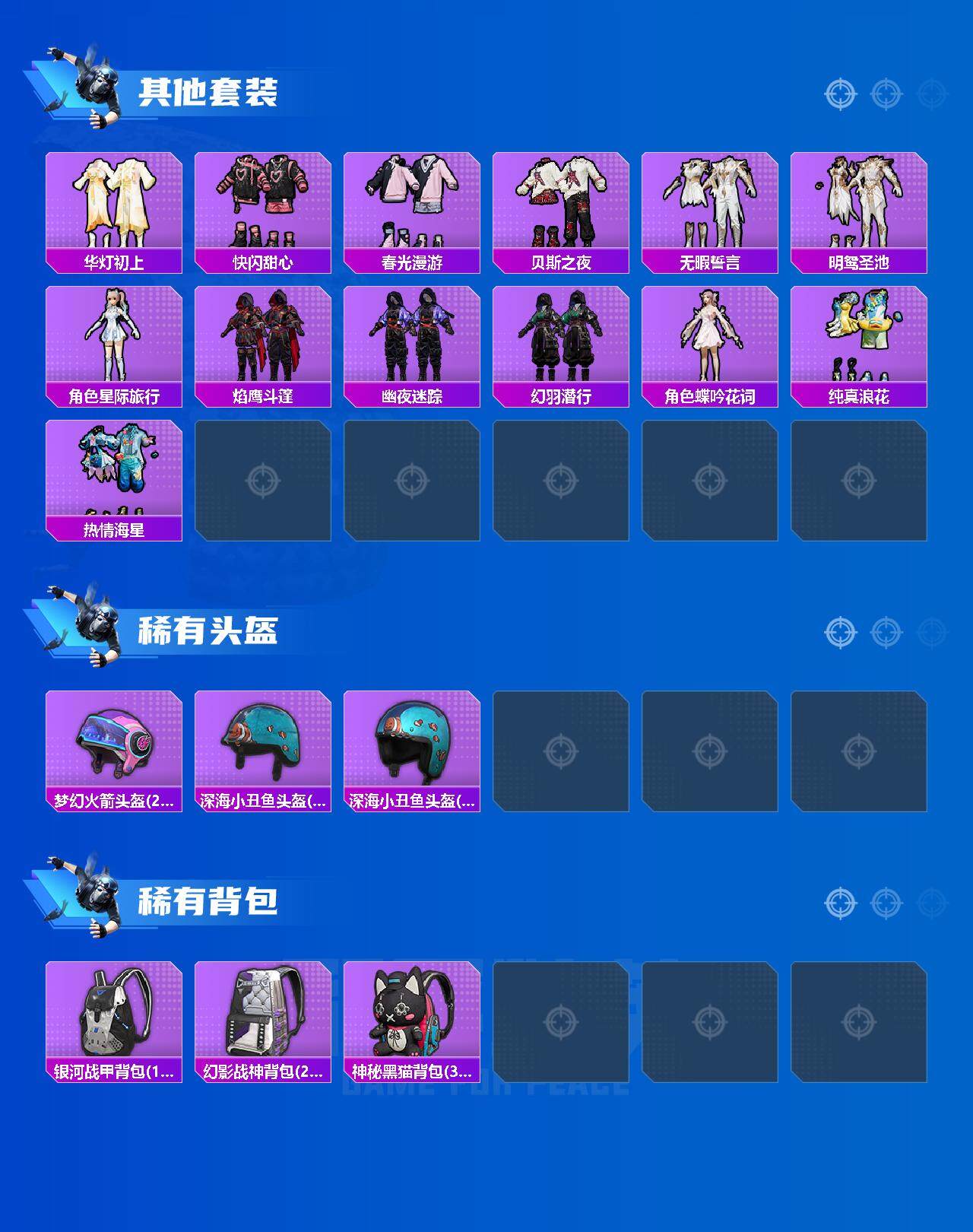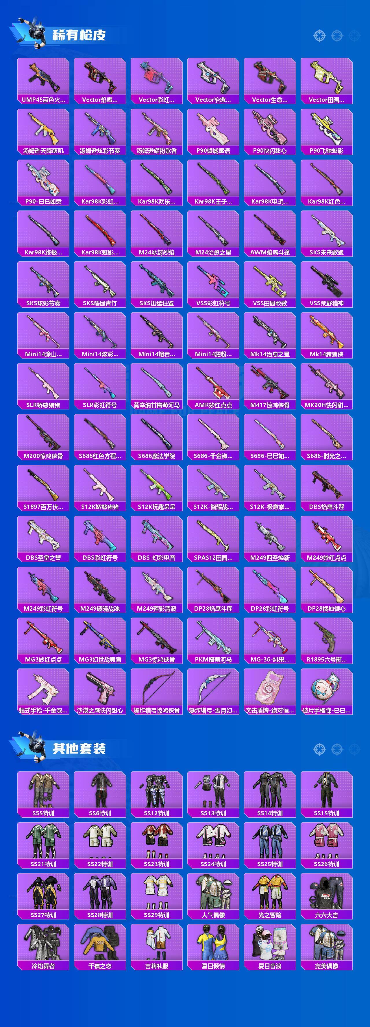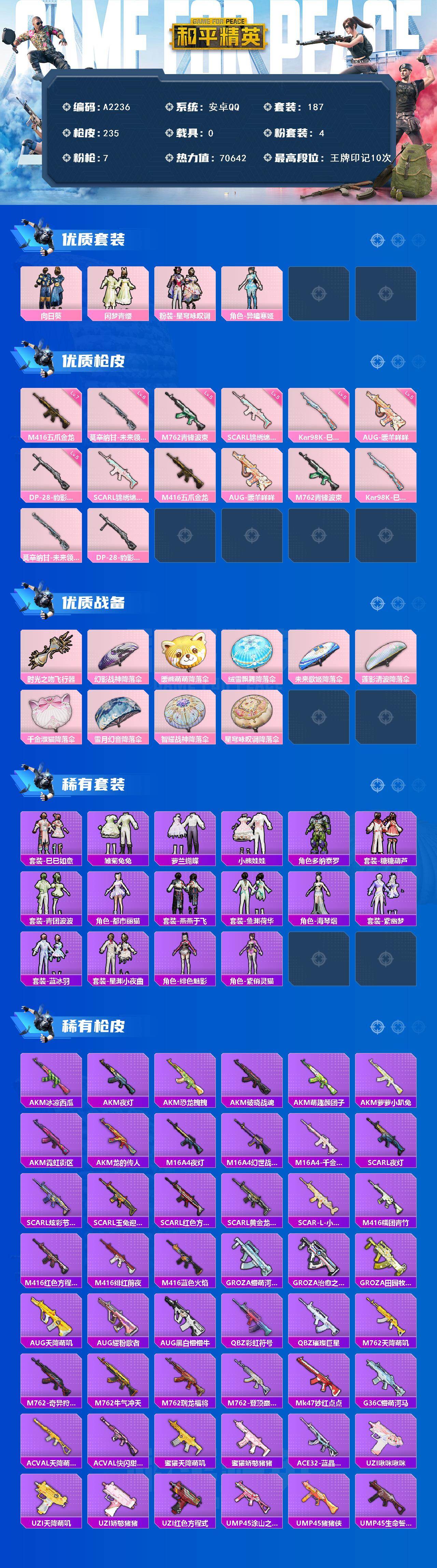 [15853898]安卓【小号】 手q-4粉装-7特效呛-0载具-2粉色飞行器-70642热力值-10王牌印记-187套装-235呛皮 【热门品类】:套装-浪漫天命,套装-黄金大亨,套装-龟仙人 【粉色套装】:粉装-向日葵,粉装-闲梦青缨,粉装-星穹咏叹调,角色-异瞳寒姬 【粉色呛皮等级】:scar-l-锦绣绵绵五级,m416-五爪金龙七级,aug-暖羊咩咩五级,m762-青锋波束五级,kar98k-巳巳如意五级,莫辛纳甘-未来领航者六级,dp-28-豹影疾电五级 【粉色呛皮】:scar-l-锦绣绵绵,m416-五爪金龙,aug-暖羊咩咩,m762-青锋波束,kar98k-巳巳如意,莫辛纳甘-未来领航者,dp-28-豹影疾电 【粉色飞行器】:时光之吻飞行器 【粉色降落伞】:幻影战神降落伞,暖熊萌萌降落伞,绒雪飘舞降落伞,未来歌姬降落伞,莲影清波降落伞,千金淑猫降落伞,雪月幻音降落伞,智耀战神降落伞,星穹咏叹调降落伞,炫彩糖果降落伞 【稀有套装】:套装-龟仙人,套装-巳巳如意,套装-雪国风尚,套装-雏菊兔兔,套装-萝兰蝴蝶,套装-小熊娃娃,角色-多纳泰罗,套装-糖糖葫芦,套装-青团波波,角色-都市丽猫,套装-燕燕于飞,套装-鱼渊荷华,角色-海琴烟,套装-紫幽梦,套装-蓝冰羽,套装-星渊小夜曲,角色-绯色魅影,角色-紫俏灵猫,套装-炫彩糖果 【稀有呛皮】:aug-冰晶雪宝,akm-冰凉西瓜,akm-夜灯,akm-恐龙拽拽,akm-破晓战魂,akm-萌趣颜团子,akm-萝萝小趴兔,akm-霓虹街区,akm-龙的传人,m16a4-夜灯,m16a4-幻世战舞者,m16a4-千金淑猫,scar-l-夜灯,scar-l-炫彩节奏,scar-l-玉兔迎春,scar-l-红色方程式,scar-l-黄金龙骨,scar-l-小狗蛇点点,m416-糯团青竹,m416-红色方程式,m416-绯红前夜,m416-蓝色火焰,groza-懵萌河马,groza-治愈之星,groza-田园牧歌,aug-天降萌叽,aug-耀粉歌者,aug-黑白懵懵牛,q-彩虹符号,q-璀璨巨星,m762-天降萌叽,m762-奇异狩猎者,m762-牛气冲天,m762-瑞龙福将,m762-登顶巅峰,mk47-妙红点点,g36c-懵萌河马,ac-val-天降萌叽,ac-val-快闪甜心,蜜獾-天降萌叽,蜜獾