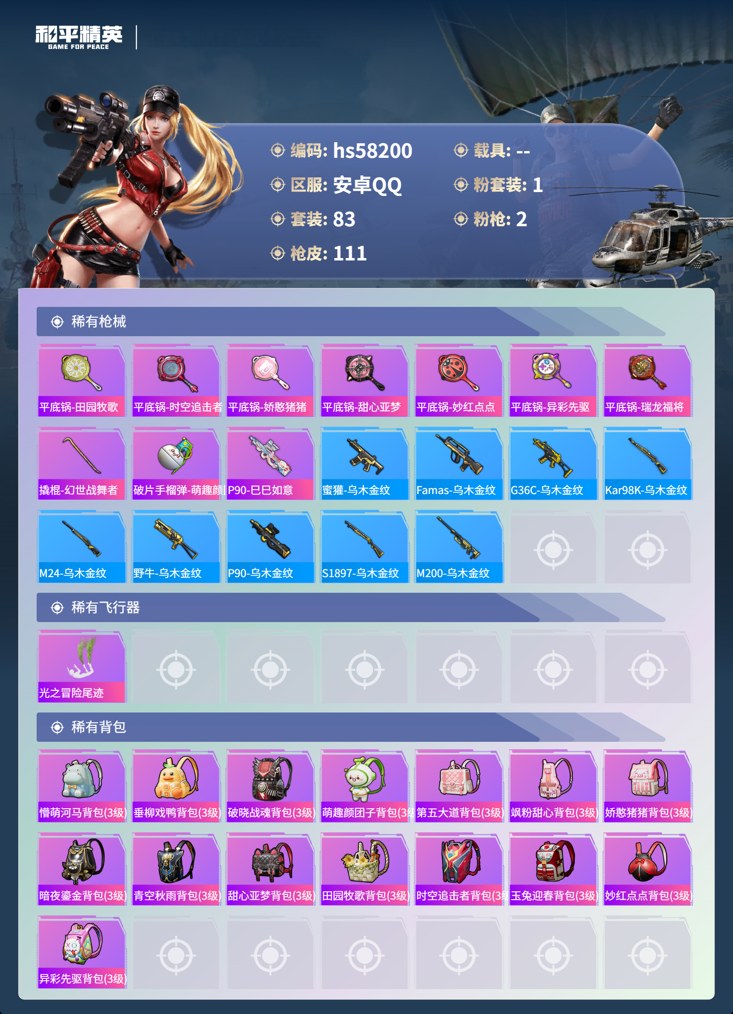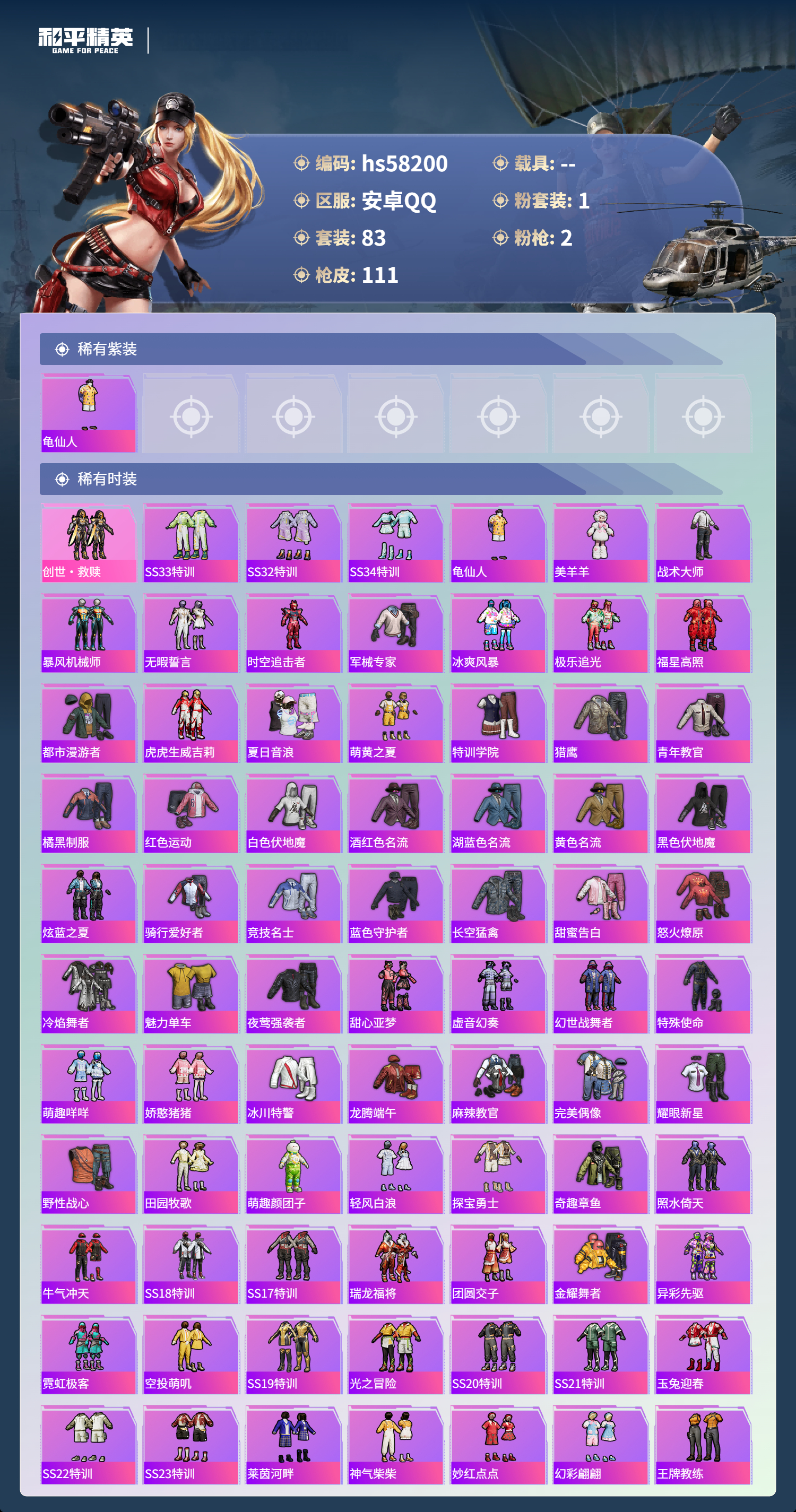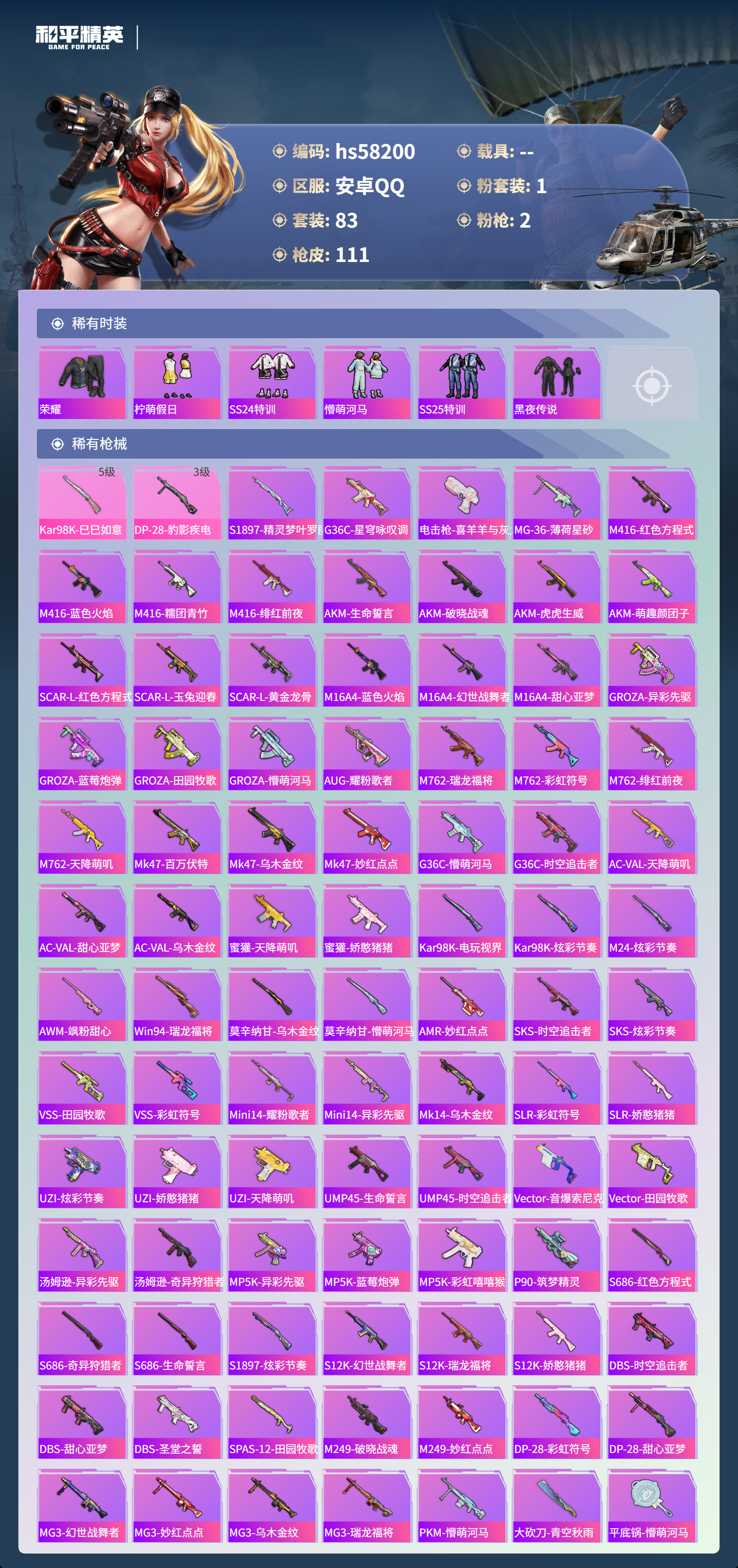 hs58200 安卓手q-5王牌印记-1粉装-2特效呛-29739热力值-83套装-111呛皮【1粉装】套装-创世·救赎【2特效呛】dp-28-豹影疾电/3级kar98k-巳巳如意/5级【1稀有紫装】龟仙人【83稀有时装】ss33特训ss32特训ss34特训龟仙人美羊羊创世·救赎战术大师暴风机械师无暇誓言时空追击者军械专家冰爽风暴极乐追光福星高照都市漫游者虎