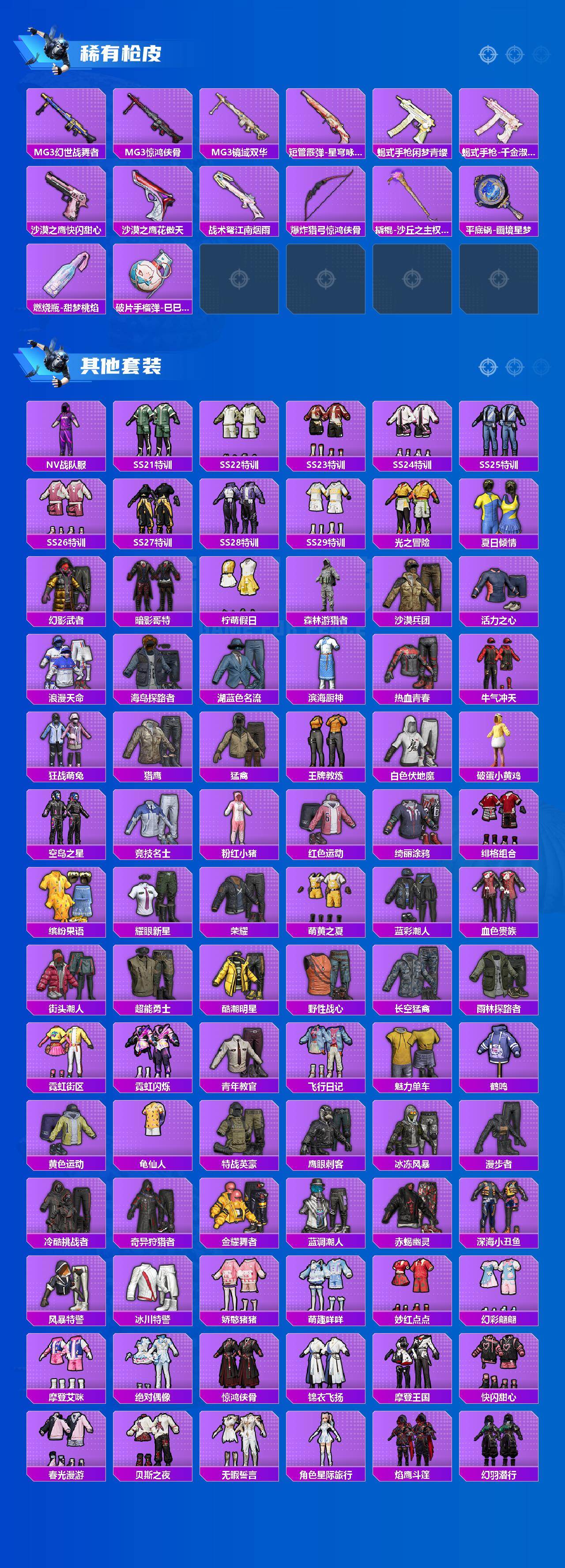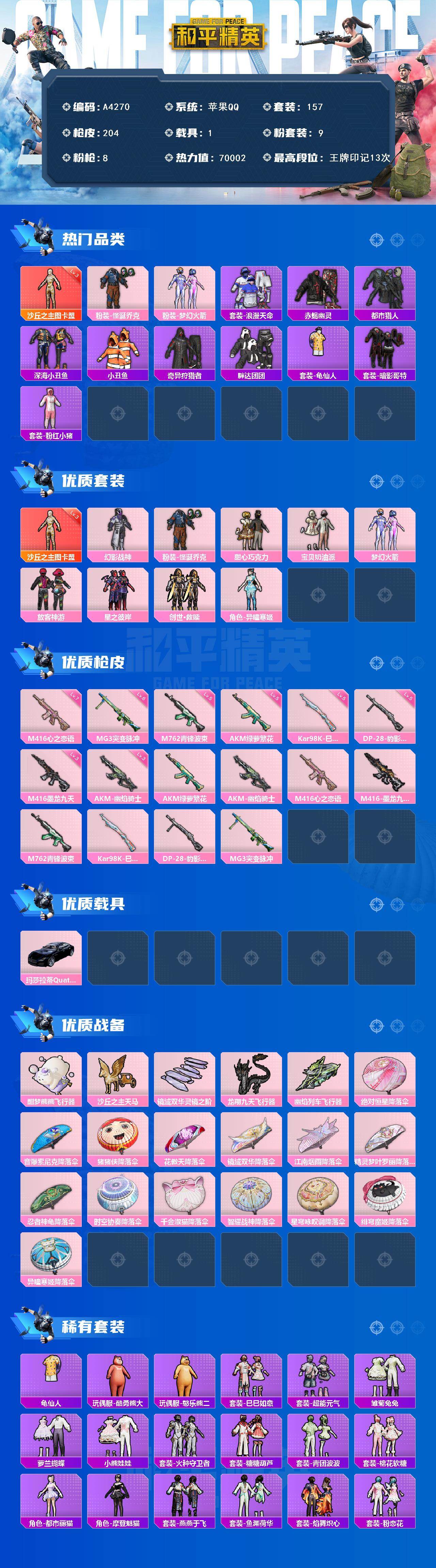 [15863093]苹果 【神装号 沙丘之主-图卡盟三级/怪诞乔克/赤蝎幽灵/都市猎人/暗影哥特/akm-幽焰骑士三级/玛莎拉蒂quattropte(夜幕蓝)】手q-1神装-9粉装-8特效呛-1载具-7粉色飞行器-70002热力值-13王牌印记-157套装-204呛皮 【红色神装等级】:沙丘之主-图卡盟三级 【红色角色神装】:沙丘之主-图卡盟 【热门品类】:粉装-怪诞乔克,粉装-梦幻火箭,套装-浪漫天命,套装-赤蝎幽灵,套装-都市猎人,套装-深海小丑鱼,套装-小丑鱼,套装-奇异狩猎者,套装-胖达团团,套装-龟仙人,套装-暗影哥特,套装-粉红小猪 【粉色套装】:粉装-幻影战神,粉装-怪诞乔克,粉装-甜心巧克力,粉装-宝贝奶油派,粉装-梦幻火箭,粉装-放客神游,粉装-星之彼岸,套装-创世·救赎,角色-异瞳寒姬 【粉色呛皮等级】:akm-绿萝繁花五级,akm-幽焰骑士三级,m416-心之恋语七级,m416-墨龙九天三级,m762-青锋波束五级,kar98k-巳巳如意五级,dp-28-豹影疾电五级,mg3-突变脉冲六级 【粉色载具】:玛莎拉蒂quattropte(夜幕蓝) 【粉色呛皮】:akm-绿萝繁花,akm-幽焰骑士,m416-心之恋语,m416-墨龙九天,m762-青锋波束,kar98k-巳巳如意,dp-28-豹影疾电,mg3-突变脉冲 【粉色飞行器】:酣梦熊熊飞行器,沙丘之主天马,镜域双华-灵镜之阶,龙翔九天飞行器,幽焰列车飞行器 【粉色降落伞】:绝对恒星降落伞,音爆索尼克降落伞,猪猪侠降落伞,花傲天降落伞,镜域双华降落伞,江南烟雨降落伞,精灵梦叶罗丽降落伞,忍者神龟降落伞,时空协奏降落伞,千金淑猫降落伞,智耀战神降落伞,星穹咏叹调降落伞,绯穹魔姬降落伞,异瞳寒姬降落伞,炫彩糖果降落伞 【稀有套装】:套装-龟仙人,玩偶服-酷勇熊大,玩偶服-憨乐熊二,套装-巳巳如意,套装-超能元气,套装-雪国风尚,套装-雏菊兔兔,套装-萝兰蝴蝶,套装-小熊娃娃,套装-火种守卫者,套装-糖糖葫芦,套装-青团波波,套装-棉花软糖,角色-都市丽猫,角色-摩登魅猫,套装-燕燕于飞,套装-鱼渊荷华,套装-焰舞炽心,套装-粉恋花,套装-紫幽梦,套装-蓝冰羽,角色-猎影月神,套装-星影赞美诗,套装-星渊小夜曲,角色-绯色魅影,套装-书海巡游,套装-画境星梦,套装-