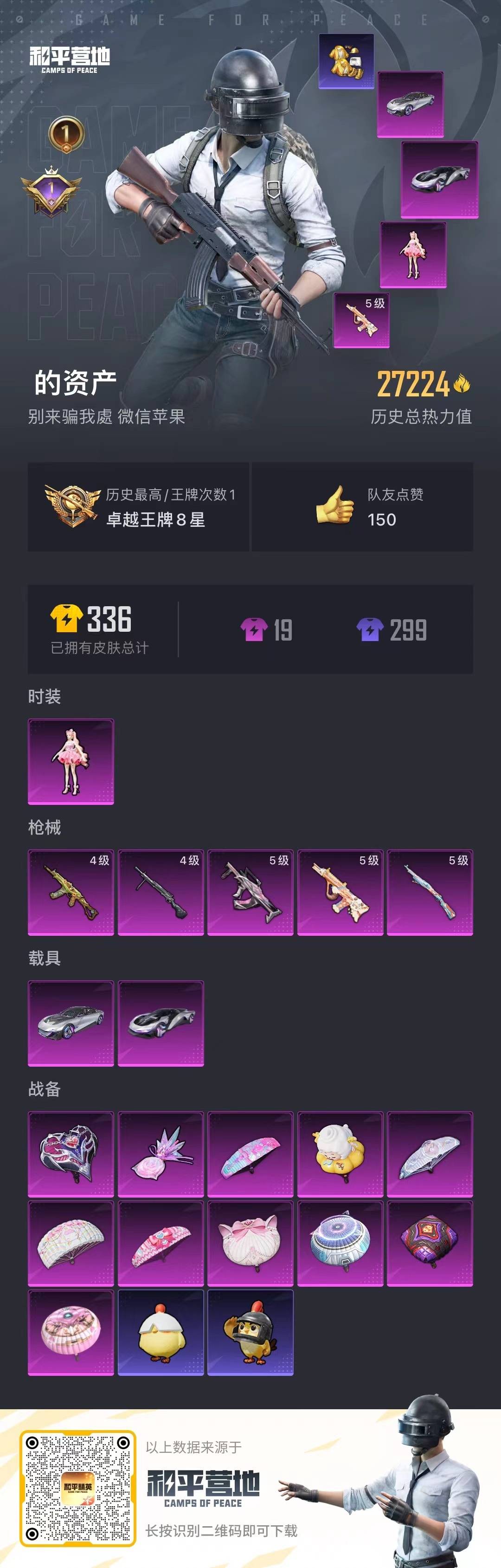 1粉装 5特效呛 2载具 1印记 可二次 【热门装扮】樱桃泡泡派对舞王小金鞋 【载具】星河领航磐石银时空跃影星辉银 【稀有呛皮】aug-暖羊咩咩groza-镜光银凌kar98k-巳巳如意aks-74u-森灵之息dp-28-豹影疾电 【五级特效呛】五级groza-镜光银凌五
