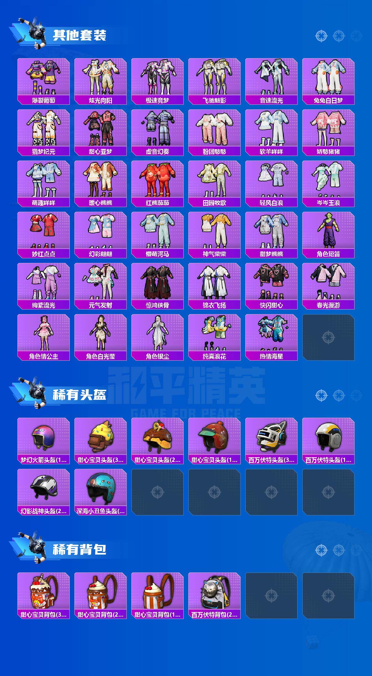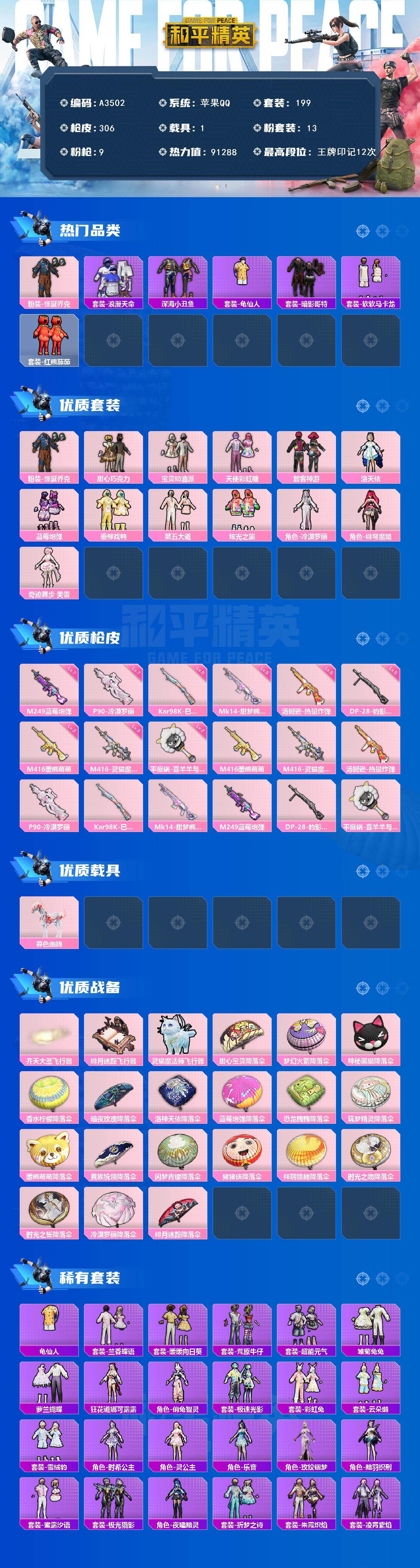 [15555912]苹果【素材号/怪诞乔克/暗影哥特/甜心巧克力/放客神游/百万伏特背包2级】 手q-13粉装-9特效呛-1载具-4粉色飞行器-91288热力值-12王牌印记-199套装-306呛皮 【热门品类】:粉装-怪诞乔克,套装-浪漫天命,套装-深海小丑鱼,套装-龟仙人,套装-暗影哥特,套装-软软马卡龙,套装-红熊茄茄 【粉色套装】:粉装-怪诞乔克,粉装-甜心巧克力,粉装-宝贝奶油派,粉装-天使彩虹糖,粉装-放客神游,角色-洛天依,粉装-蓝莓炮弹,粉装-垂柳戏鸭,粉装-第五大道,粉装-炫光之旅,角色-冷漠罗丽,角色-绯穹魔姬,角色-奇迹舞步 美雪 【粉色呛皮等级】:m416-暖熊萌萌三级,m416-灵猫魔法师三级,汤姆逊-热量炸弹五级,p90-冷漠罗丽七级,kar98k-巳巳如意五级,mk14-甜梦熊击五级,m249-蓝莓炮弹七级,dp-28-豹影疾电五级,平底锅-喜羊羊与灰太狼二级 【粉色载具】:暮色幽蹄 【粉色呛皮】:m416-暖熊萌萌,m416-灵猫魔法师,汤姆逊-热量炸弹,p90-冷漠罗丽,kar98k-巳巳如意,mk14-甜梦熊击,m249-蓝莓炮弹,dp-28-豹影疾电,平底锅-喜羊羊与灰太狼 【粉色飞行器】:齐天大圣飞行器,绯月迷踪飞行器,灵猫魔法师飞行器 【粉色降落伞】:甜心宝贝降落伞,梦幻火箭降落伞,神秘黑猫降落伞,香水柠檬降落伞,暗夜玫瑰降落伞,洛神天依降落伞,蓝莓炮弹降落伞,恐龙拽拽降落伞,筑梦精灵降落伞,暖熊萌萌降落伞,黄族统领降落伞,闲梦青缨降落伞,猪猪侠降落伞,祥瑞锦鲤降落伞,时光之吻降落伞,时光之誓降落伞,冷漠罗丽降落伞,绯月迷踪降落伞,炫彩糖果降落伞 【稀有套装】:套装-龟仙人,套装-兰香蝶语,套装-暖暖向日葵,套装-荒原牛仔,套装-超能元气,套装-雏菊兔兔,套装-萝兰蝴蝶,角色-狂花道·娜可露露,角色-俏兔智灵,套装-极速光影,套装-彩虹兔,套装-云朵鹅,套装-雪绒豹,角色-时希公主,角色-灵公主,角色-乐音,角色-玫纹锢梦,角色-黯羽织刑,套装-蜜露汐语,套装-极光猎影,角色-夜瞳黯灵,套装-折梦之诗,套装-朱霞炽焰,套装-凌霄紫焰,套装-擎苍青焰,玩偶服-喜羊羊,角色-绯色魅影,套装-书海巡游,套装-画境星梦,套装-琴音绮想,套装-炫彩糖果 【稀有呛皮】:akm-夜灯,akm-彩虹符号,akm-影袭,