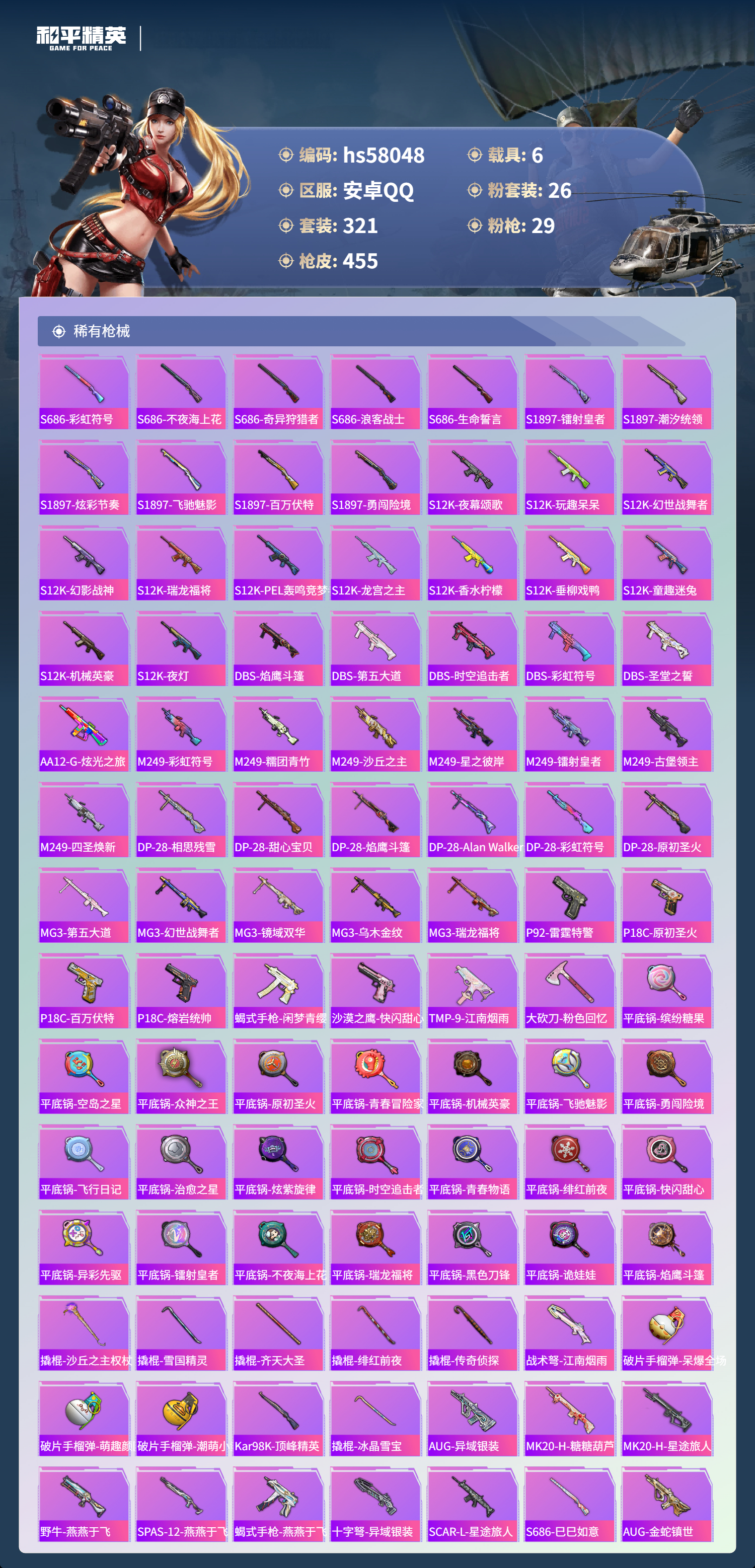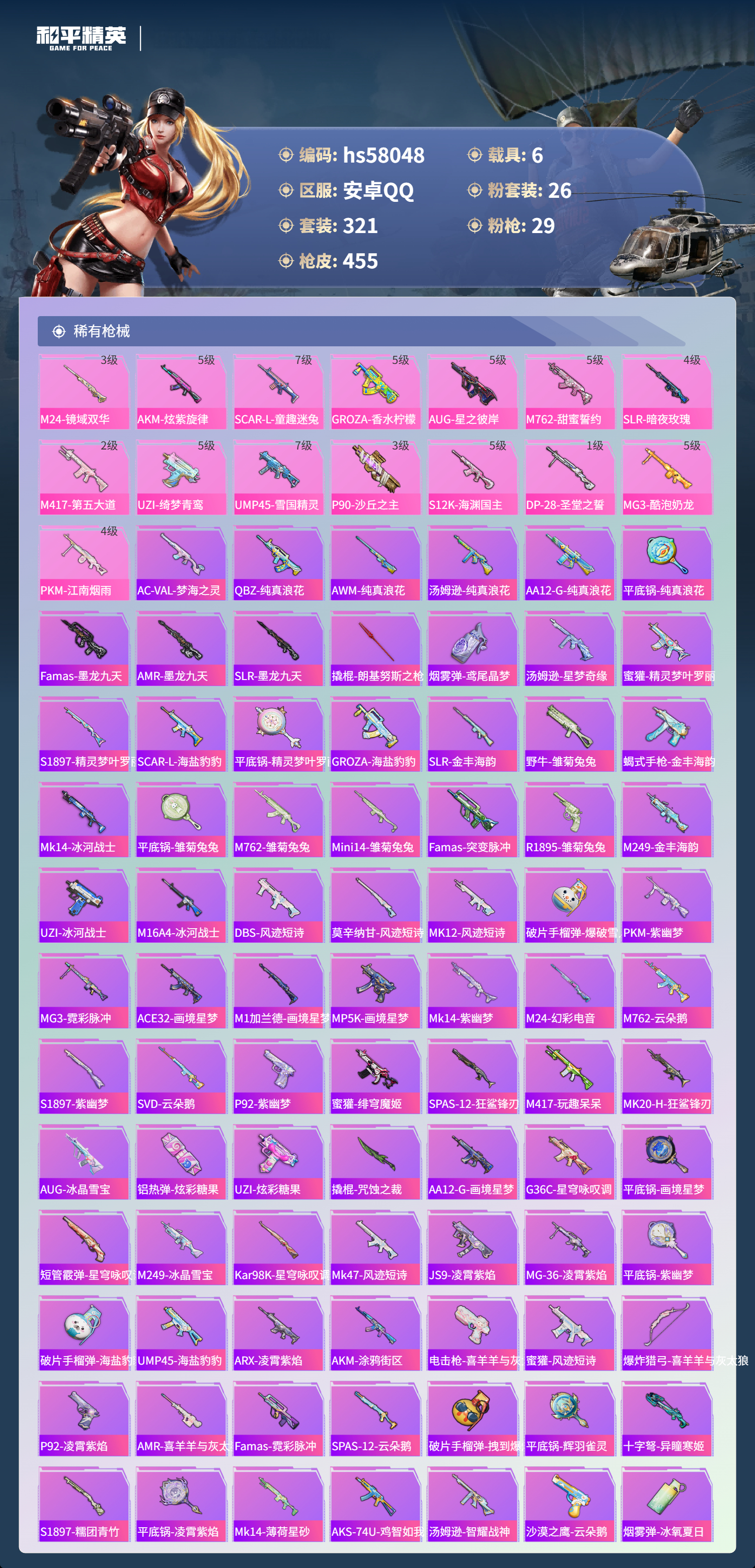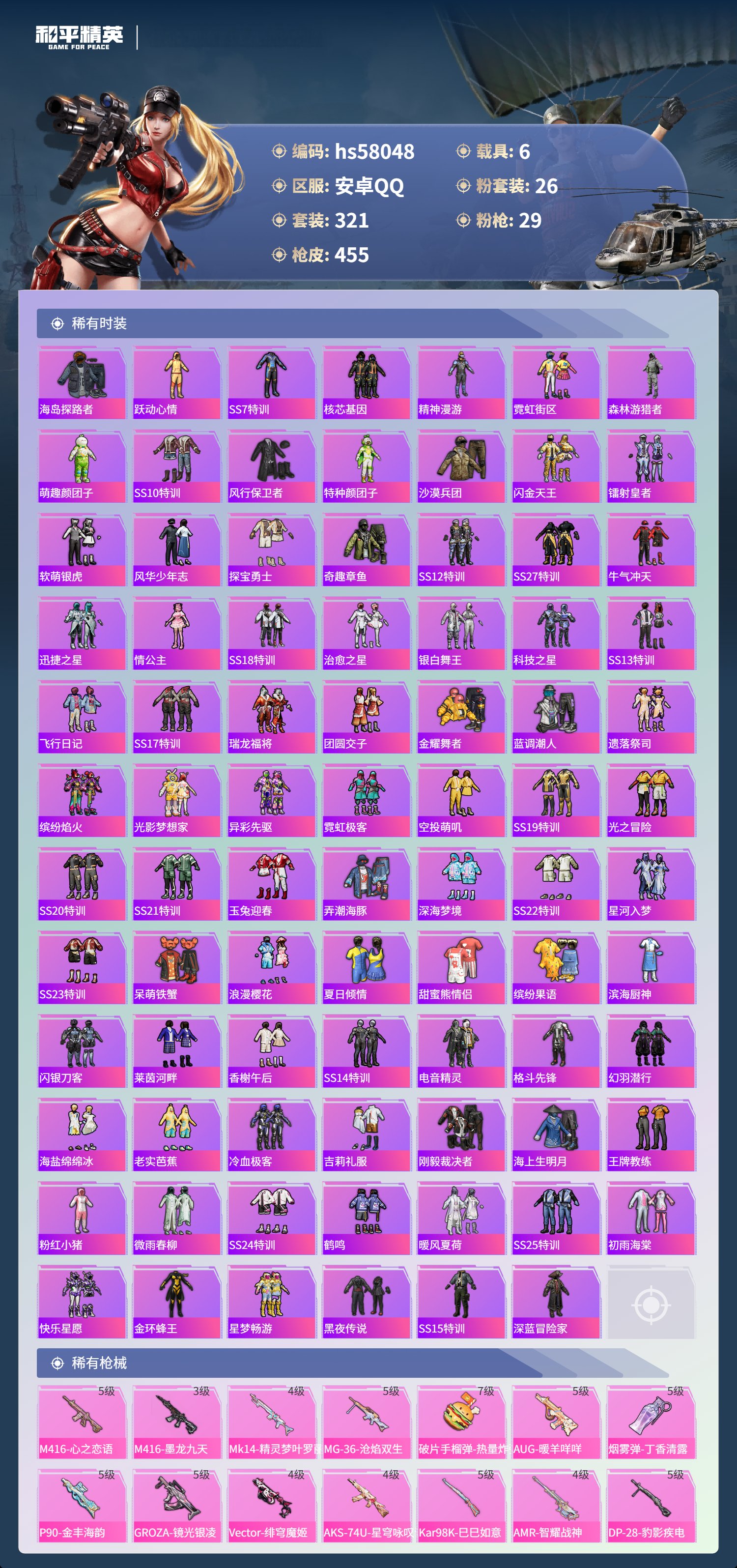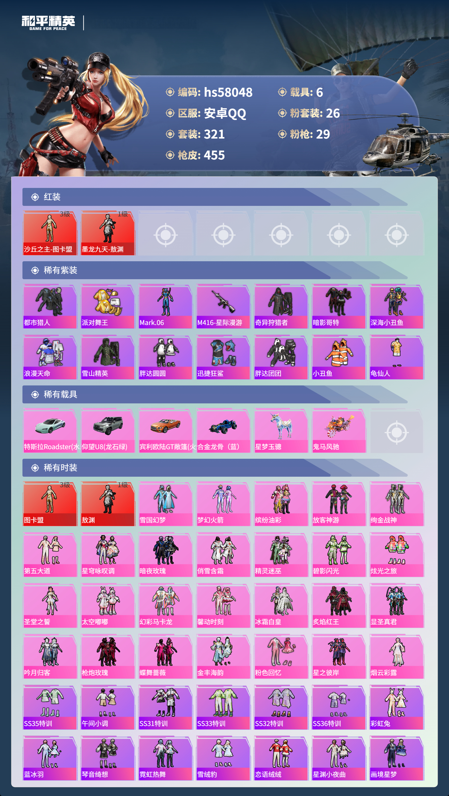 hs58048 安卓手q-29王牌印记-有战神框-2红装-26粉装-29特效呛-6载具-热力值-321套装-455呛皮-9卓越印记-6传奇印记【2红装】沙丘之主-图卡盟/3级墨龙九天-敖渊/1级【26粉装】套装-蝶舞蔷薇套装-太空嘟嘟套装-第五大道套装-精灵迷巫套装-粉色回忆套装-星穹咏叹调套装-吟月归客套装-放客神游套装-馨动时刻角色-烟云彩露套装-雪国幻