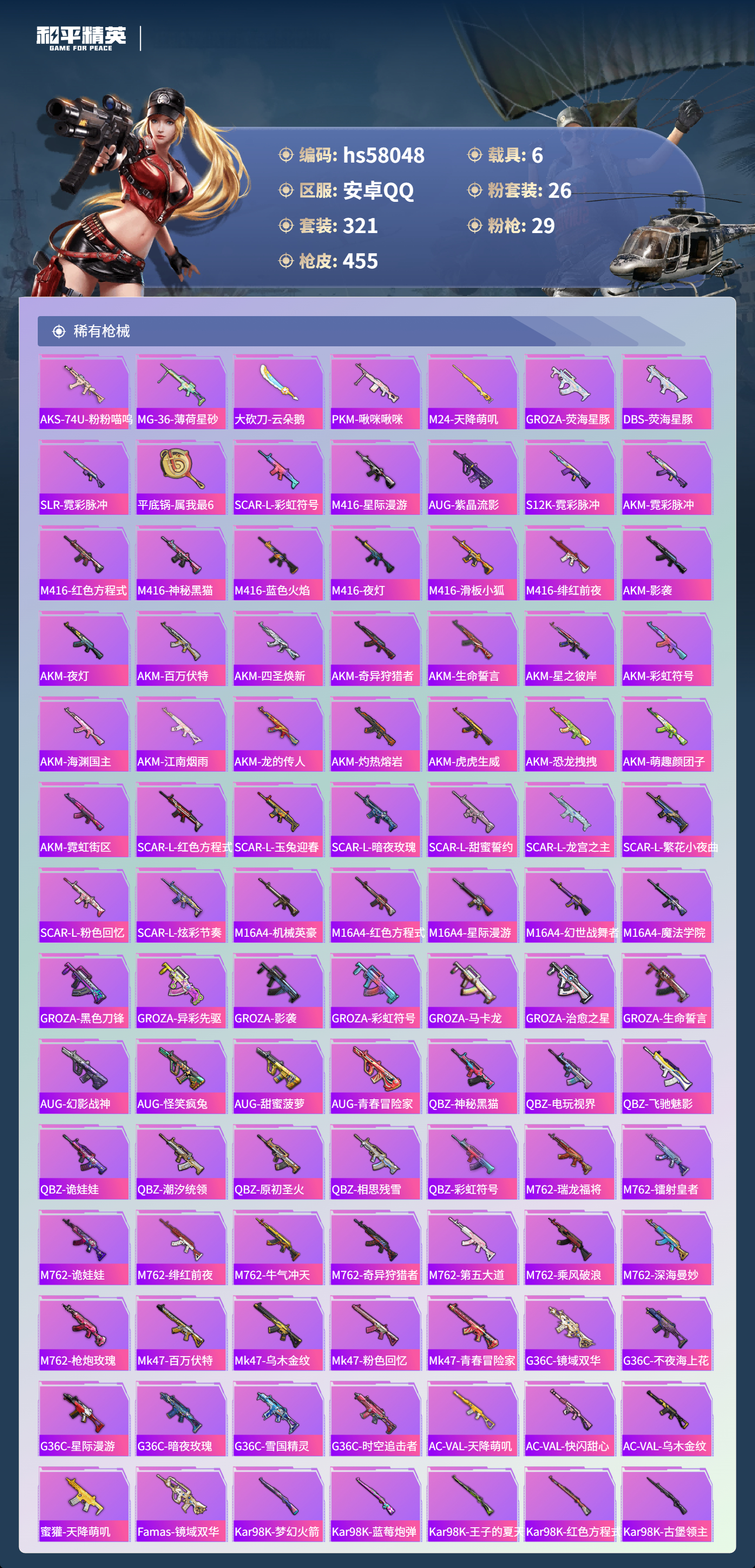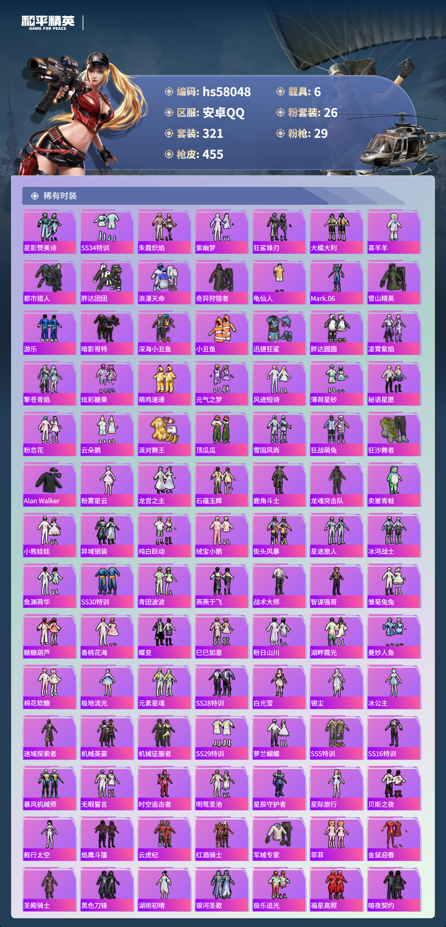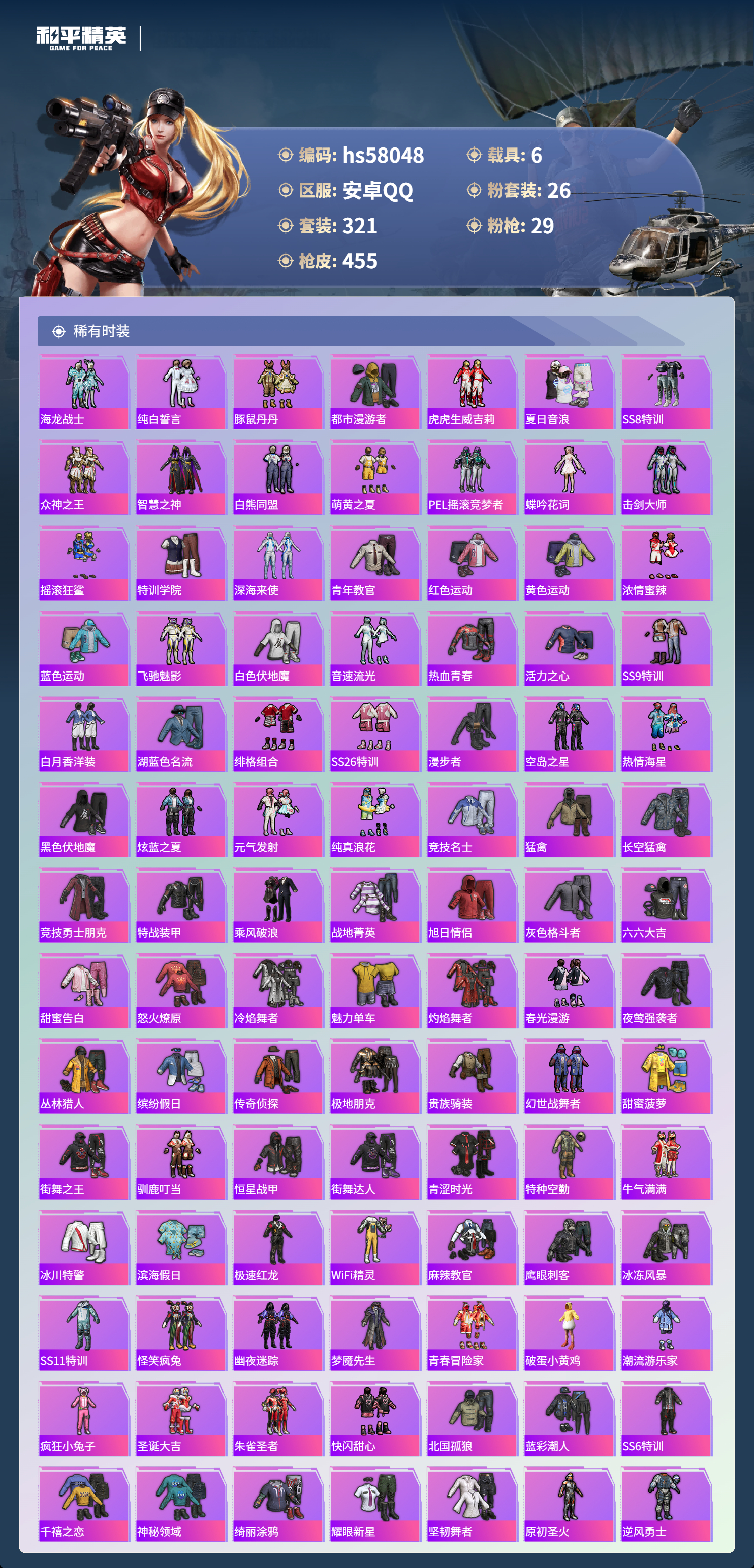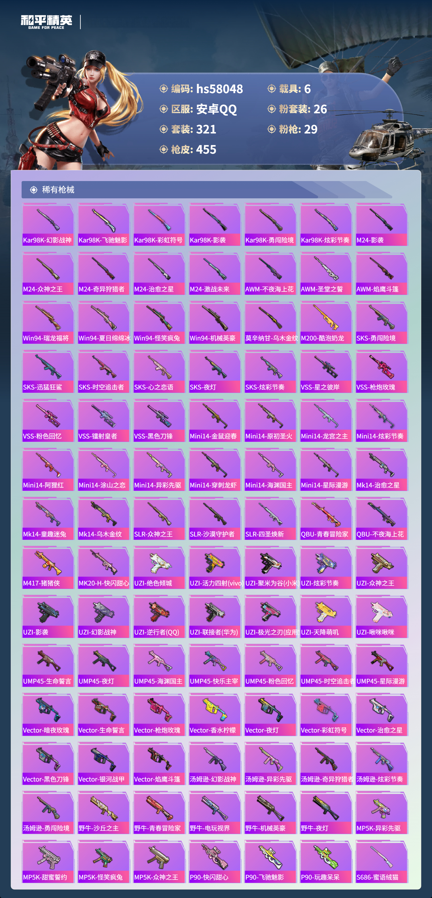 hs58048 安卓手q-29王牌印记-有战神框-2红装-26粉装-29特效呛-6载具-热力值-321套装-455呛皮-9卓越印记-6传奇印记【2红装】沙丘之主-图卡盟/3级墨龙九天-敖渊/1级【26粉装】套装-蝶舞蔷薇套装-太空嘟嘟套装-第五大道套装-精灵迷巫套装-粉色回忆套装-星穹咏叹调套装-吟月归客套装-放客神游套装-馨动时刻角色-烟云彩露套装-雪国幻