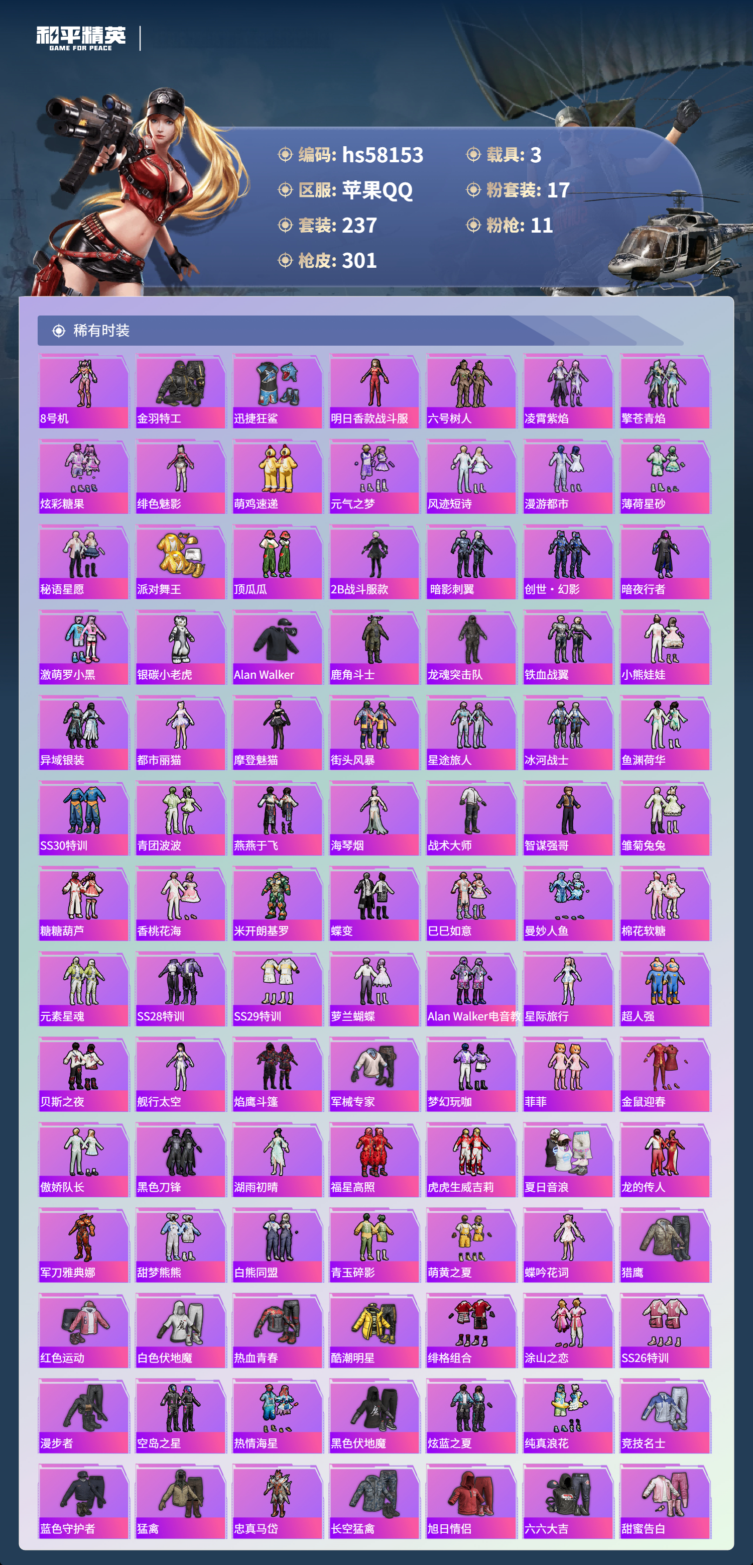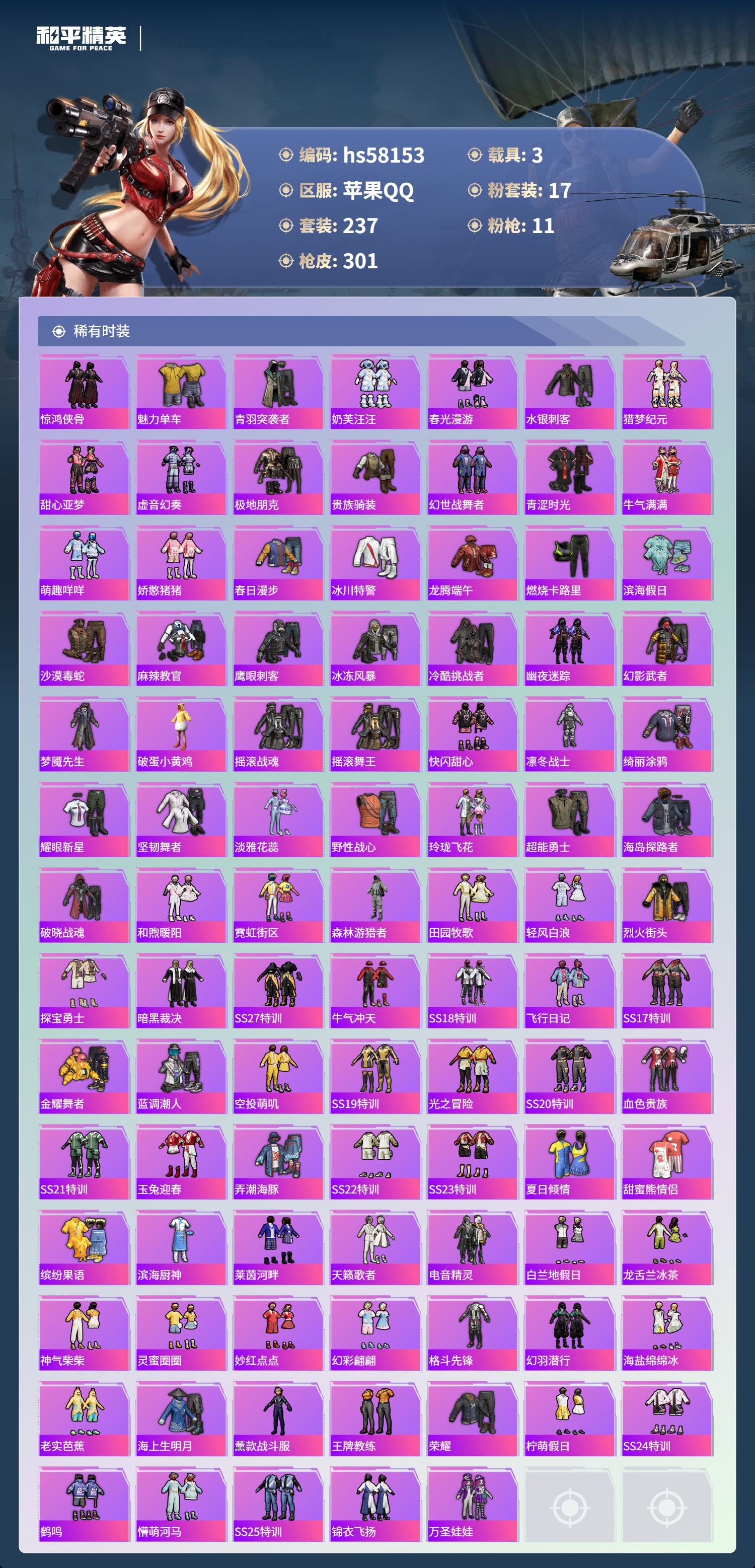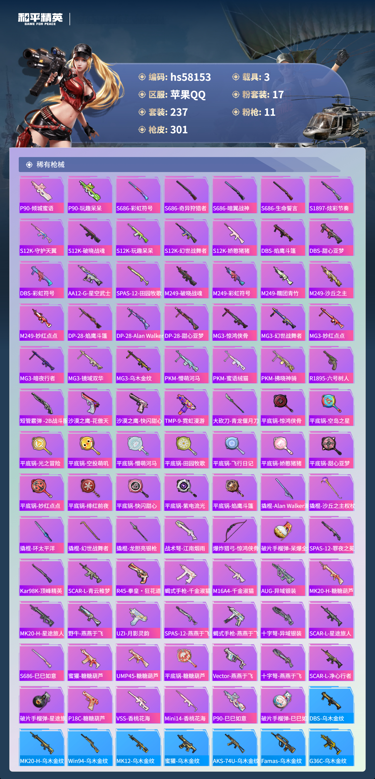 hs58153 苹果手q-20王牌印记-3红装-17粉装-11特效呛-3载具-热力值-237套装-301呛皮-11卓越印记-9传奇印记【3红装】魔童闹海-哪吒/1级沙丘之主-图卡盟/4级镜域双华-欧若拉/1级【17粉装】套装-未来战士套装-怪诞乔克套装-放客神游套装-甜梦小狐角色-猩猩队长角色-紫钛骑兵套装-天禅智恒角色-初号机款机体服套装-极限特训套装-仲夏