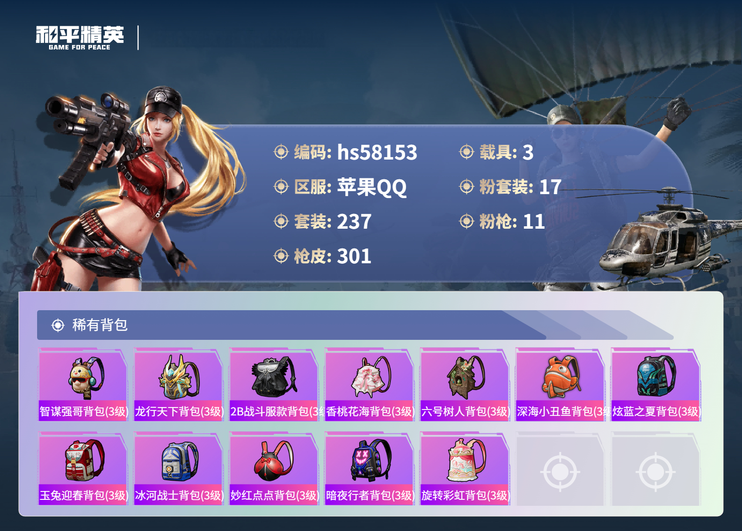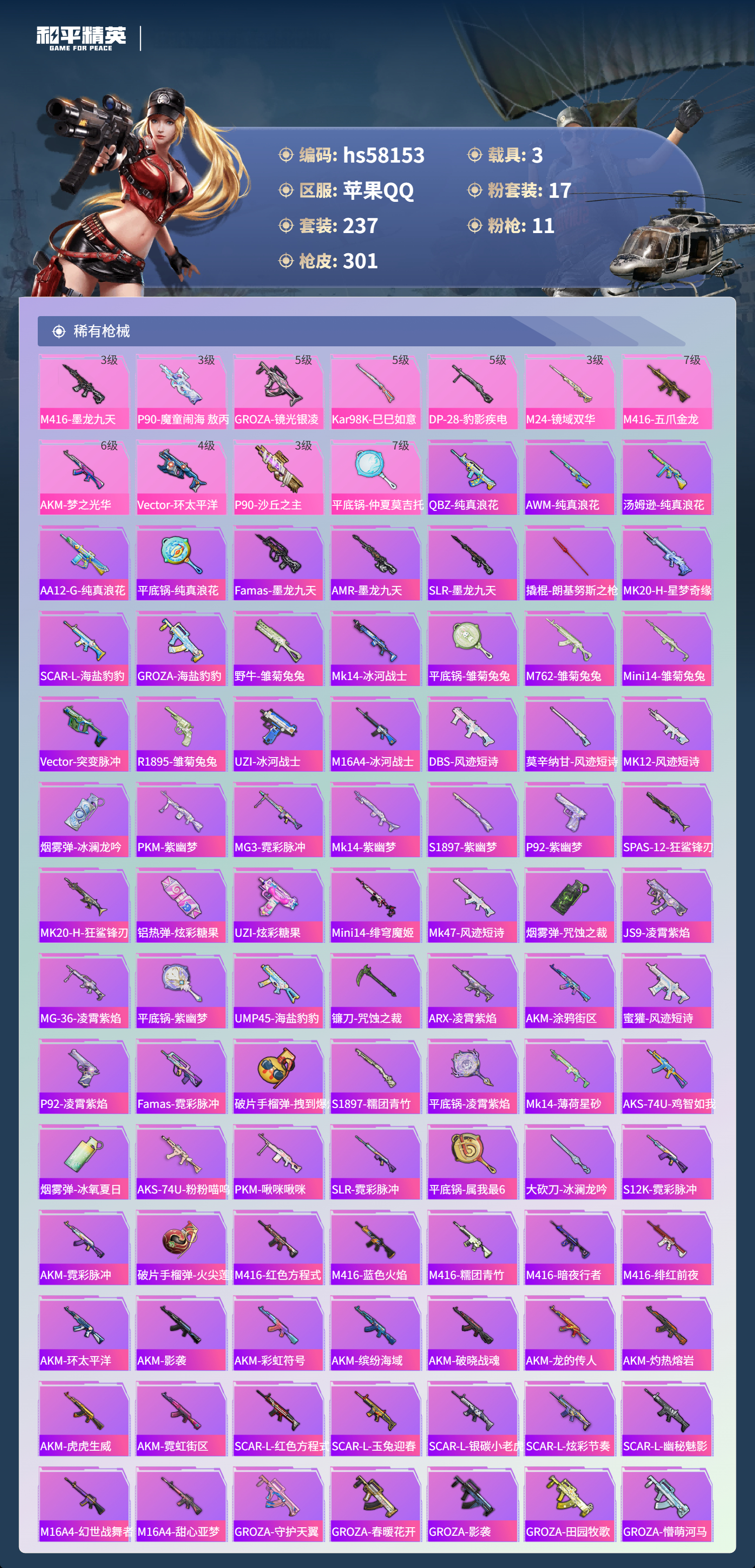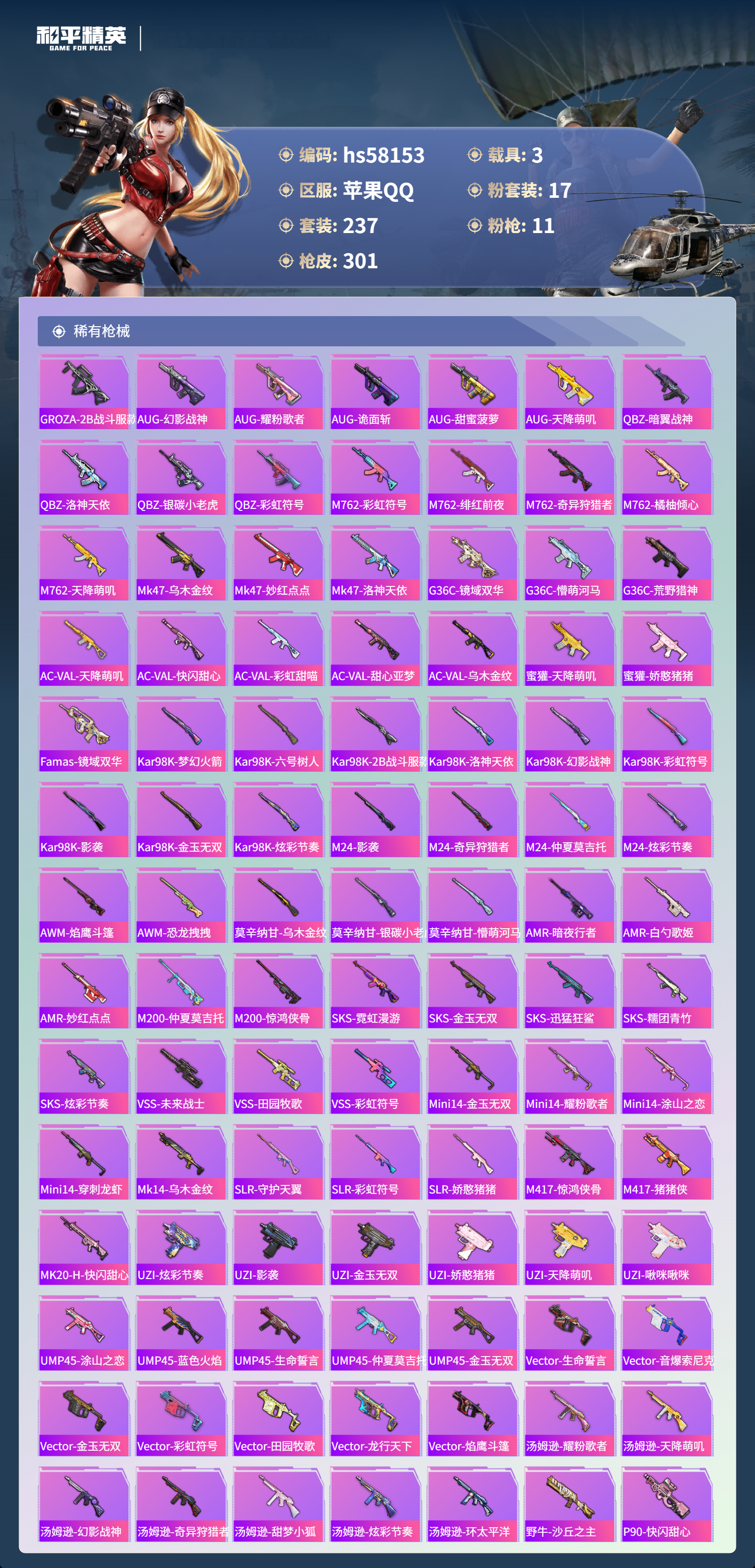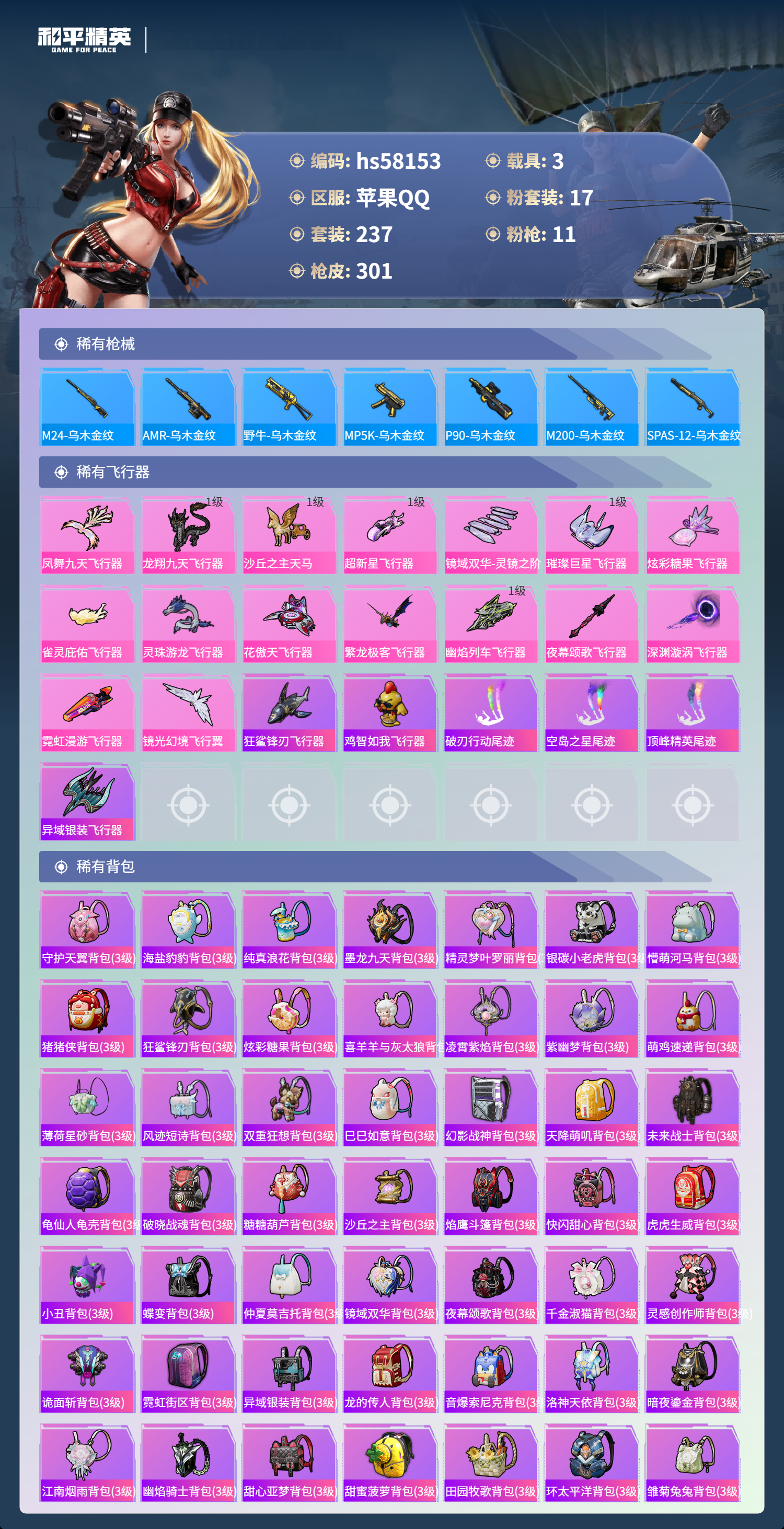 hs58153 苹果手q-20王牌印记-3红装-17粉装-11特效呛-3载具-热力值-237套装-301呛皮-11卓越印记-9传奇印记【3红装】魔童闹海-哪吒/1级沙丘之主-图卡盟/4级镜域双华-欧若拉/1级【17粉装】套装-未来战士套装-怪诞乔克套装-放客神游套装-甜梦小狐角色-猩猩队长角色-紫钛骑兵套装-天禅智恒角色-初号机款机体服套装-极限特训套装-仲夏