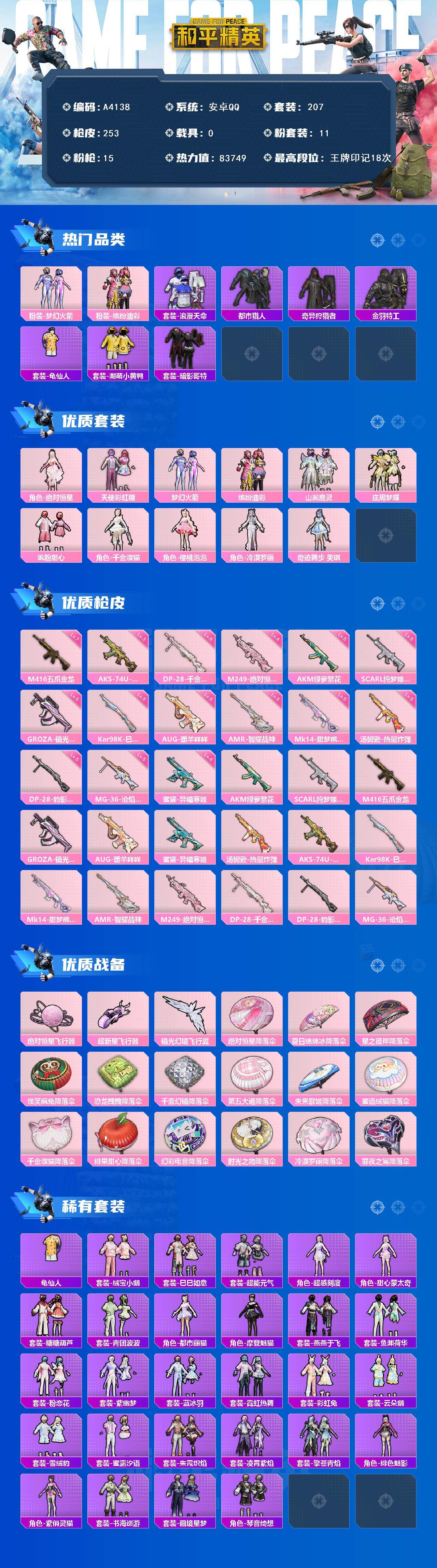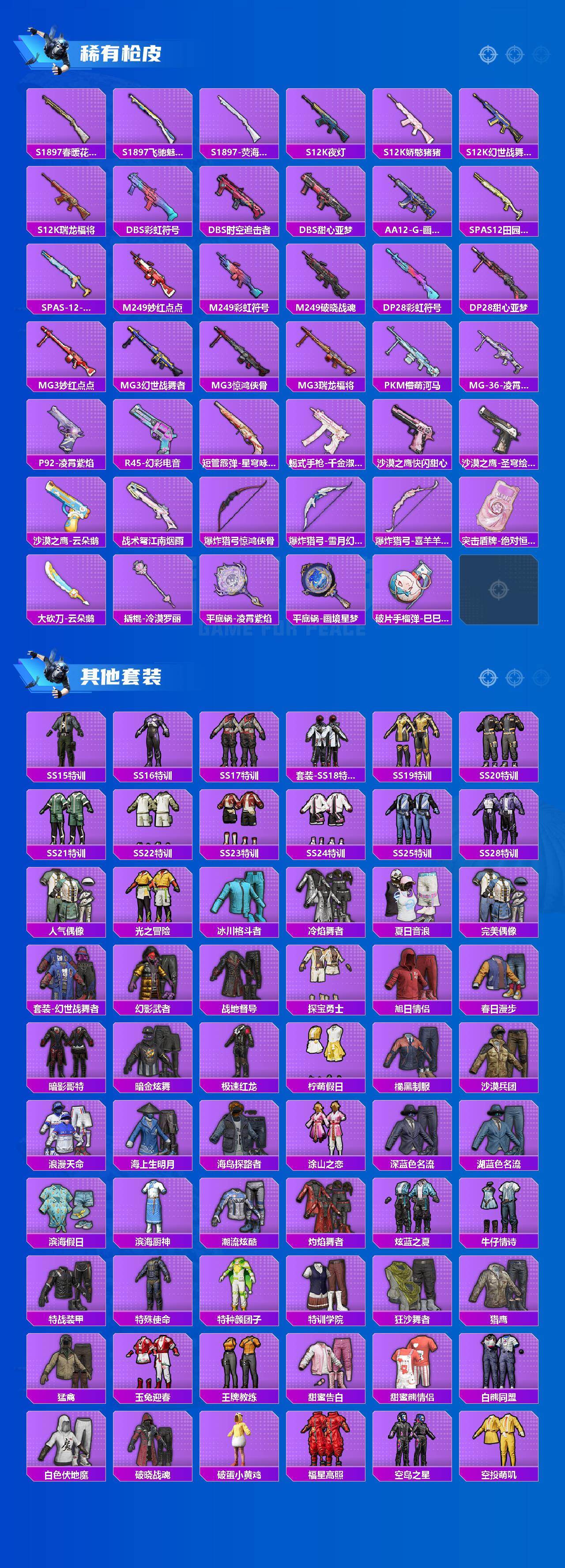 [15881879]安卓【素材号/梦幻火箭/缤纷油彩/都市猎人/暗影哥特】 手q-11粉装-15特效呛-0载具-4粉色飞行器-83749热力值-18王牌印记-207套装-253呛皮 【热门品类】:粉装-梦幻火箭,粉装-缤纷油彩,套装-浪漫天命,套装-都市猎人,套装-奇异狩猎者,套装-金羽特工,套装-龟仙人,套装-潮萌小黄鸭,套装-暗影哥特 【粉色套装】:角色-绝对恒星,粉装-天使彩虹糖,粉装-梦幻火箭,粉装-缤纷油彩,粉装-山涧鹿灵,粉装-庄周梦蝶,粉装-飒粉甜心,角色-千金淑猫,角色-樱桃泡泡,角色-冷漠罗丽,角色-奇迹舞步 美琪 【粉色呛皮等级】:akm-绿萝繁花五级,scar-l-纯梦嫁纱五级,m416-五爪金龙七级,groza-镜光银凌五级,aug-暖羊咩咩五级,蜜獾-异瞳寒姬四级,汤姆逊-热量炸弹五级,aks-74u-森灵之息三级,kar98k-巳巳如意五级,mk14-甜梦熊击五级,amr-智耀战神五级,m249-绝对恒星四级,dp-28-千金淑猫六级,dp-28-豹影疾电五级,mg-36-沧焰双生五级 【粉色呛皮】:akm-绿萝繁花,scar-l-纯梦嫁纱,m416-五爪金龙,groza-镜光银凌,aug-暖羊咩咩,蜜獾-异瞳寒姬,汤姆逊-热量炸弹,aks-74u-森灵之息,kar98k-巳巳如意,mk14-甜梦熊击,amr-智耀战神,m249-绝对恒星,dp-28-千金淑猫,dp-28-豹影疾电,mg-36-沧焰双生 【粉色飞行器】:绝对恒星飞行器,超新星飞行器,镜光幻境飞行翼 【粉色降落伞】:绝对恒星降落伞,夏日绵绵冰降落伞,星之彼岸降落伞,怪笑疯兔降落伞,恐龙拽拽降落伞,千面幻镜降落伞,第五大道降落伞,未来歌姬降落伞,蜜语绒猫降落伞,千金淑猫降落伞,绯果甜心降落伞,幻彩电音降落伞,时光之吻降落伞,冷漠罗丽降落伞,炫彩糖果降落伞,罪夜之冕降落伞 【稀有套装】:套装-龟仙人,套装-绒宝小鹅,套装-巳巳如意,套装-超能元气,角色-超感刻度,角色-甜心蒙太奇,套装-雪国风尚,套装-糖糖葫芦,套装-青团波波,角色-都市丽猫,角色-摩登魅猫,套装-燕燕于飞,套装-鱼渊荷华,套装-粉恋花,套装-紫幽梦,套装-蓝冰羽,套装-霓虹热舞,套装-彩虹兔,套装-云朵鹅,套装-雪绒豹,套装-蜜露汐语,套装-朱霞炽焰,套装-凌霄紫焰,