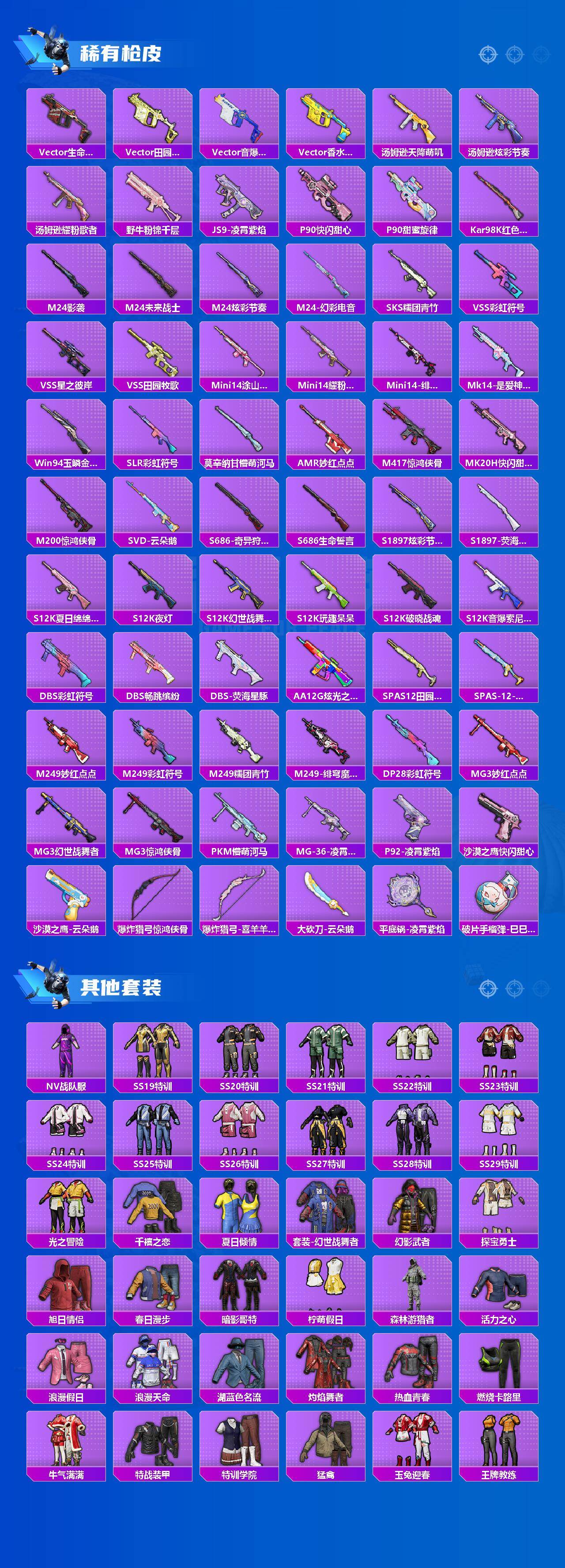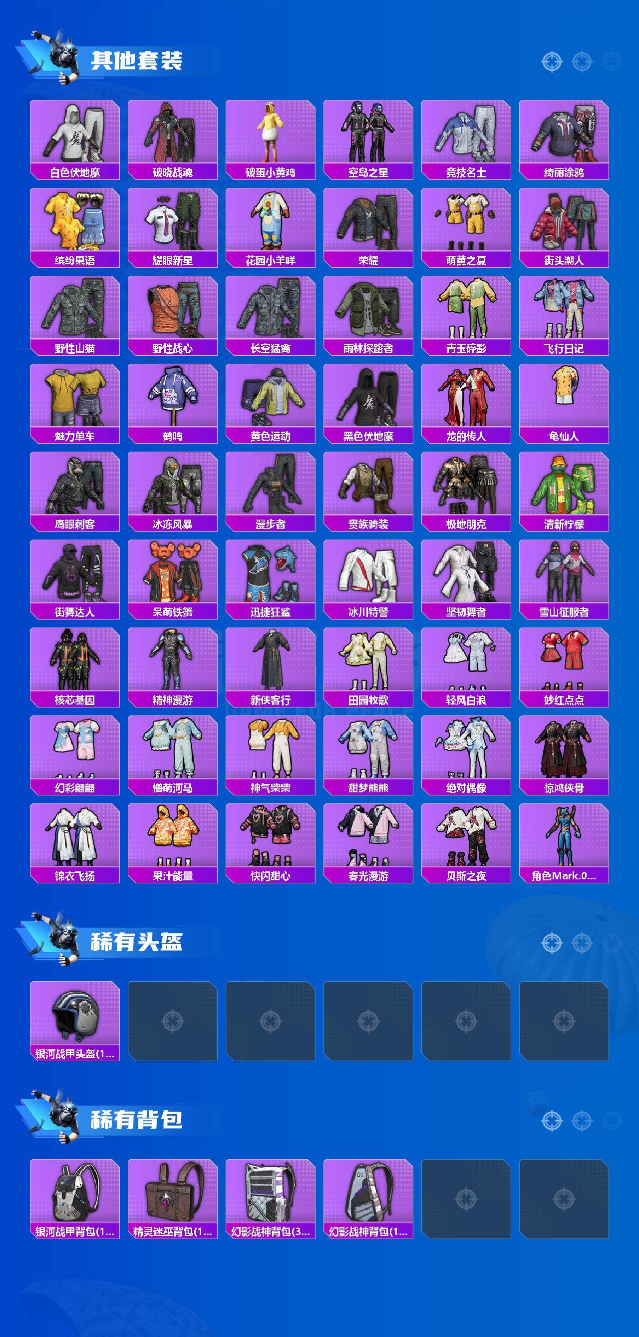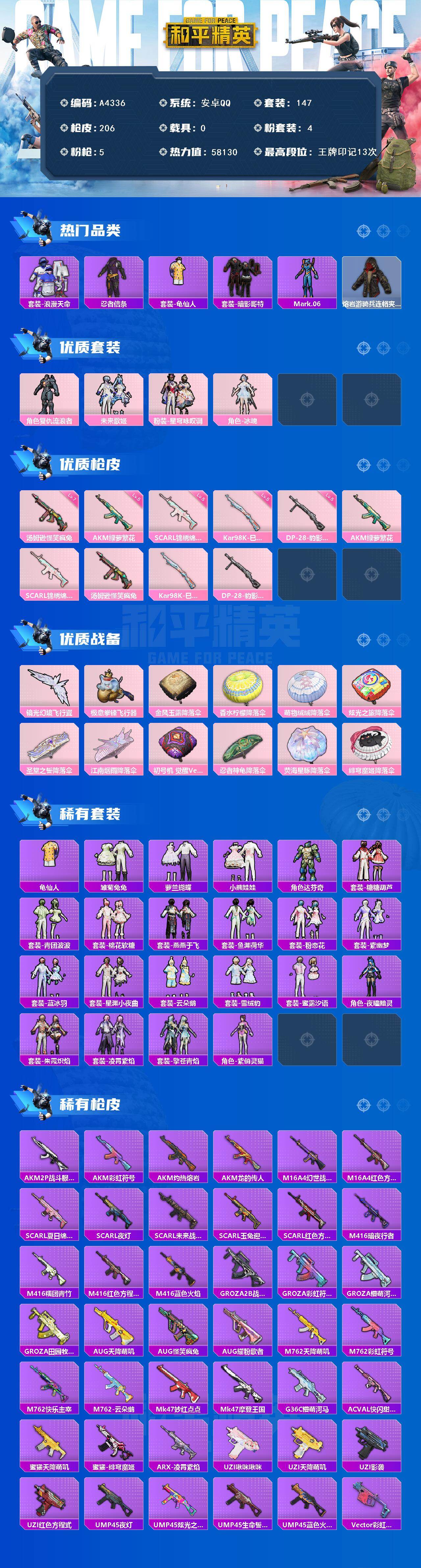 [15882797]安卓【小号/暗影哥特/蓝螳螂】 手q-4粉装-5特效呛-0载具-3粉色飞行器-58130热力值-13王牌印记-147套装-206呛皮 【热门品类】:套装-浪漫天命,套装-忍者信条,套装-龟仙人,套装-暗影哥特,角色-mark.06,熔岩游骑兵连帽夹克 【粉色套装】:角色-复仇流浪者,粉装-未来歌姬,粉装-星穹咏叹调,角色-冰魄 【粉色呛皮等级】:akm-绿萝繁花五级,scar-l-锦绣绵绵五级,汤姆逊-怪笑疯兔七级,kar98k-巳巳如意五级,dp-28-豹影疾电五级 【粉色呛皮】:akm-绿萝繁花,scar-l-锦绣绵绵,汤姆逊-怪笑疯兔,kar98k-巳巳如意,dp-28-豹影疾电 【粉色飞行器】:镜光幻境飞行翼,极意拳锋飞行器 【粉色降落伞】:金风玉露降落伞,香水柠檬降落伞,萌物绒绒降落伞,炫光之旅降落伞,圣堂之誓降落伞,江南烟雨降落伞,初号机 觉醒ver.降落伞,忍者神龟降落伞,荧海星豚降落伞,绯穹魔姬降落伞,炫彩糖果降落伞 【稀有套装】:套装-龟仙人,套装-雪国风尚,套装-炫彩糖果,套装-雏菊兔兔,套装-萝兰蝴蝶,套装-小熊娃娃,角色-达芬奇,套装-糖糖葫芦,套装-青团波波,套装-棉花软糖,套装-燕燕于飞,套装-鱼渊荷华,套装-粉恋花,套装-紫幽梦,套装-蓝冰羽,套装-星渊小夜曲,套装-云朵鹅,套装-雪绒豹,套装-蜜露汐语,角色-夜瞳黯灵,套装-朱霞炽焰,套装-凌霄紫焰,套装-擎苍青焰,角色-紫俏灵猫 【稀有呛皮】:aug-冰晶雪宝,akm-2p战斗服款,akm-彩虹符号,akm-灼热熔岩,akm-龙的传人,m16a4-幻世战舞者,m16a4-红色方程式,scar-l-夏日绵绵冰,scar-l-夜灯,scar-l-未来战士,scar-l-玉兔迎春,scar-l-红色方程式,m416-暗夜行者,m416-糯团青竹,m416-红色方程式,m416-蓝色火焰,groza-2b战斗服款,groza-彩虹符号,groza-懵萌河马,groza-田园牧歌,aug-天降萌叽,aug-怪笑疯兔,aug-耀粉歌者,m762-天降萌叽,m762-彩虹符号,m762-快乐主宰,m762-云朵鹅,mk47-妙红点点,mk47-摩登王国,g36c-懵萌河马,ac-val-快闪甜心,蜜獾-天降萌叽,蜜獾-绯穹魔姬,arx-凌霄紫焰,uzi-啾咪啾咪,uzi-天降
