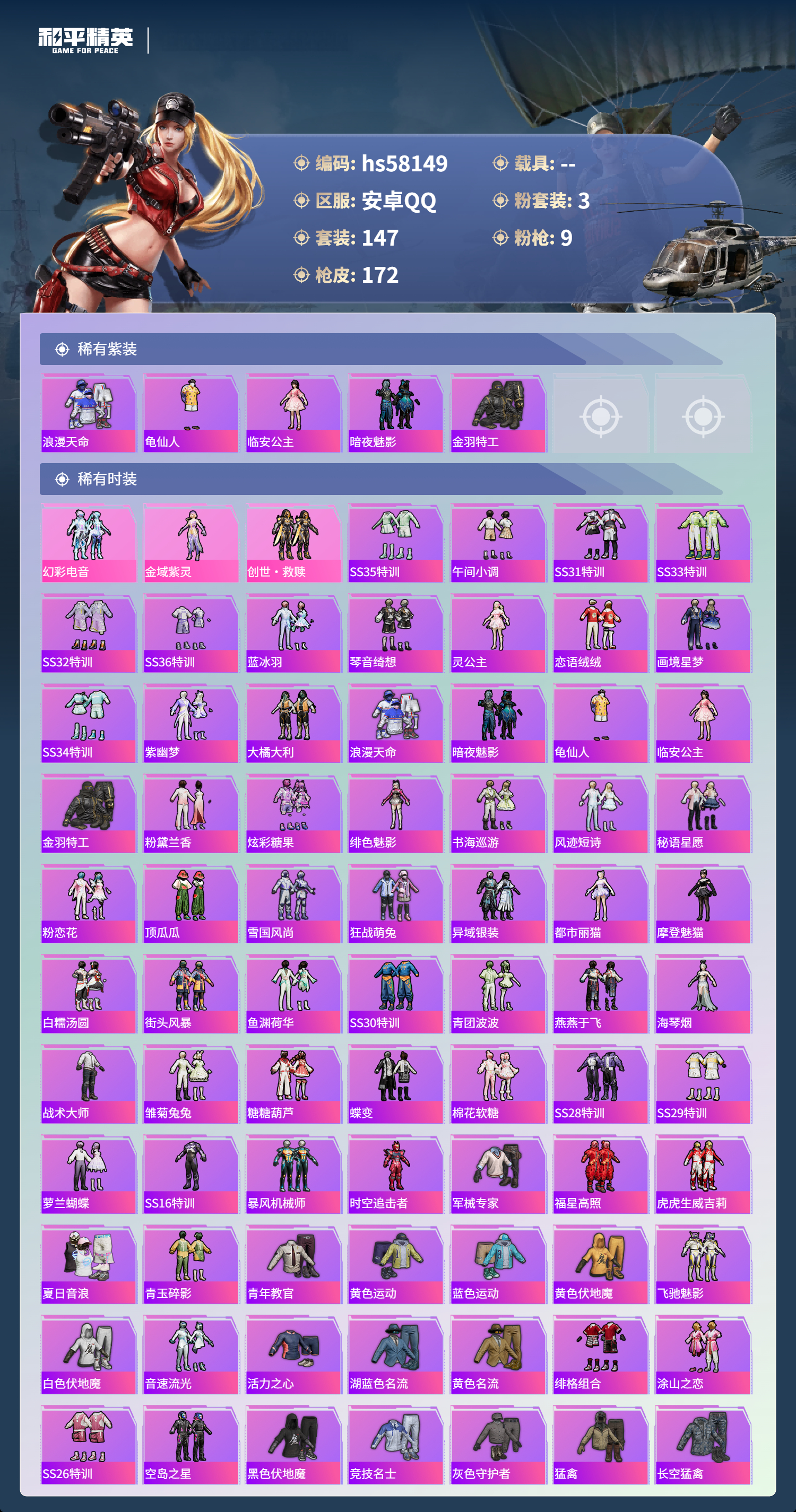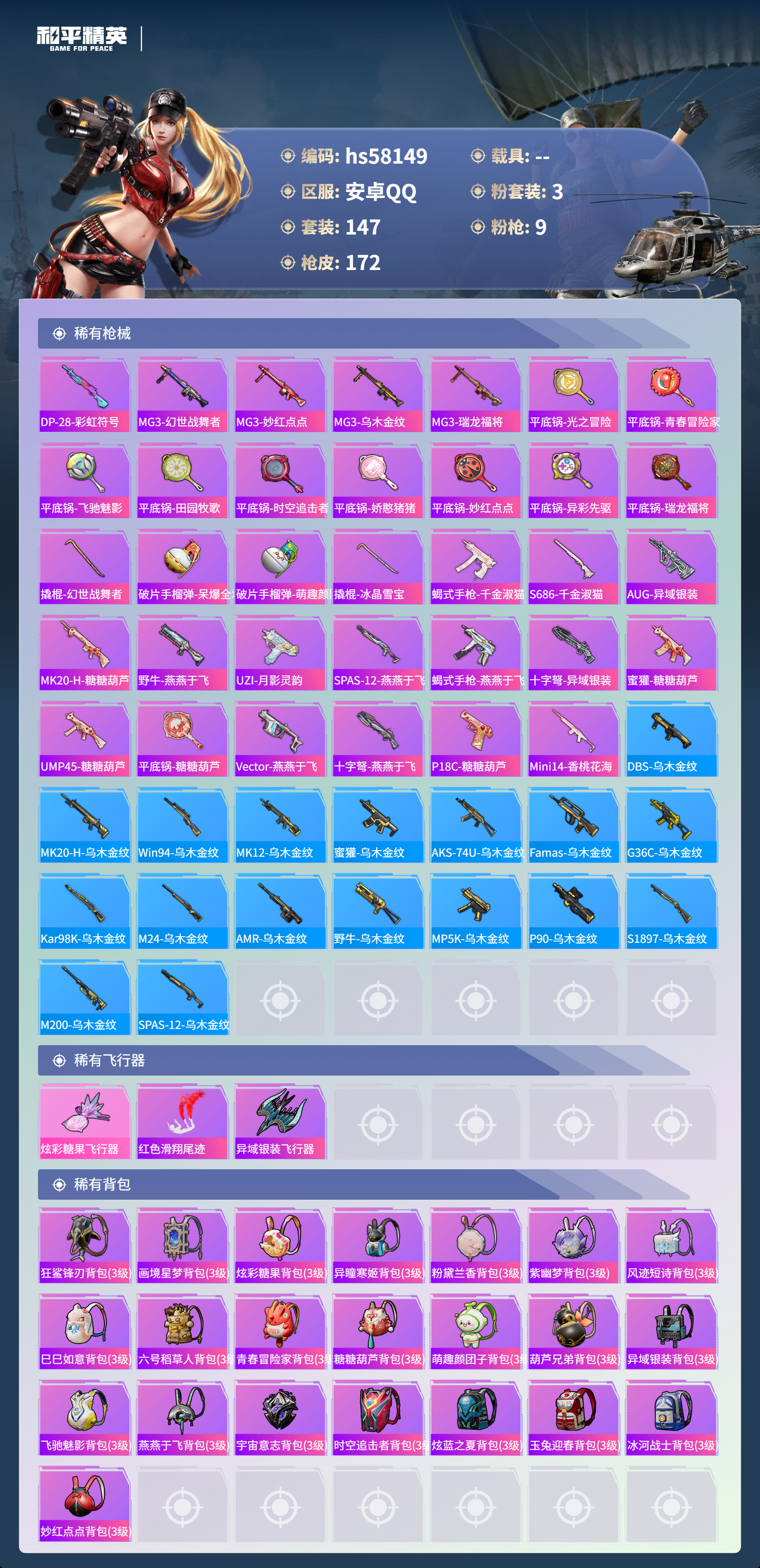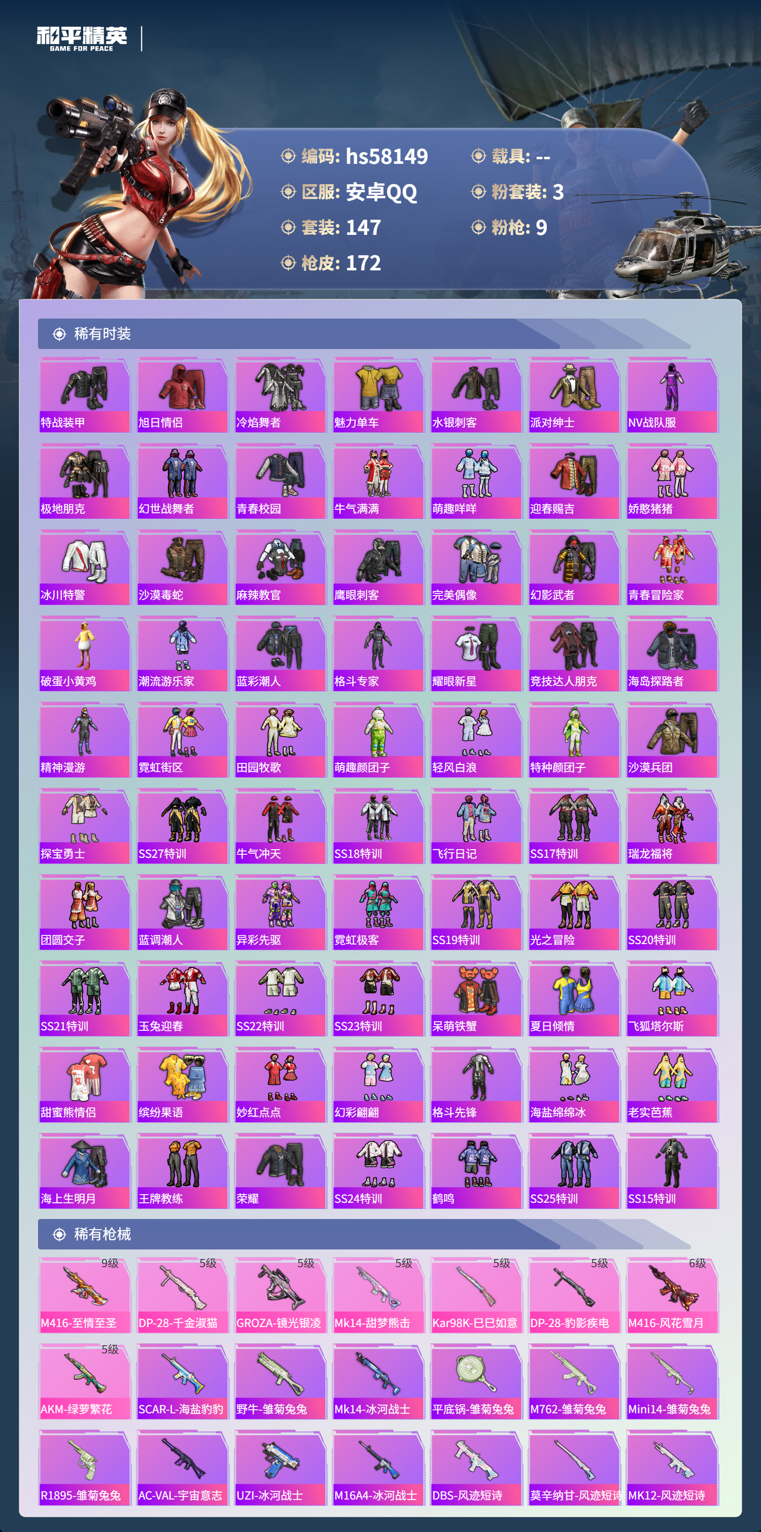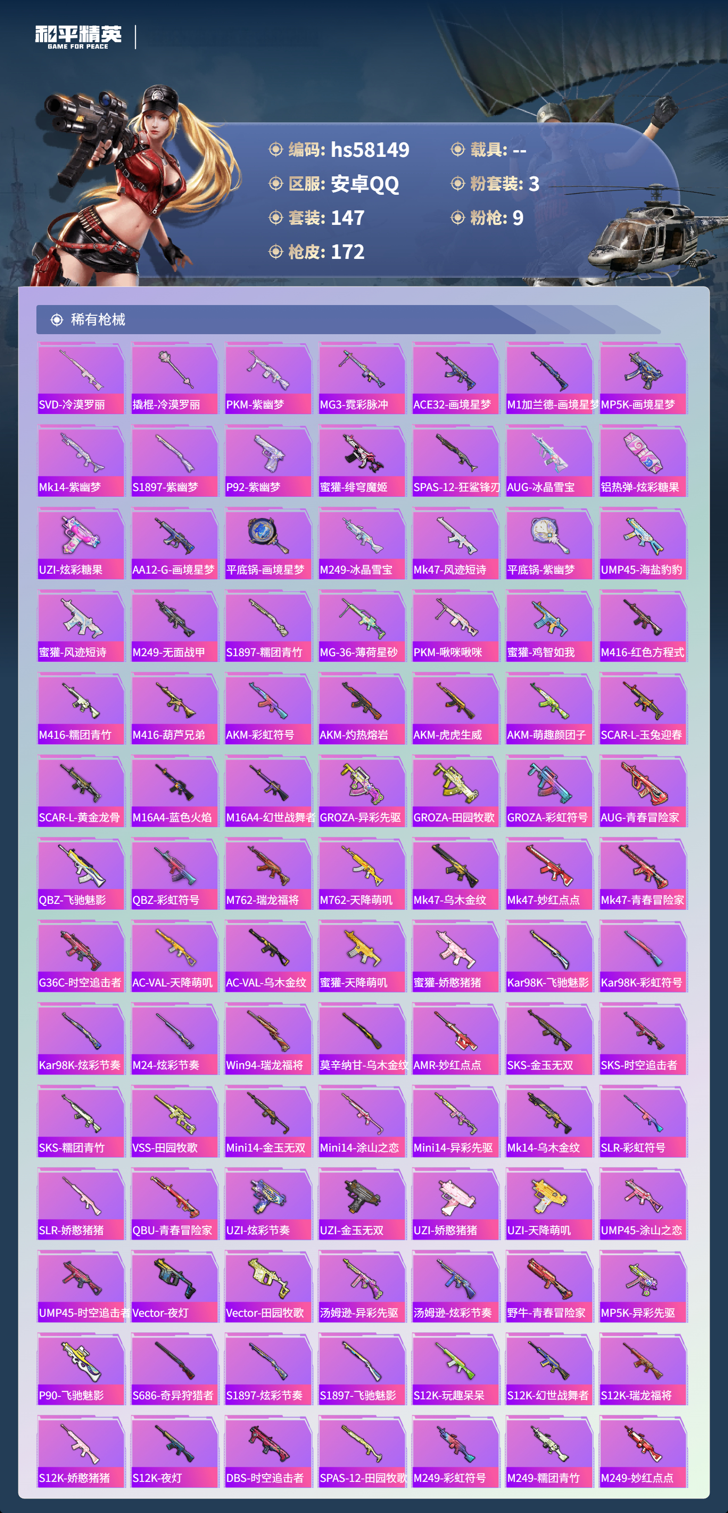 hs58149 安卓手q-21王牌印记-有战神框-3粉装-9特效呛-58447热力值-147套装-172呛皮【3粉装】套装-创世·救赎角色-金域紫灵套装-幻彩电音【9特效呛】dp-28-豹影疾电/5级燃烧瓶-薄荷可可/7级kar98k-巳巳如意/5级dp-28-千金淑猫/5级groza-镜光银凌/5级mk14-甜梦熊击/5级m416-至情至圣/9级m416-风花雪月/6级a