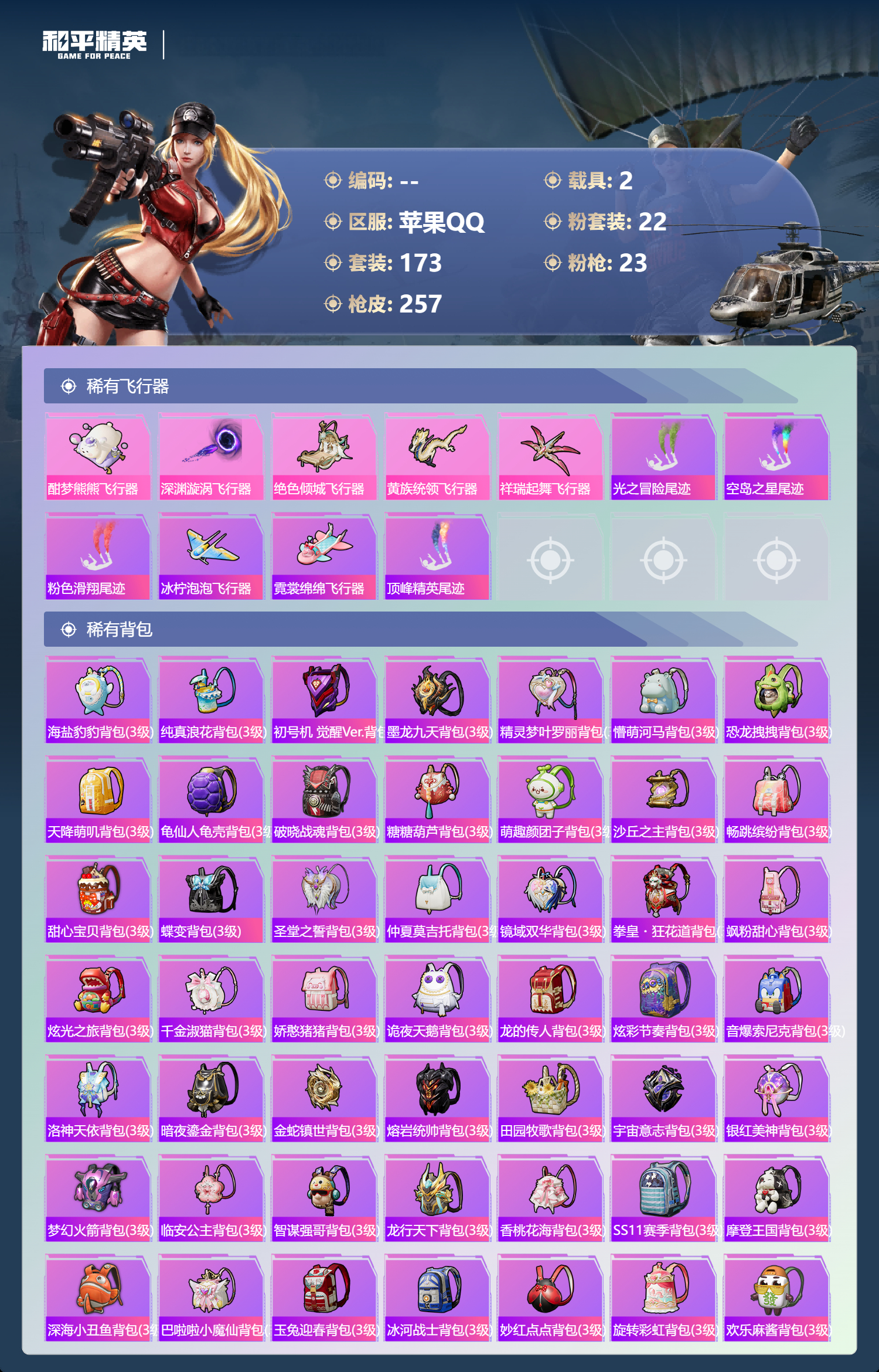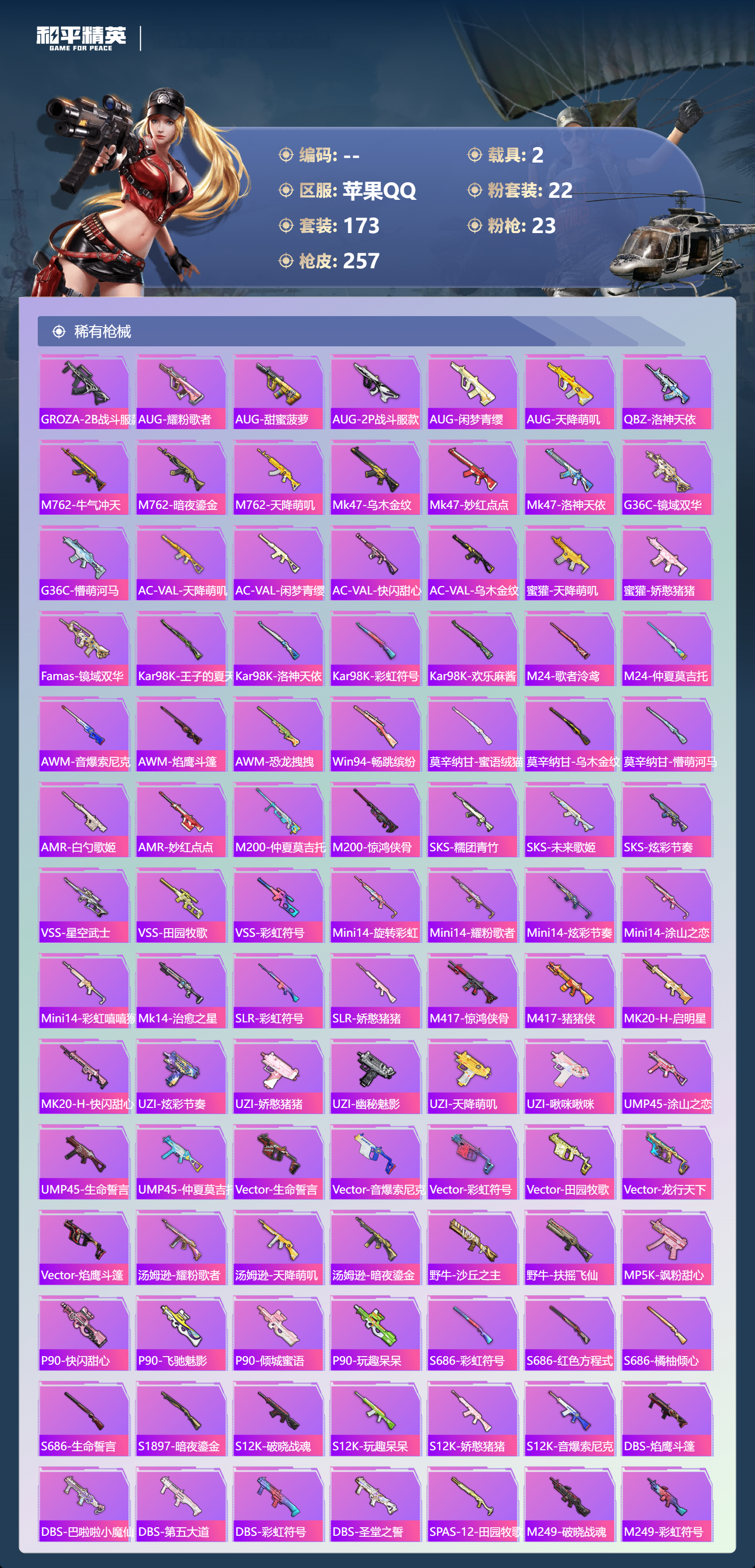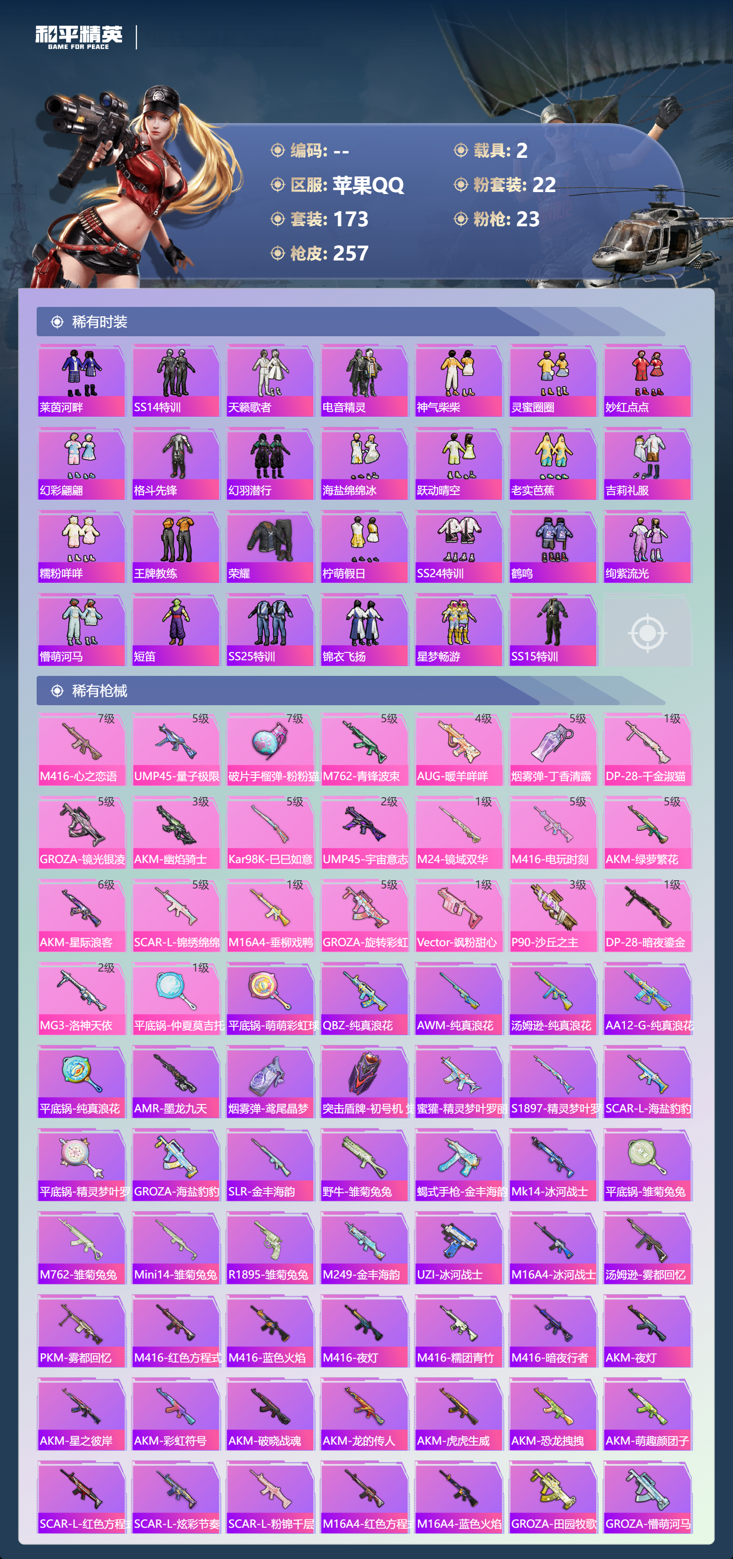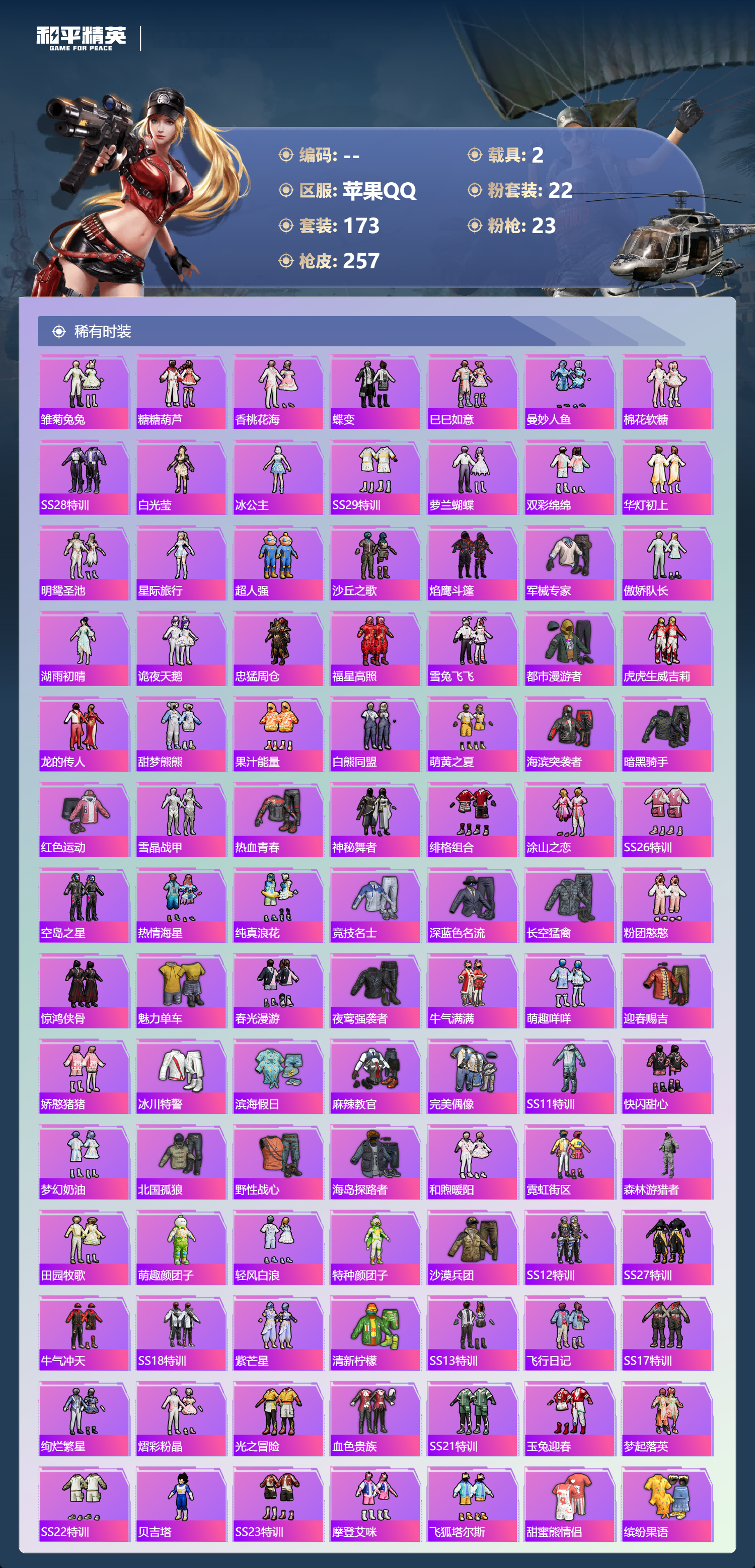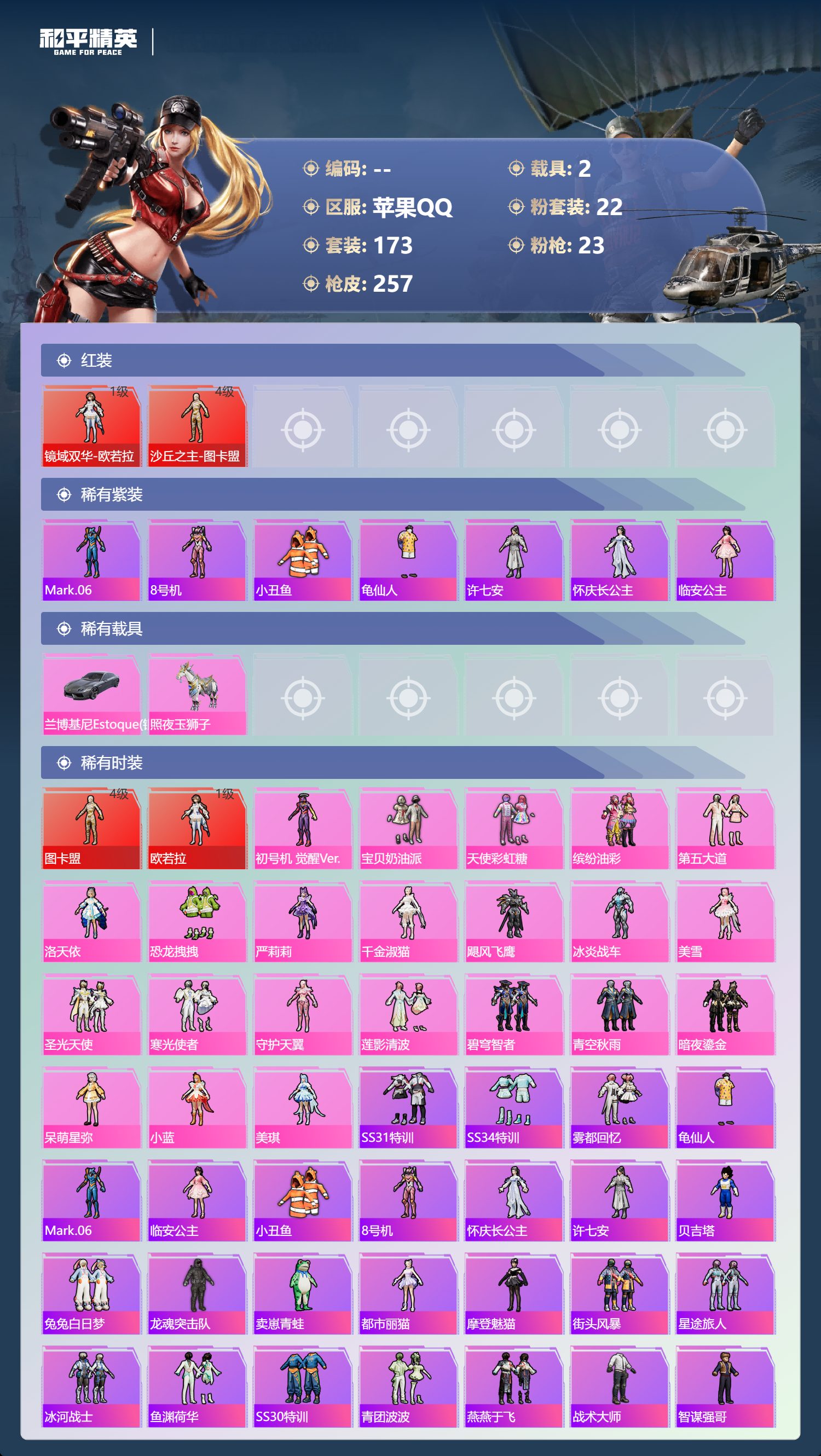 2载具-173套装-257呛皮-苹果手q-8王牌印记-2红装-22粉装-23特效呛-2载具-热力值-173套装-257呛皮【2红装】镜域双华-欧若拉/1级沙丘之主-图卡盟/4级【22粉装】套装-碧穹智者套装-缤纷油彩套装-恐龙拽拽角色-严莉莉角色-初号机 觉醒ver.角色-美雪角色-守护天翼套装-第五大道套装-寒光使者套装-圣光天使套装-飓风飞鹰套装-暗夜鎏金套装-青空秋雨套装-宝贝奶油派