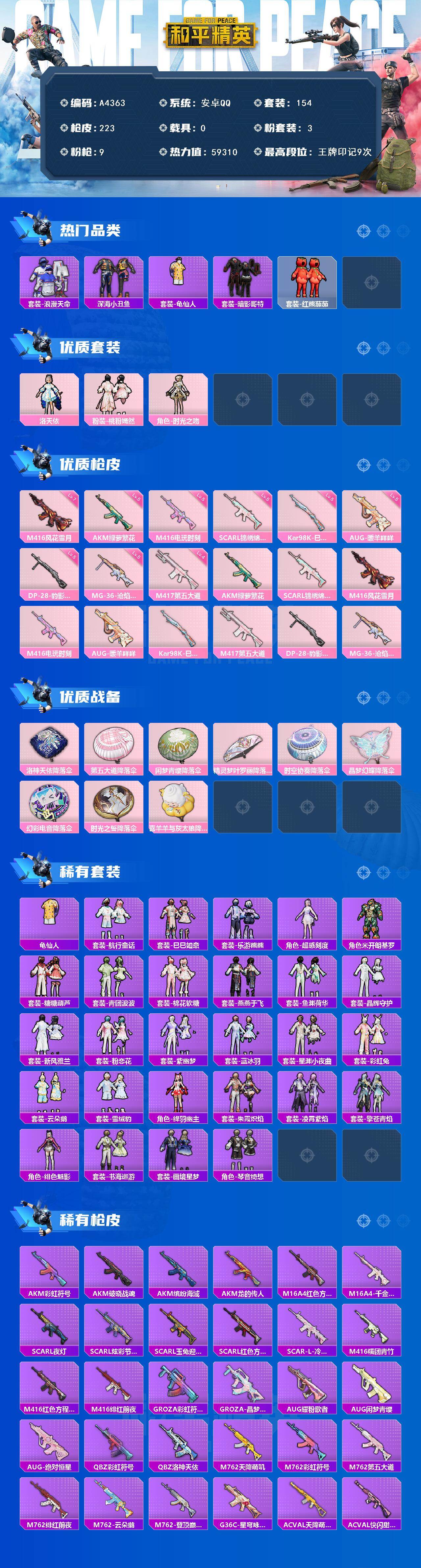 [15885958]安卓【小号 套装-暗影哥特/套装-浪漫天命/akm-绿萝繁花五级/scar-l-锦绣绵绵五级/m416-风花雪月七级/m416-电玩时刻五级】 手q-3粉装-9特效呛-0载具-1粉色飞行器-59310热力值-9王牌印记-154套装-223呛皮 【热门品类】:套装-浪漫天命,套装-深海小丑鱼,套装-龟仙人,套装-暗影哥特,套装-红熊茄茄 【粉色套装】:角色-洛天依,粉装-桃粉嫣然,角色-时光之吻 【粉色呛皮等级】:akm-绿萝繁花五级,scar-l-锦绣绵绵五级,m416-风花雪月七级,m416-电玩时刻五级,aug-暖羊咩咩五级,kar98k-巳巳如意五级,m417-第五大道四级,dp-28-豹影疾电五级,mg-36-沧焰双生五级 【粉色呛皮】:akm-绿萝繁花,scar-l-锦绣绵绵,m416-风花雪月,m416-电玩时刻,aug-暖羊咩咩,kar98k-巳巳如意,m417-第五大道,dp-28-豹影疾电,mg-36-沧焰双生 【粉色降落伞】:洛神天依降落伞,第五大道降落伞,闲梦青缨降落伞,精灵梦叶罗丽降落伞,时空协奏降落伞,晶梦幻蝶降落伞,幻彩电音降落伞,时光之誓降落伞,喜羊羊与灰太狼降落伞,炫彩糖果降落伞 【稀有套装】:套装-龟仙人,套装-航行童话,套装-巳巳如意,套装-乐游熊熊,角色-超感刻度,套装-雪国风尚,角色-米开朗基罗,套装-糖糖葫芦,套装-青团波波,套装-棉花软糖,套装-燕燕于飞,套装-鱼渊荷华,套装-晶辉守护,套装-新风雅兰,套装-粉恋花,套装-紫幽梦,套装-蓝冰羽,套装-星渊小夜曲,套装-彩虹兔,套装-云朵鹅,套装-雪绒豹,角色-绛羽幽主,套装-朱霞炽焰,套装-凌霄紫焰,套装-擎苍青焰,角色-绯色魅影,套装-书海巡游,套装-画境星梦,套装-琴音绮想,套装-炫彩糖果 【稀有呛皮】:aug-冰晶雪宝,akm-彩虹符号,akm-破晓战魂,akm-缤纷海域,akm-龙的传人,m16a4-红色方程式,m16a4-千金淑猫,scar-l-夜灯,scar-l-炫彩节奏,scar-l-玉兔迎春,scar-l-红色方程式,scar-l-冷漠罗丽,m416-糯团青竹,m416-红色方程式,m416-绯红前夜,groza-彩虹符号,groza-晶梦幻蝶,aug-耀粉歌者,aug-闲梦青缨,aug-绝对恒星,q