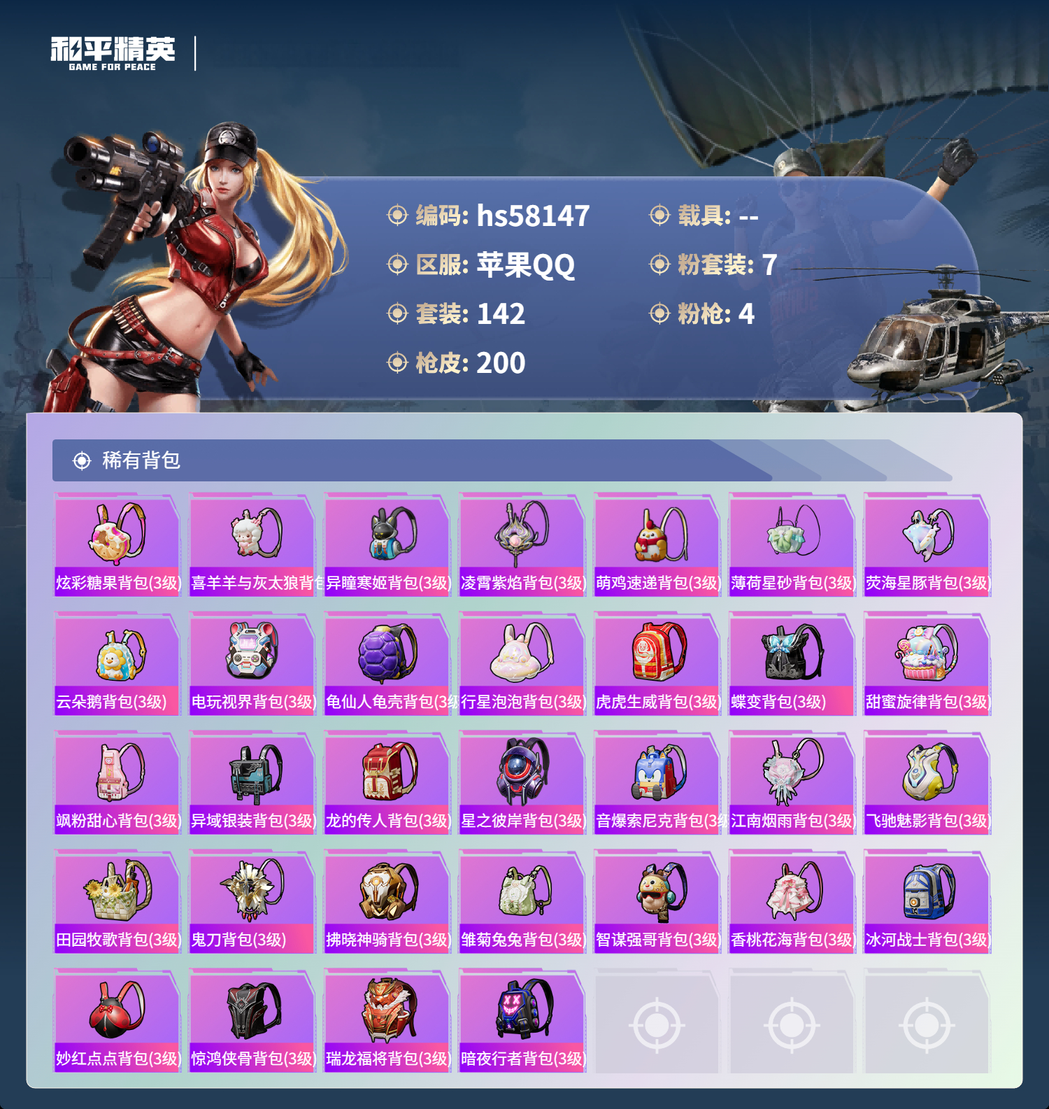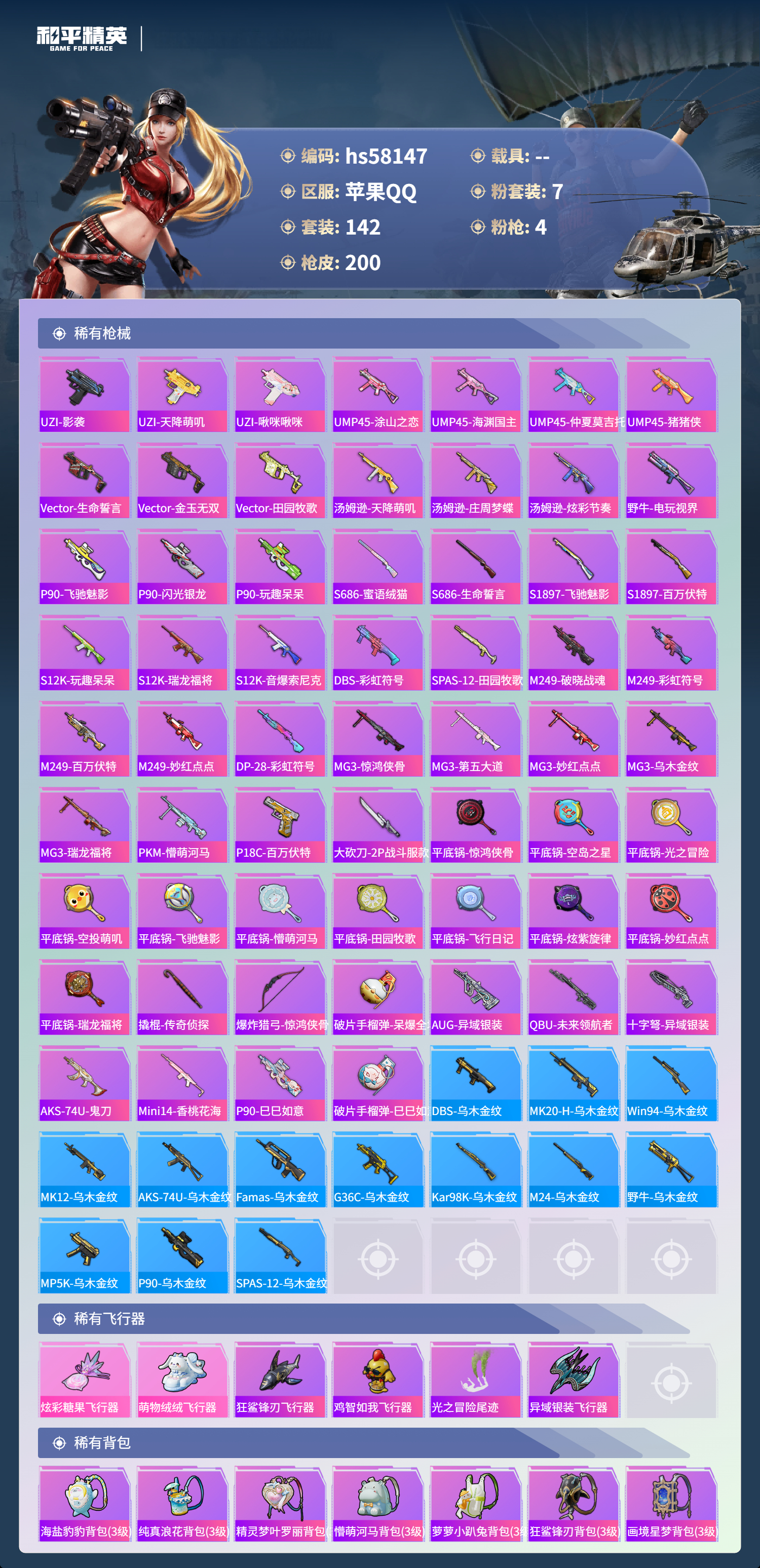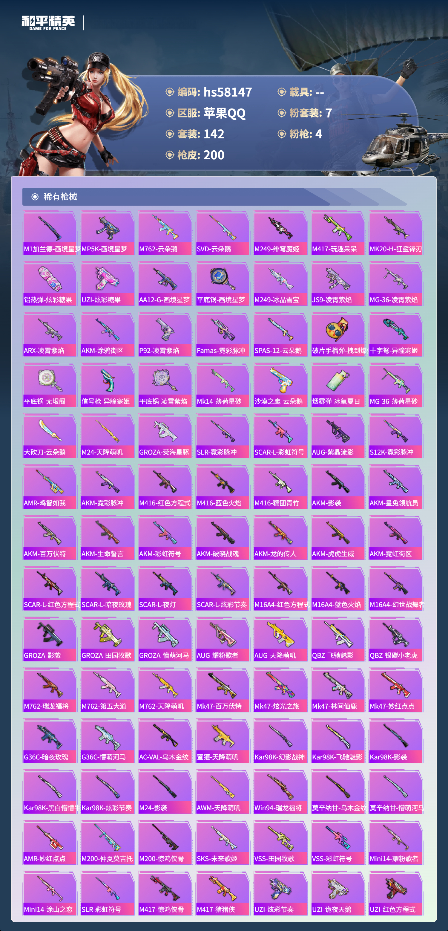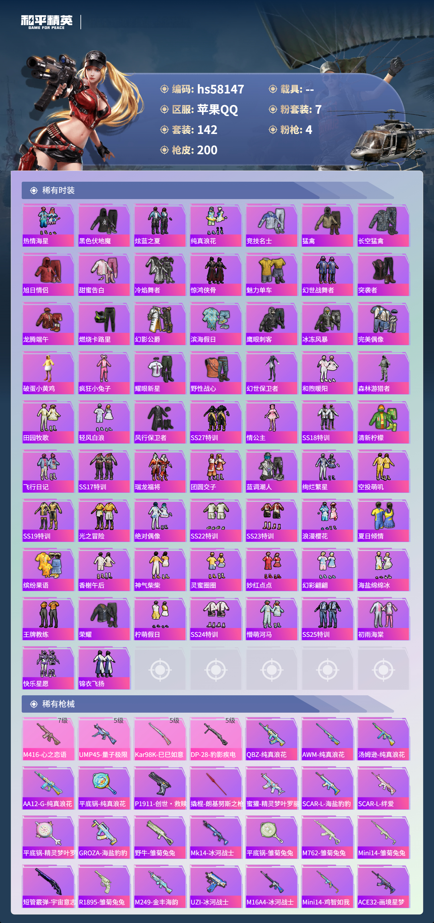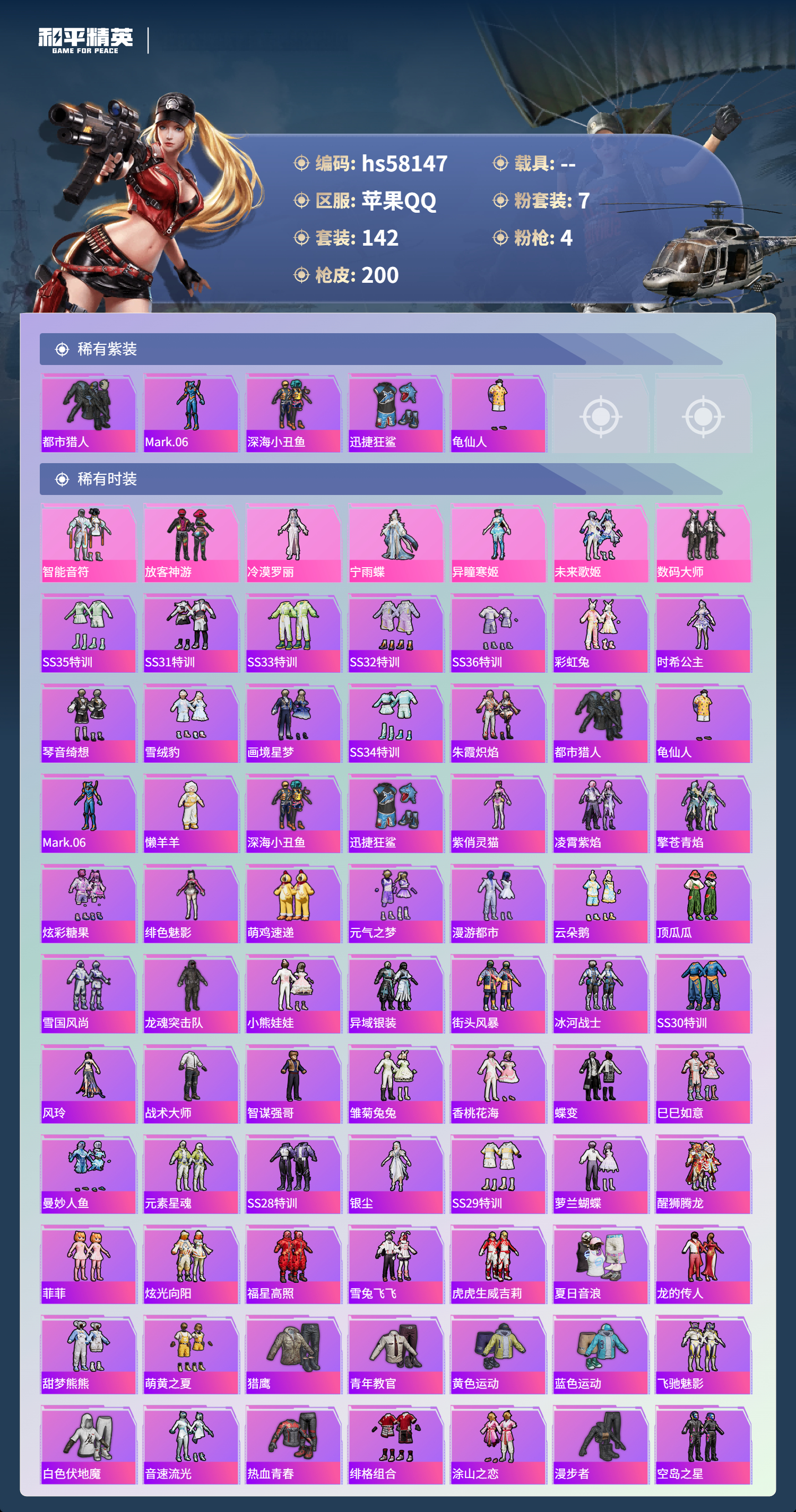 hs58147 苹果手q-9王牌印记-7粉装-4特效呛-63628热力值-142套装-200呛皮-3卓越印记-1传奇印记【7粉装】套装-未来歌姬套装-放客神游角色-冷漠罗丽角色-宁雨蝶套装-数码大师角色-异瞳寒姬套装-智能音符【4特效呛】ump45-量子极限/5级dp-28-豹影疾电/5级kar98k-巳巳如意/5级m416-心之恋语/7级【5稀有紫装】都市猎人mark.