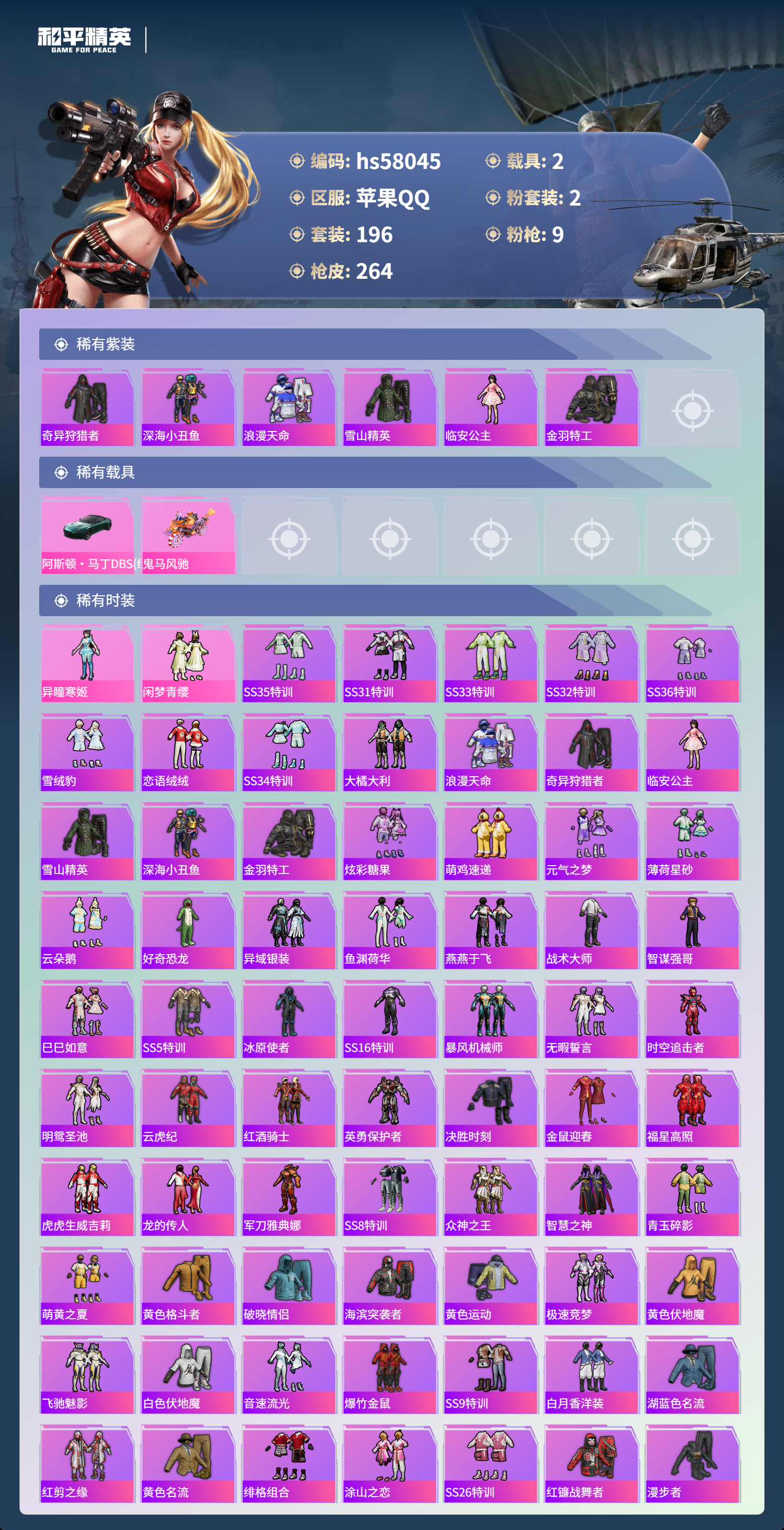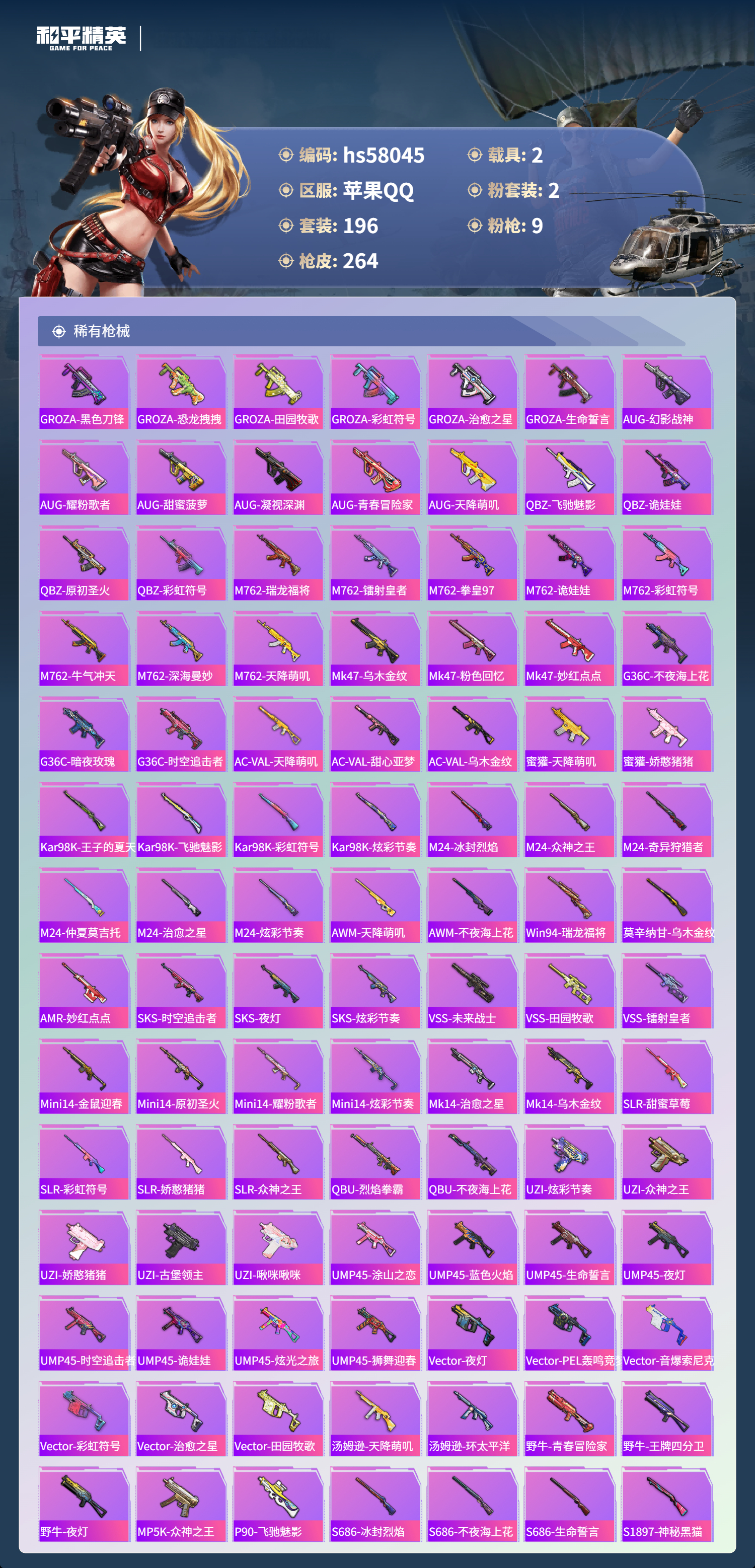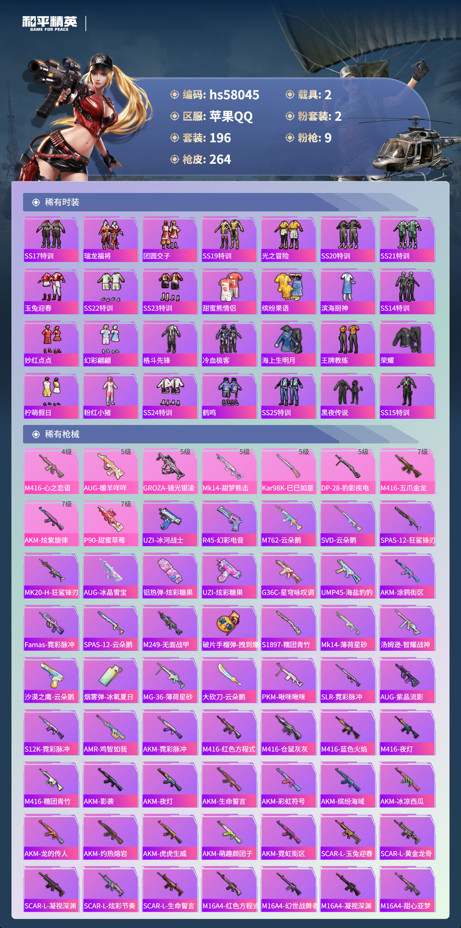 hs58045 苹果手q-16王牌印记-2粉装-9特效呛-2载具-83815热力值-196套装-264呛皮-5卓越印记-2传奇印记【2粉装】套装-闲梦青缨角色-异瞳寒姬【9特效呛】m416-心之恋语/4级dp-28-豹影疾电/5级akm-炫紫旋律/7级kar98k-巳巳如意/5级aug-暖羊咩咩/5级p90-甜蜜草莓/7级mk14-甜梦熊击/5级groza-镜光银凌/5级m4