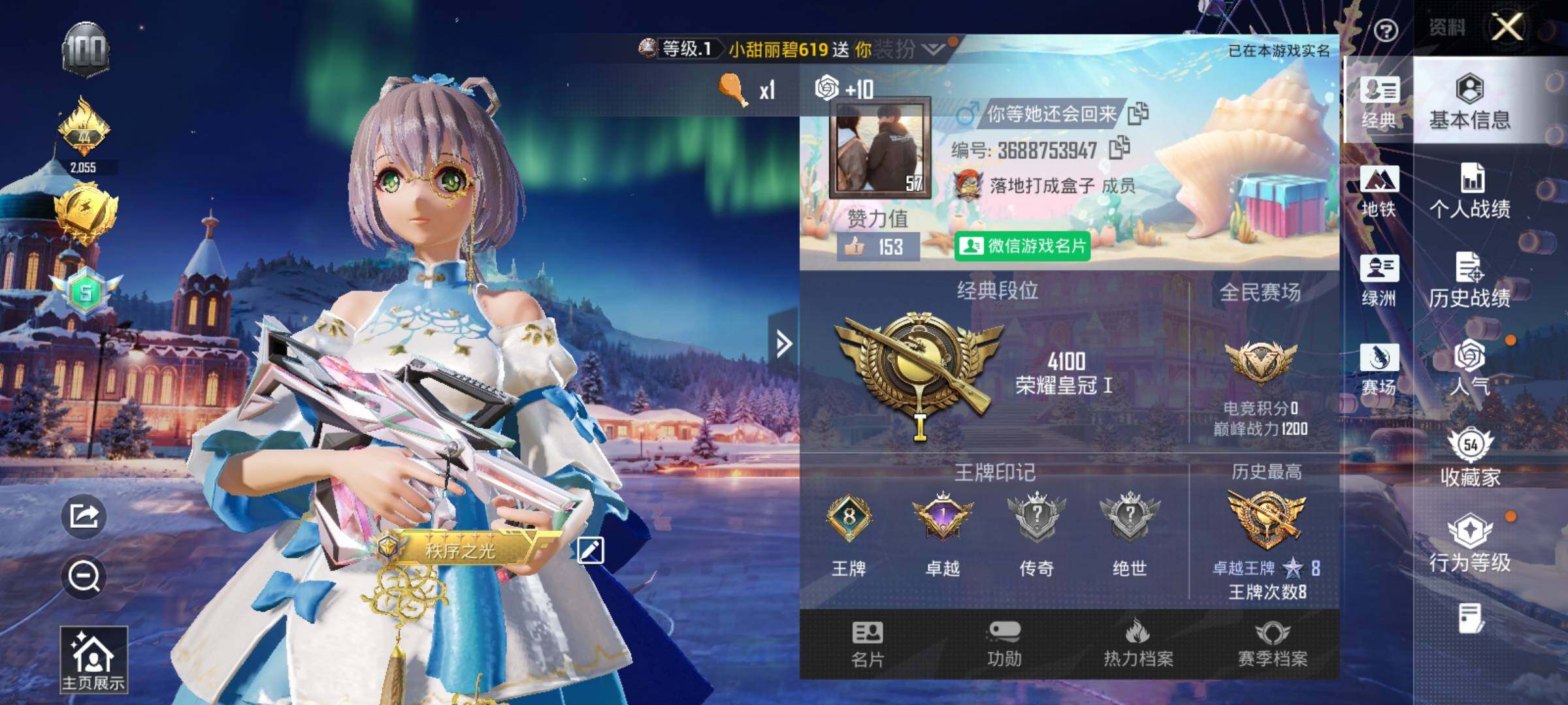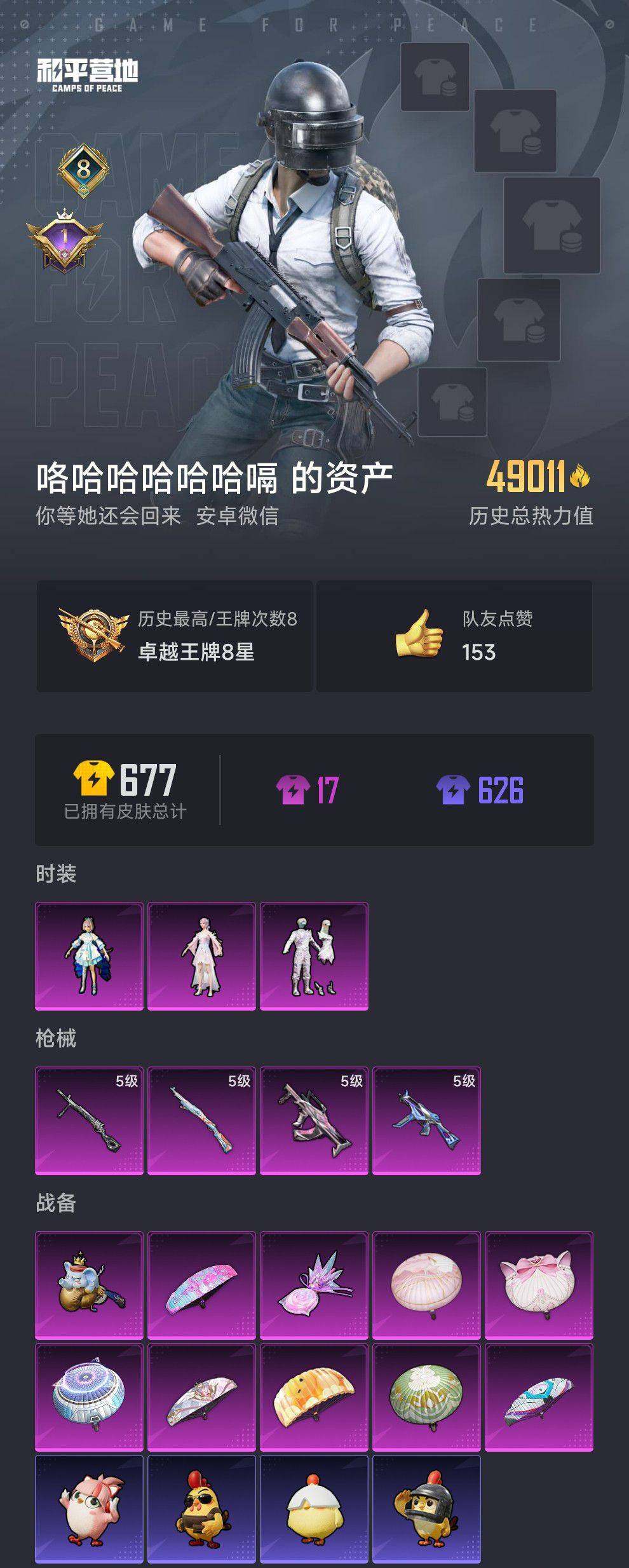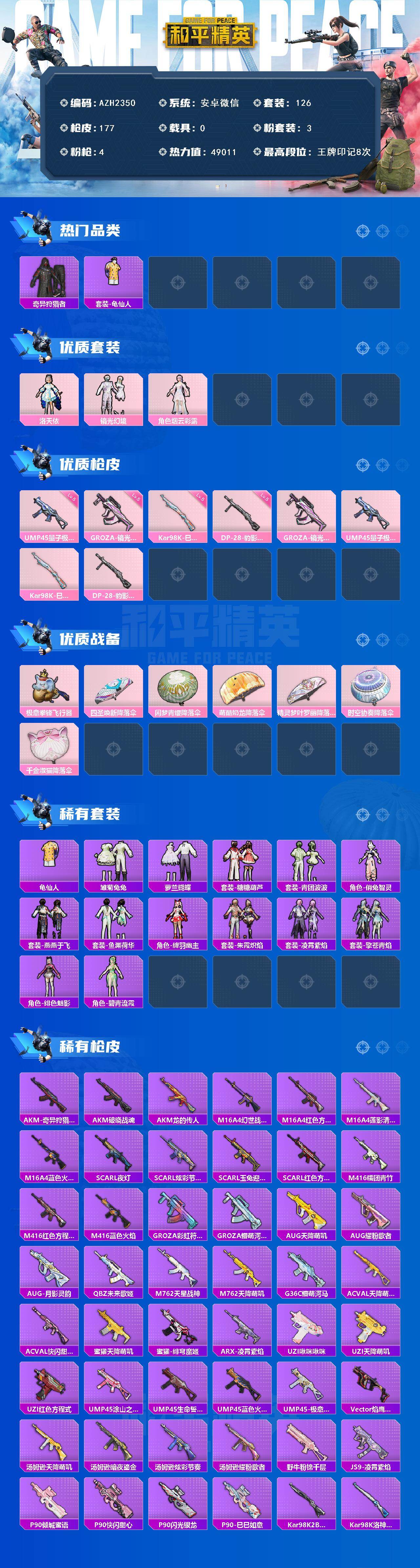 安卓 微信【洛天依 镜光幻境 奇异狩猎者】3粉装-4特效呛-0载具-2粉色飞行器-49011热力值-8王牌印记-126套装-177呛皮 【热门品类】:套装-奇异狩猎者,套装-龟仙人 【粉色套装】:角色-洛天依,粉装-镜光幻境,角色-烟云彩露 【粉色呛皮等级】:groza-镜光银凌五级,ump45-量子极限五级,kar98k-巳巳如意五级,dp-28-豹影疾电五级 【粉色呛皮】: