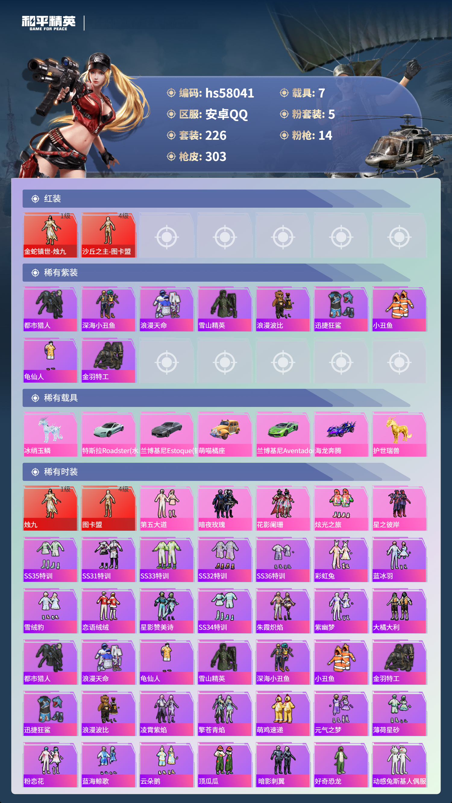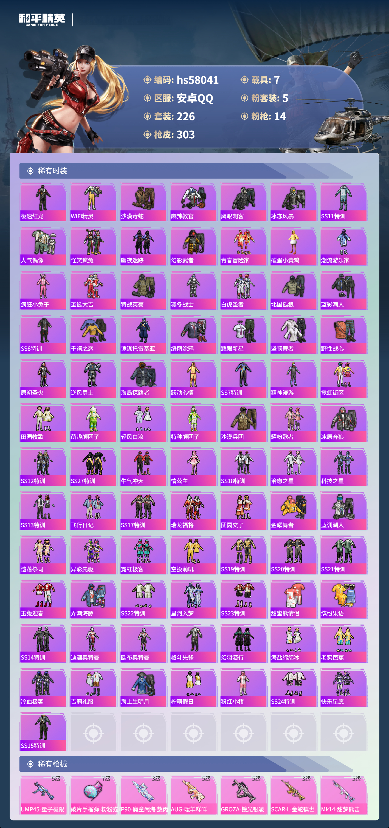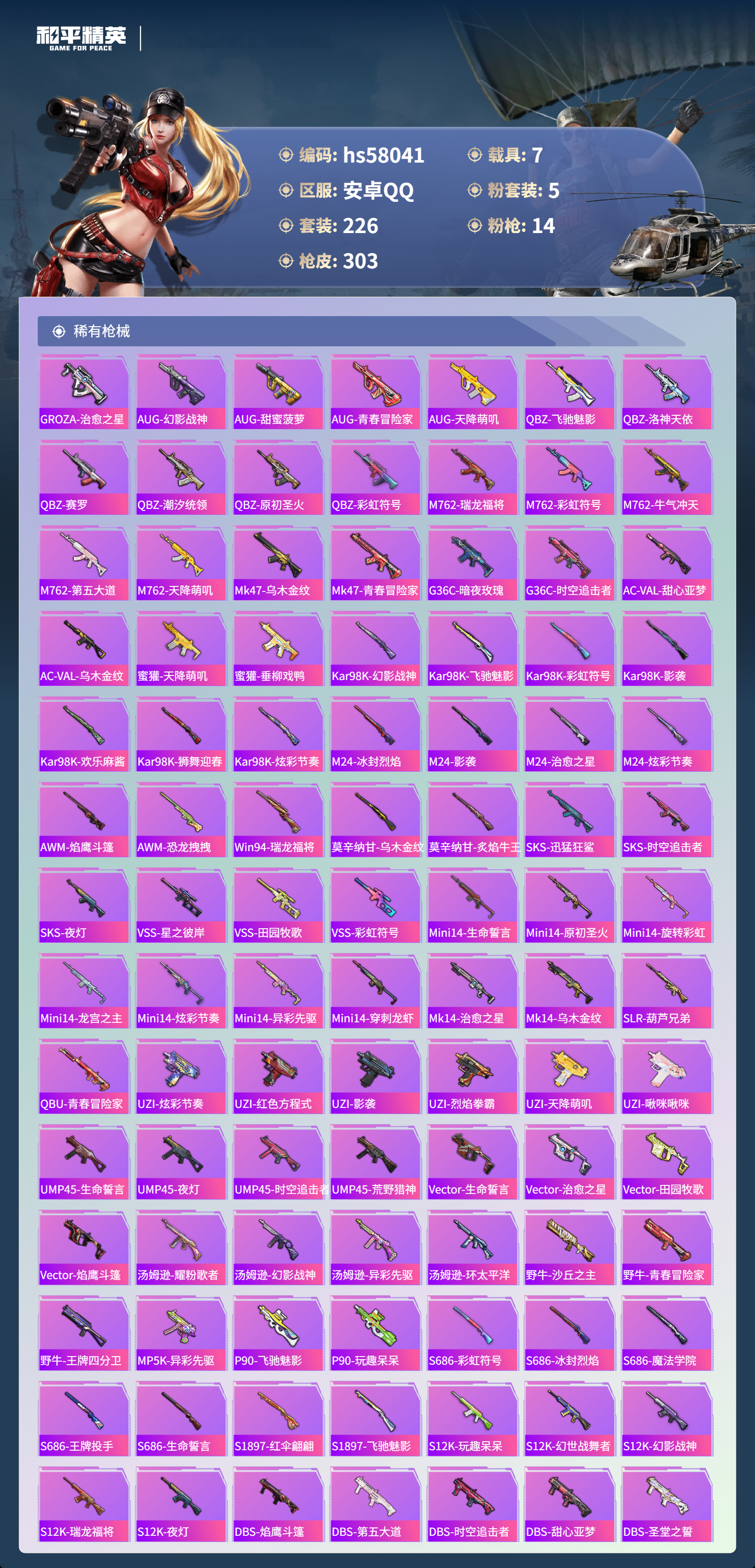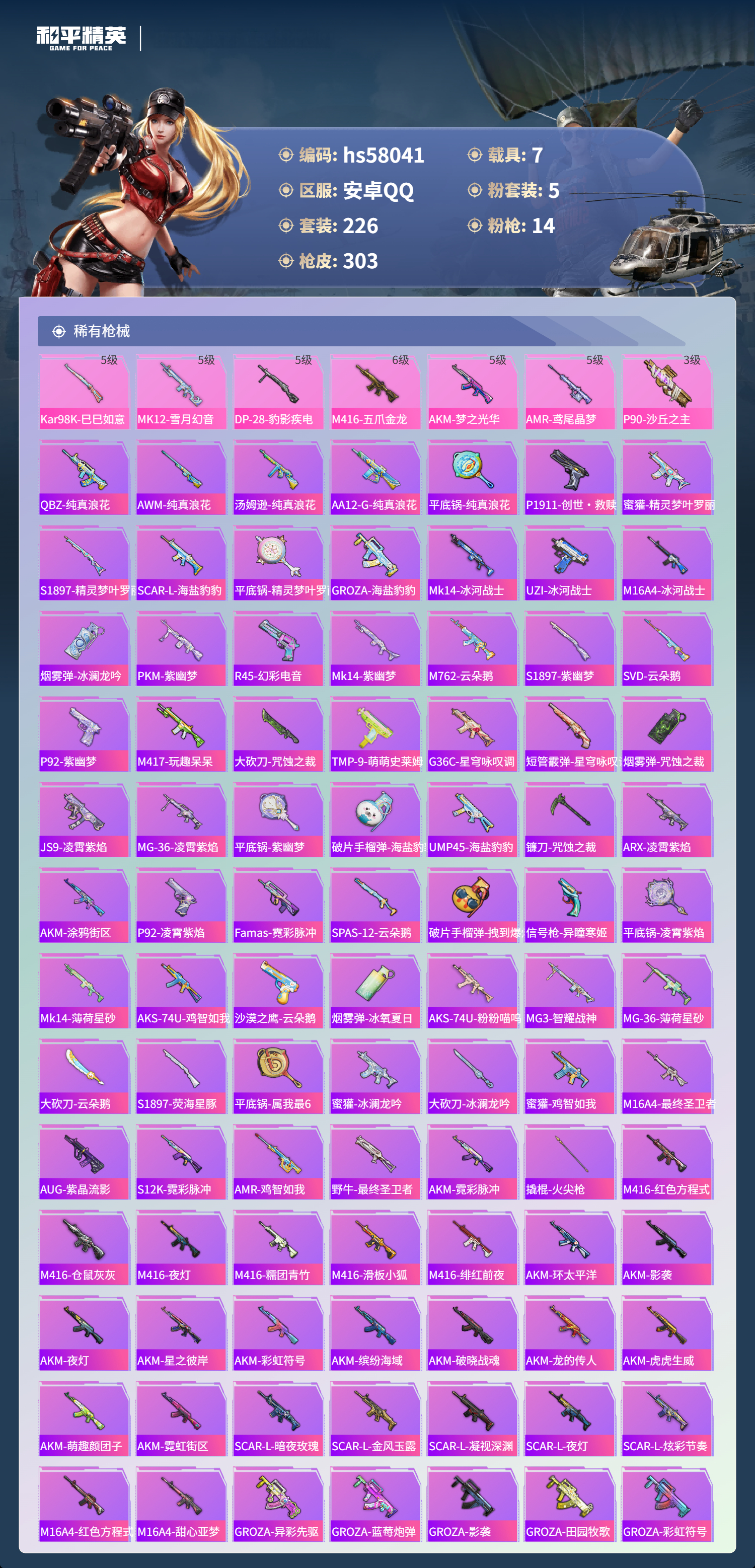 hs58041 安卓手q-17王牌印记-2红装-5粉装-14特效呛-7载具-热力值-226套装-303呛皮-3卓越印记-1传奇印记【2红装】沙丘之主-图卡盟/4级金蛇镇世-烛九/1级【5粉装】套装-炫光之旅套装-暗夜玫瑰套装-第五大道套装-星之彼岸套装-花影阑珊【14特效呛】aug-暖羊咩咩/5级akm-梦之光华/5级amr-鸢尾晶梦/5级mk14-甜梦熊击/5级