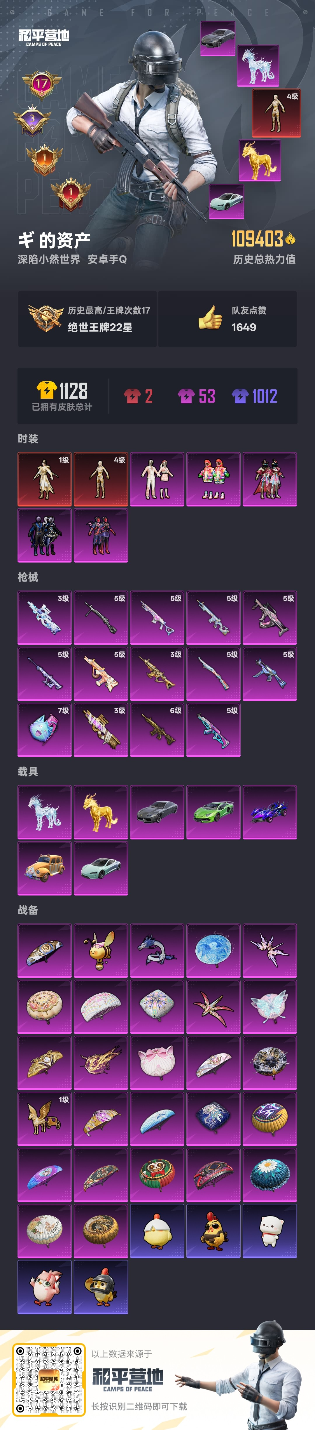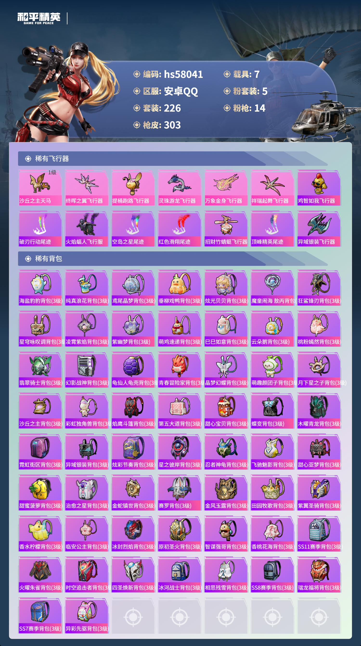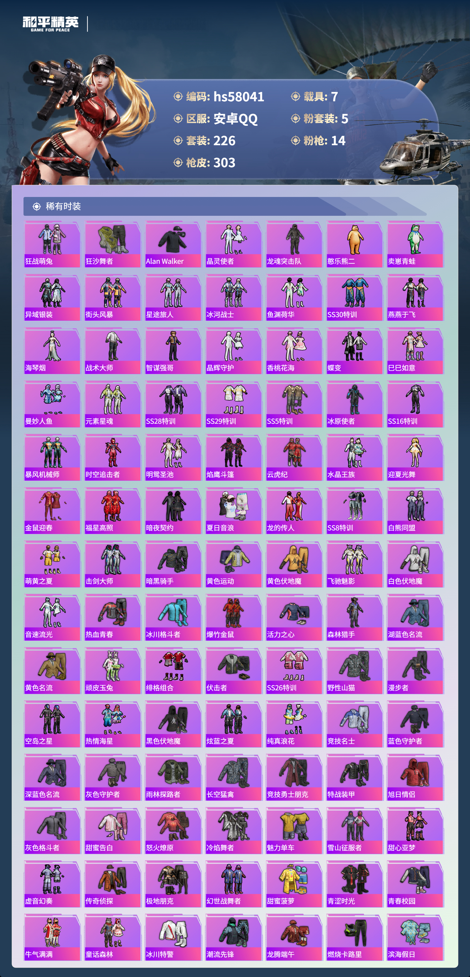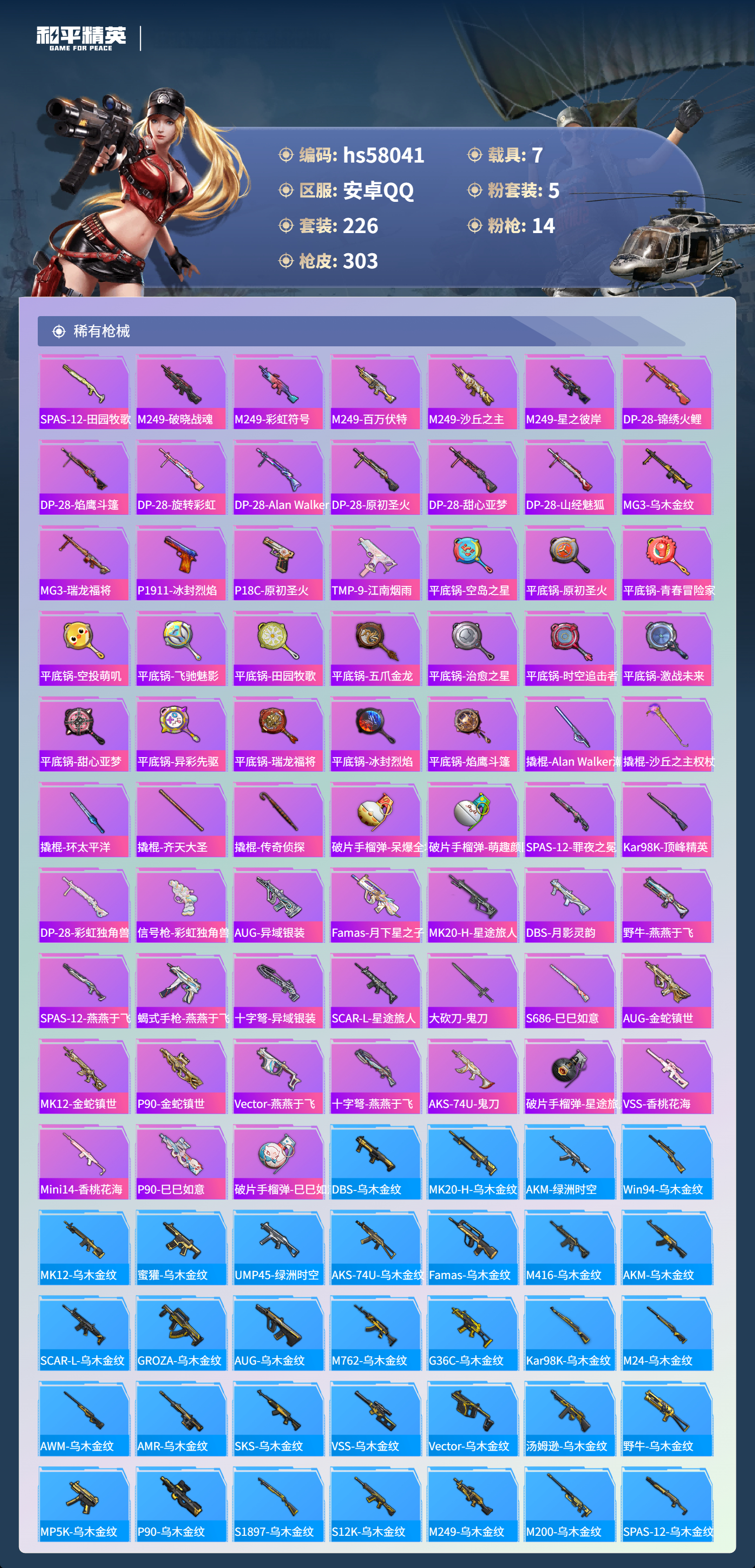 hs58041 安卓手q-17王牌印记-2红装-5粉装-14特效呛-7载具-热力值-226套装-303呛皮-3卓越印记-1传奇印记【2红装】沙丘之主-图卡盟/4级金蛇镇世-烛九/1级【5粉装】套装-炫光之旅套装-暗夜玫瑰套装-第五大道套装-星之彼岸套装-花影阑珊【14特效呛】aug-暖羊咩咩/5级akm-梦之光华/5级amr-鸢尾晶梦/5级mk14-甜梦熊击/5级