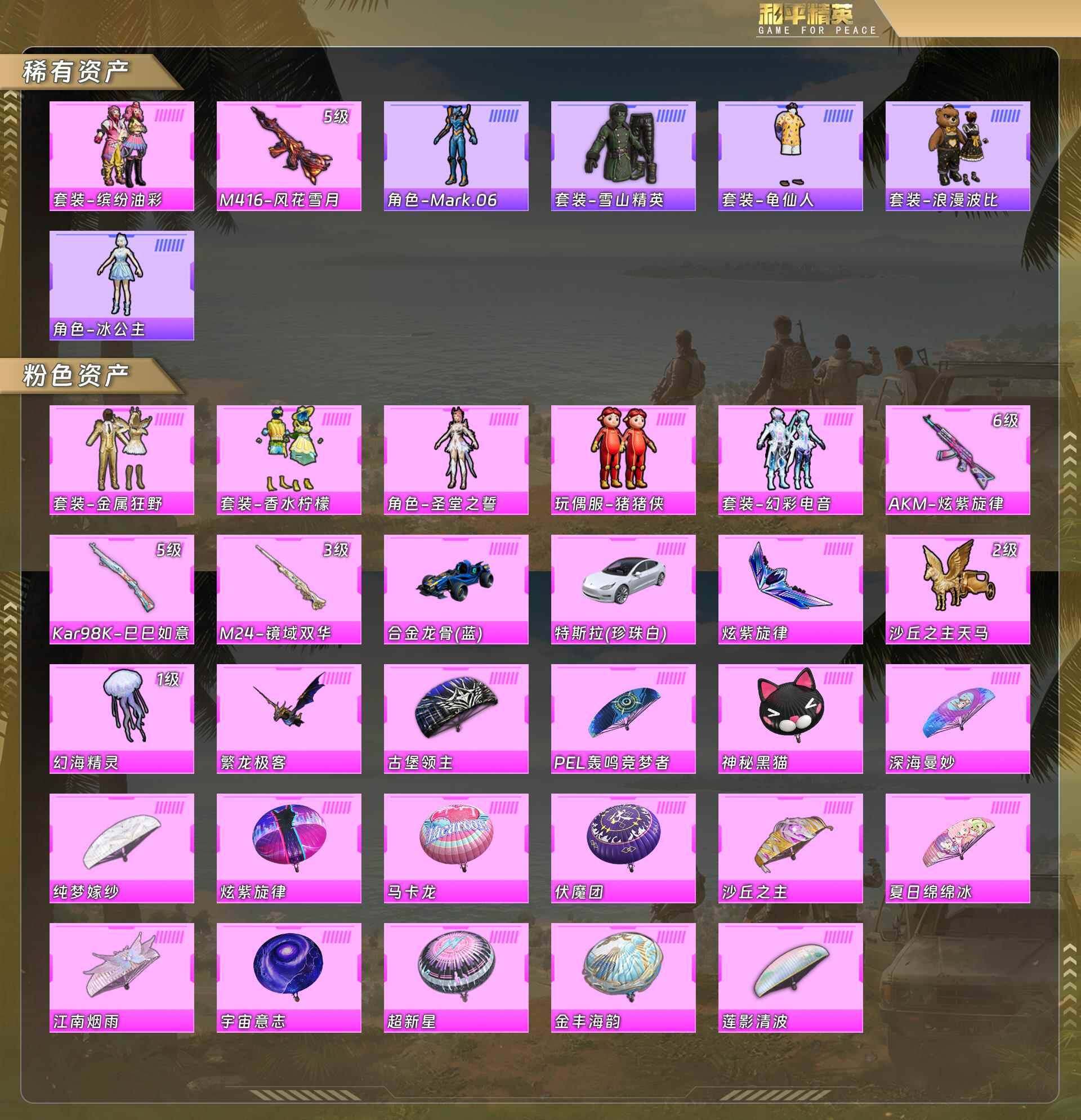 素材号/猪妹/蓝螳螂/浪漫波比/冰公主/金属狂野/香水柠檬/圣堂之誓/猪猪侠/幻彩电音/m416-风花雪月5级/akm-炫紫旋律6级/98k如意5级/m24镜域双华3级/合金龙骨蓝 特斯拉珍珠白 没战神框(6粉装-4粉呛-2载具)hp5206-4粉色飞行器-67851热力值-8王牌印记-137套装-186呛皮 【热门品类】:粉装-缤纷油彩,套装-龟仙人,套装-浪漫波比,角色-mark.06 【粉色套装】:粉装-金属狂野,粉装-缤纷油彩,粉装-香水柠檬,角色-圣堂之誓,玩偶服-猪猪侠,粉装-幻彩电音 【粉色呛皮等级】:akm-炫紫旋律六级,m416-风花雪月五级,kar98k-巳巳如意五级,m24-镜域双华三级 【粉色载具】:特斯拉model 3(珍珠白),合金龙骨(蓝) 【粉色呛皮】:akm-炫紫旋律,m416-风花雪月,kar98k-巳巳如意,m24-镜域双华 【粉色飞行器】:炫紫旋律飞行器,沙丘之主天马,繁龙极客飞行器,幻海精灵飞行器 【粉色降落伞】:深海曼妙降落伞,炫紫旋律降落伞,pel轰鸣竞梦者降落伞,神秘黑猫降落伞,古堡领主降落伞,伏魔团降落伞,马卡龙降落伞,夏日绵绵冰降落伞,纯梦嫁纱降落伞,超新星降落伞,莲影清波降落伞,沙丘之主降落伞,江南烟雨降落伞,金丰海韵降落伞,宇宙意志降落伞 【稀有套装】:套装-龟仙人,套装-雪国风尚,角色-紫俏灵猫 【稀有呛皮】:akm-夜灯,akm-破晓战魂,akm-胡桃卫兵,akm-龙的传人,m16a4-机械英豪,m16a4-莲影清波,scar-l-夜灯,scar-l-炫彩节奏,scar-l-玉兔迎春,m416-夜灯,m416-神秘黑猫,m416-糯团青竹,m416-蓝色火焰,groza-异彩先驱,groza-彩虹符号,groza-罗小黑,aug-天降萌叽,aug-耀粉歌者,q-原初圣火,q-彩虹符号,q-神秘黑猫,m762-天降萌叽,m762-牛气冲天,m762-瑞龙福将,m762-绯红前夜,mk47-妙红点点,g36c-镜域双华,g36c-不夜海上花,g36c-金风玉露,ac-val-天降萌叽,ac-val-快闪甜心,蜜獾-天降萌叽,uzi-众神之王,uzi-古堡领主,uzi-啾咪啾咪,uzi-天降萌叽,uzi-炫彩节奏,uzi-生命誓言,uzi-红色方程式,ump45-夜灯,ump45-生命誓言,vect-焰鹰斗篷,vect-pel轰鸣竞梦者,vect-彩虹符号,vect-生命誓言,汤姆逊-勇闯险境,汤姆逊-耀粉歌者,野牛-机械英豪,野牛-沙丘之主,mp5k-众神之王,p90-快闪甜心,p90-巳巳如意,kar98k-勇闯险境,kar98k-古堡领主,kar98k-彩虹符号,kar98k-洛神天依,m24-众神之王,awm-焰鹰斗篷,awm-不夜海上花,sks-勇闯险境,sks-炫彩节奏,vss-星之彼岸,mini14-原初圣火,mini14-炫彩节奏,mini14-耀粉歌者,mini14-金鼠迎春,win94-机械英豪,win94-瑞龙福将,slr-众神之王,slr-四圣焕新,slr-沙漠守护者,qbu-不夜海上花,莫辛纳甘-蜜语绒猫,amr-妙红点点,m417-惊鸿侠骨,m417-猪猪侠,mk20-h-快闪甜心,m200-惊鸿侠骨,s686-不夜海上花,s686-蜜语绒猫,s686-浪客战士,s686-生命誓言,s1897-勇闯险境,s1897-神秘黑猫,s12k-瑞龙福将,s12k-香水柠檬,s12k-pel轰鸣竞梦者,s12k-机械英豪,dbs-焰鹰斗篷,dbs-圣堂之誓,m249-古堡领主,m249-妙红点点,m249-彩虹符号,m249-沙丘之主,m249-破晓战魂,dp-28-焰鹰斗篷,dp-28-原初圣火,dp-28-沙漠守护者,mg3-妙红点点,mg3-幻世战舞者,mg3-惊鸿侠骨,mg3-瑞龙福将,mg3-第五大道,p18c-原初圣火,蝎式手呛-闲梦青缨,沙墨之鹦-快闪甜心,爆炸猎弓-惊鸿侠骨,爆炸猎弓-雪月幻音,撬棍-沙丘之主权杖,平底锅-宁雨蝶 【其他套装】:套装-ss8特训,套装-ss9特训,套装-ss10特训,套装-ss11特训,套装-ss12特训,套装-ss13特训,套装-ss14特训,套装-ss15特训,套装-ss16特训,套装-ss17特训,套装-ss18特训,套装-ss23特训,套装-ss24特训,套装-ss25特训,套装-ss26特训,套装-ss27特训,套装-ss28特训,套装-ss29特训,套装-冰川格斗者,套装-北国孤狼,套装-吉莉礼服,套装-夏日音浪,套装-完美偶像,套装-幻影武者,套装-怒火燎原,套装-极速红龙,套装-柠萌假日,套装-格斗先锋,套装-海上生明月,套装-海岛探路者,套装-潮流先锋,套装-灰色格斗者,套装-热血青春,套装-牛气冲天,套装-牛气满满,套装-特战装甲,套装-特殊使命,套装-特训学院,套装-猛禽,套装-甜蜜告白,套装-甜蜜熊情侣,套装-疯狂小兔子,套装-破晓战魂,套装-破蛋小黄鸡,套装-福星高照,套装-空岛之星,套装-竞技勇士朋克,套装-竞技名士,套装-绯格组合,套装-耀眼新星,套装-萌黄之夏,套装-蓝色运动,套装-虎虎生威吉莉,套装-酒红色名流,套装-酷潮明星,套装-长空猛禽,套装-霓虹街区,套装-青涩时光,套装-风行保卫者,套装-骑行爱好者,套装-魅力单车,套装-鹤鸣,套装-黄色运动,套装-龙的传人,套装-龟仙人,套装-冰冻风暴,套装-街舞之王,套装-冰川特警,套装-梦魇先生,套装-雪山精英,套装-裁决冥王,套装-浪漫波比,套装-迷域探索者,套装-深蓝冒险家,套装-众神之王,套装-智慧之神,套装-pel摇滚竞梦者,套装-神秘黑猫,套装-大橘为重,套装-软萌银虎,套装-白月香洋装,套装-风华少年志,套装-红酒骑士,套装-舞夜骑士,套装-激萌罗小黑,套装-暴走罗小黑,套装-机械征服者,套装-原初圣火,套装-逆风勇士,套装-青龙圣者,套装-瑞龙福将,套装-团圆交子,套装-电音精灵,套装-天籁歌者,套装-炫光向阳,套装-妙红点点,套装-幻彩翩翩,套装-香榭午后,套装-惊鸿侠骨,套装-锦衣飞扬,套装-晨曦薄雾,套装-快闪甜心,套装-春光漫游,套装-贝斯之夜,套装-无暇誓言,套装-童真绒兔,套装-焰鹰斗篷,套装-幽夜迷踪,套装-幻羽潜行,角色-冰公主,套装-纯真浪花,套装-热情海星,套装-曼妙人鱼,角色-mark.06,套装-粉日山川 【稀有头盔】:金风玉露头盔2级,深海小丑鱼头盔3级 【稀有背包】:金风玉露背包3级,金风玉露背包2级,金属狂野镶钻背包3级,金属狂野镶钻背包2级,金属狂野镶钻背包1级,神秘