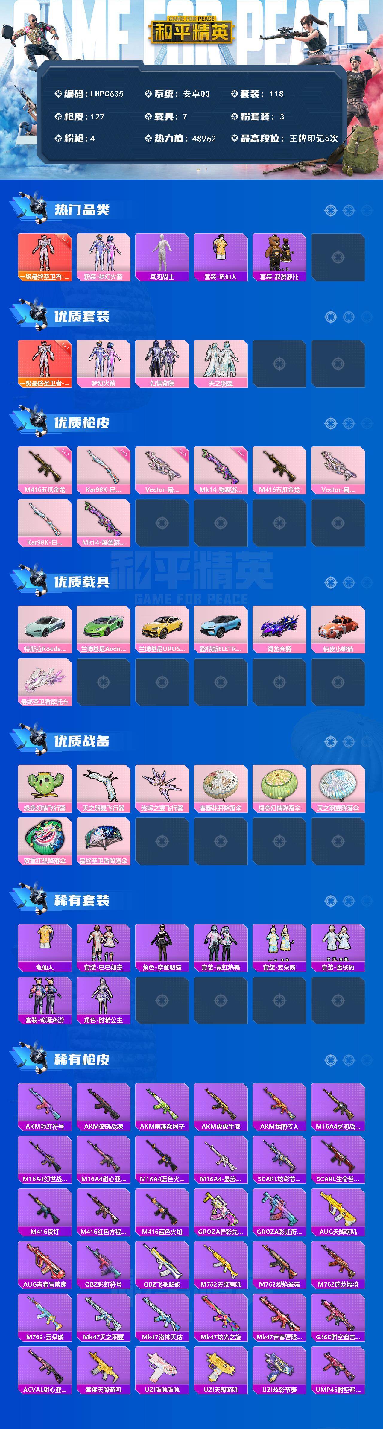 7载具-118套装-127呛皮-【店主推荐捡漏号!可直接换绑】安卓 手q-1神装-3粉装-4特效呛-7载具-3粉色飞行器-48962热力值-5王牌印记-118套装-127呛皮 【红色神装等级】:最终圣卫者-帕修斯一级 【红色角色神装】:最终圣卫者-帕修斯 【热门品类】:粉装-梦幻火箭,套装-冥河战士,套装-龟仙人,套装-浪漫波