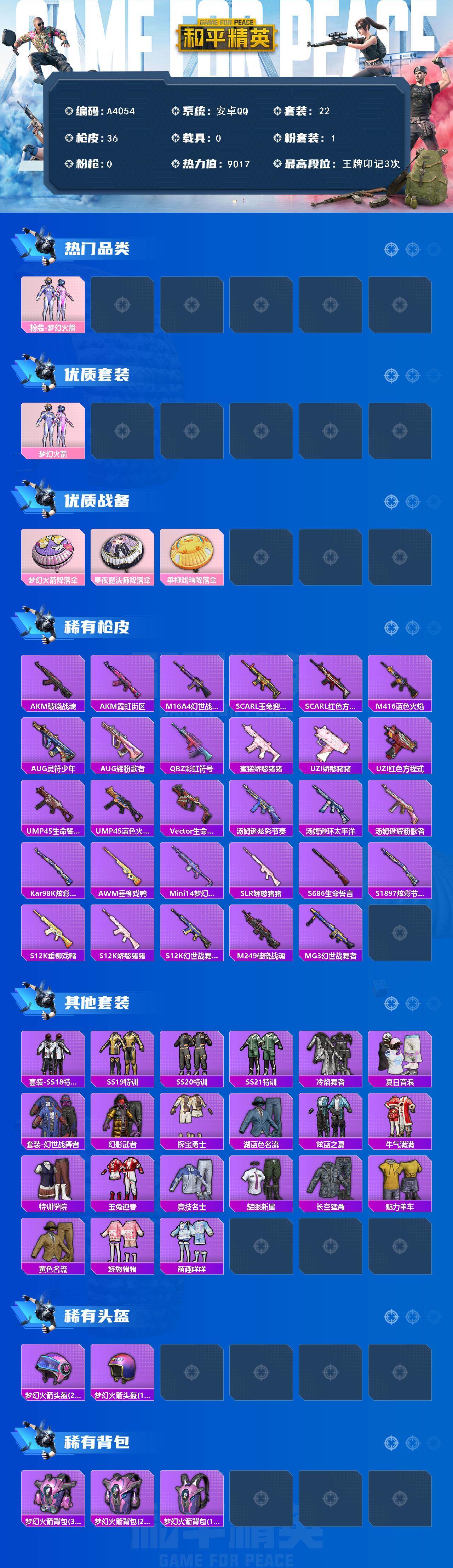 [15890913]安卓【小号/梦幻火箭】 手q-1粉装-0特效呛-0载具-0粉色飞行器-9017热力值-3王牌印记-22套装-36呛皮 【热门品类】:粉装-梦幻火箭 【粉色套装】:粉装-梦幻火箭 【粉色降落伞】:梦幻火箭降落伞,星夜魔法师降落伞,垂柳戏鸭降落伞 【稀有呛皮】:akm-破晓战魂,akm-霓虹街区,m16a4-幻世战舞者,scar-l-玉兔迎春,scar-l-红色方程式,m416-蓝色火焰,aug-灵符少年,aug-耀粉歌者,q-彩虹符号,蜜獾-娇憨猪猪,uzi-娇憨猪猪,uzi-红色方程式,ump45-生命誓言,ump45-蓝色火焰,vect-生命誓言,汤姆逊-炫彩节奏,汤姆逊-环太平洋,汤姆逊-耀粉歌者,kar98k-炫彩节奏,awm-垂柳戏鸭,mini14-梦幻火箭,slr-娇憨猪猪,s686-生命誓言,s1897-炫彩节奏,s12k-垂柳戏鸭,s12k-娇憨猪猪,s12k-幻世战舞者,m249-破晓战魂,mg3-幻世战舞者 【其他套装】:套装-ss18特训,套装-ss19特训,套装-ss20特训,套装-ss21特训,套装-冷焰舞者,套装-夏日音浪,套装-幻世战舞者,套装-幻影武者,套装-探宝勇士,套装-湖蓝色名流,套装-炫蓝之夏,套装-牛气满满,套装-特训学院,套装-玉兔迎春,套装-竞技名士,套装-耀眼新星,套装-长空猛禽,套装-魅力单车,套装-黄色名流,套装-娇憨猪猪,套装-萌趣咩咩 【稀有头盔】:梦幻火箭头盔2级,梦幻火箭头盔1级 【稀有背包】:梦幻火箭背包3级,梦幻火箭背包2级,梦幻火箭背包1级 【营地id】:795769935