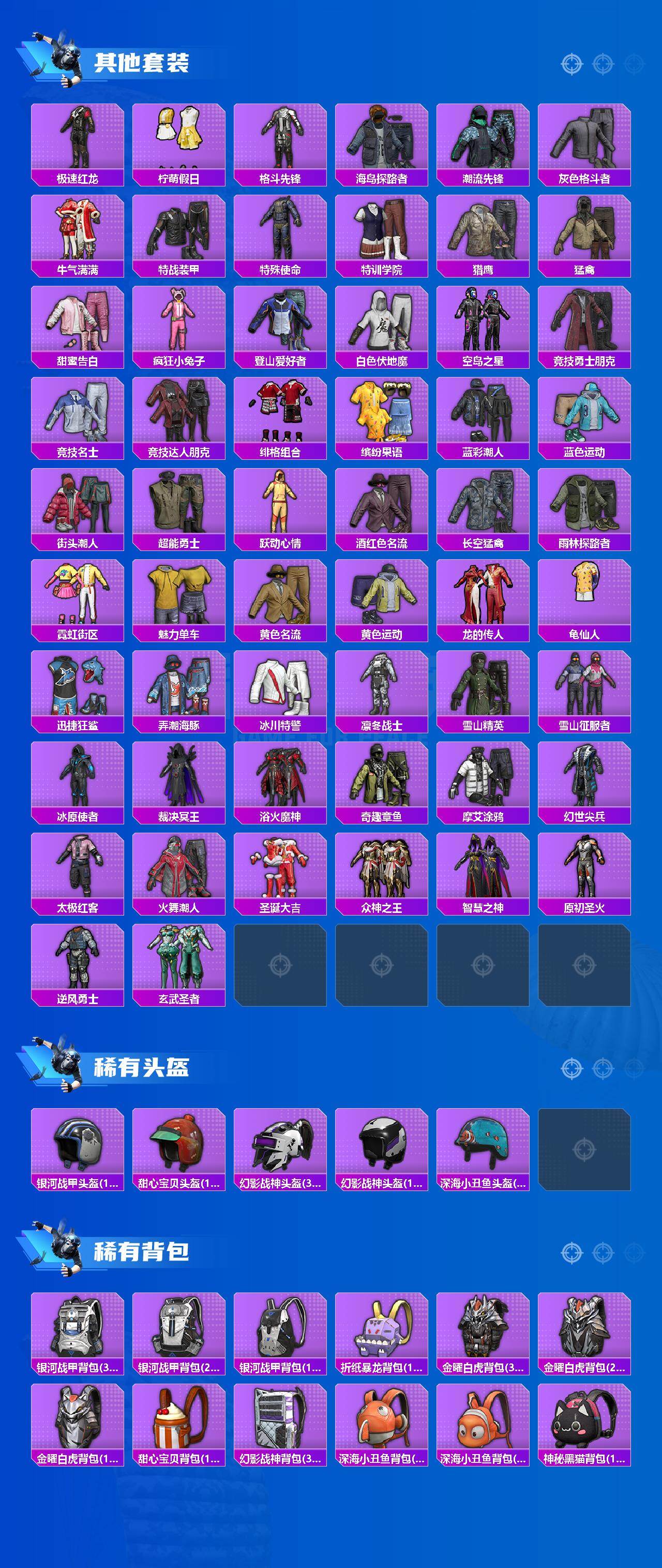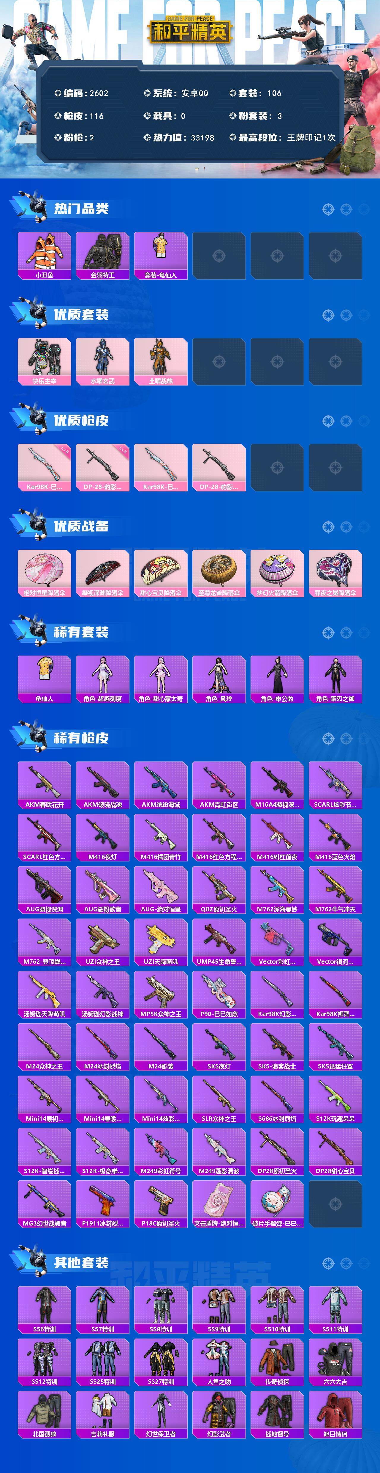 0载具-106套装-116呛皮-106套装/呛械2/装备149/战备66/王牌印记1/热力值33198/五级kar98k-巳巳如意/五级dp-28-豹影疾电/小丑鱼/金羽特工/套装-龟仙人/快乐主宰/水曜玄武/土曜战麒/kar98k-巳巳如意/dp-28-豹影疾电/绝对恒星降落伞/凝视深渊降落伞/甜心宝贝降落伞/至尊龙雀降落伞/梦幻火箭降落伞/炫彩糖果降落伞/罪夜之冕降落伞/龟仙人/角色-超感刻度/角色-甜心蒙太奇/套装-雪