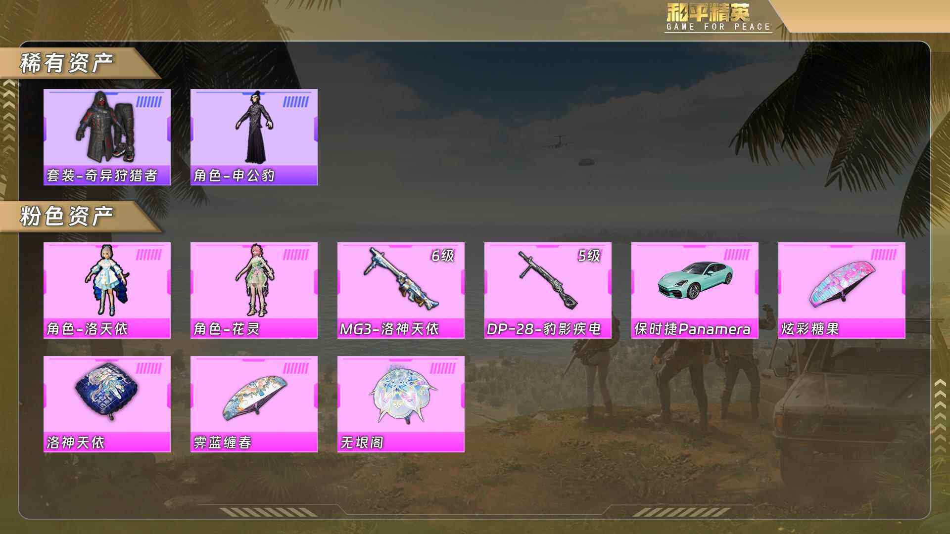 (2粉套2粉呛1载具)奇异狩猎者/洛天依/花灵/mg3洛神天依6级/dp28豹影疾电5级/保时捷青没战神框hp5207-0粉色飞行器-12636热力值-2王牌印记-28套装-40呛皮 【热门品类】:套装-奇异狩猎者 【粉色套装】:角色-洛天依,角色-花灵 【粉色呛皮等级】:dp-28-豹影疾电五级,mg3-洛神天依六级 【粉色载具】:保时捷panamera(梦幻青) 【粉色呛皮】:dp-28-豹影疾电,mg3-洛神天依 【粉色降落伞】:洛神天依降落伞,无垠阁降落伞,炫彩糖果降落伞,霁蓝缠春降落伞 【稀有套装】:套装-朱霞炽焰,套装-凌霄紫焰,套装-擎苍青焰,角色-申公豹,角色-绯色魅影 【稀有呛皮】:scar-l-夜灯,scar-l-玉兔迎春,q-洛神天依,m762-天降萌叽,m762-奇异狩猎者,mk47-洛神天依,arx-凌霄紫焰,uzi-天降萌叽,汤姆逊-天降萌叽,汤姆逊-奇异狩猎者,js9-凌霄紫焰,kar98k-洛神天依,m24-奇异狩猎者,s686-奇异狩猎者,mg3-幻世战舞者,mg-36-凌霄紫焰,p92-凌霄紫焰,撬棍-暮色玫影,平底锅-凌霄紫焰 【其他套装】:套装-ss23特训,套装-特战装甲,套装-王牌教练,套装-疯狂小兔子,套装-魅力单车,套装-奇异狩猎者,套装-金耀舞者,套装-蓝调潮人,套装-贵族骑装,套装-电音精灵,套装-天籁歌者 【营地id】:794468289