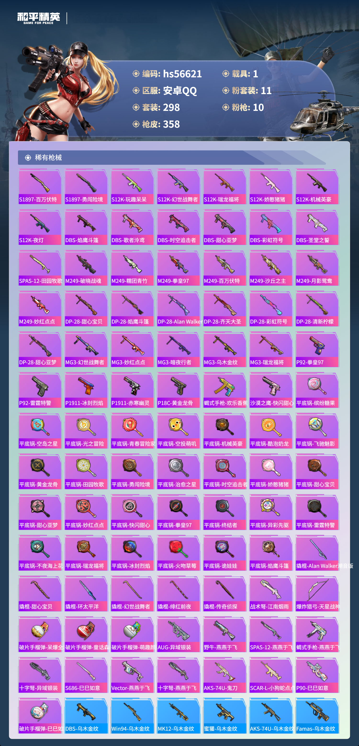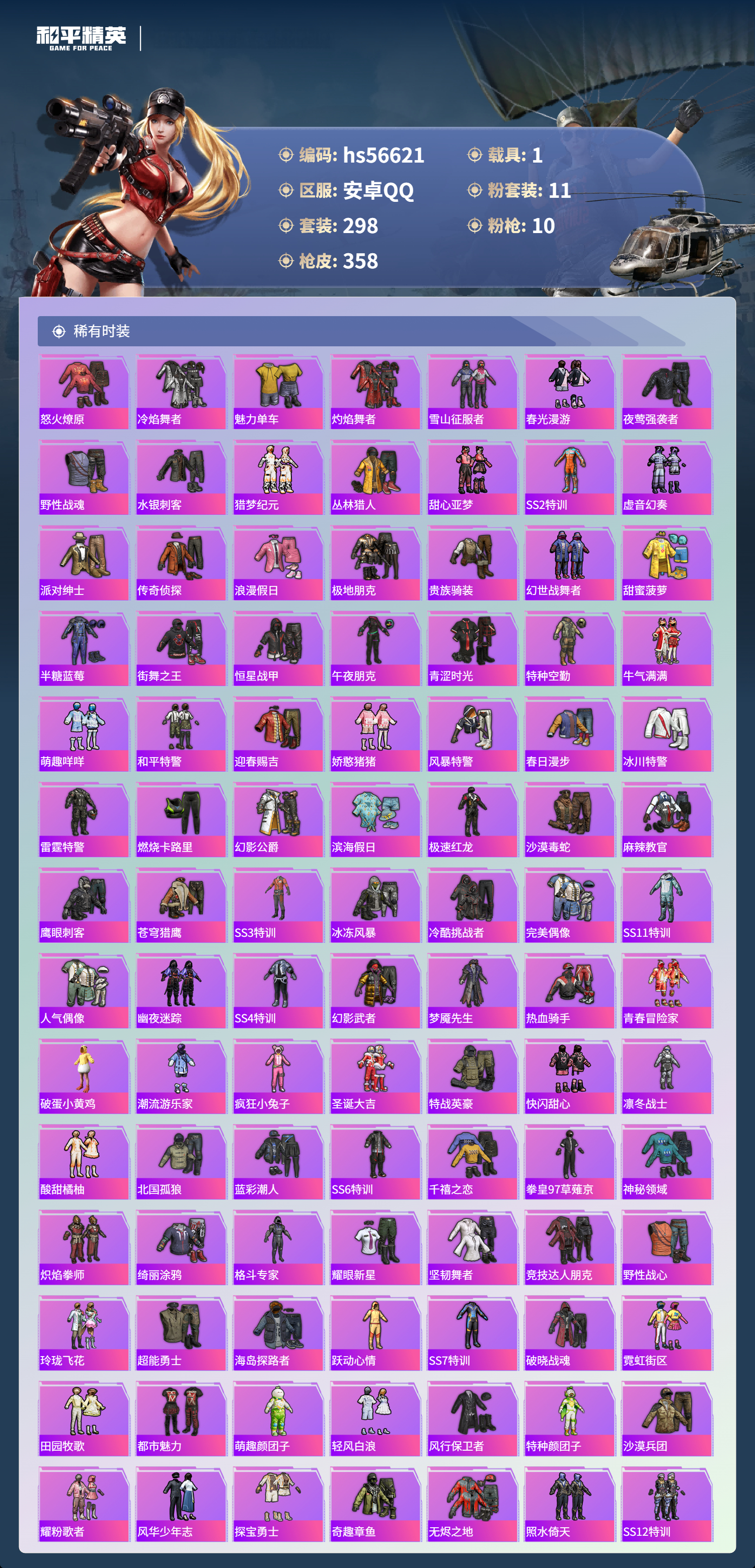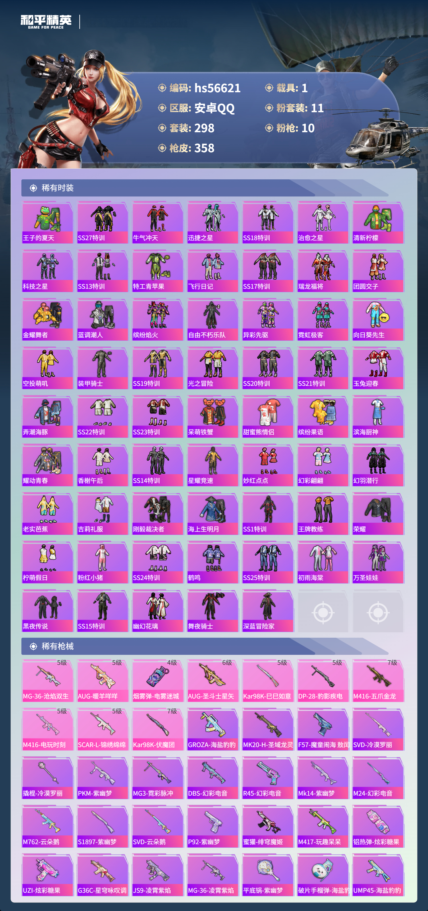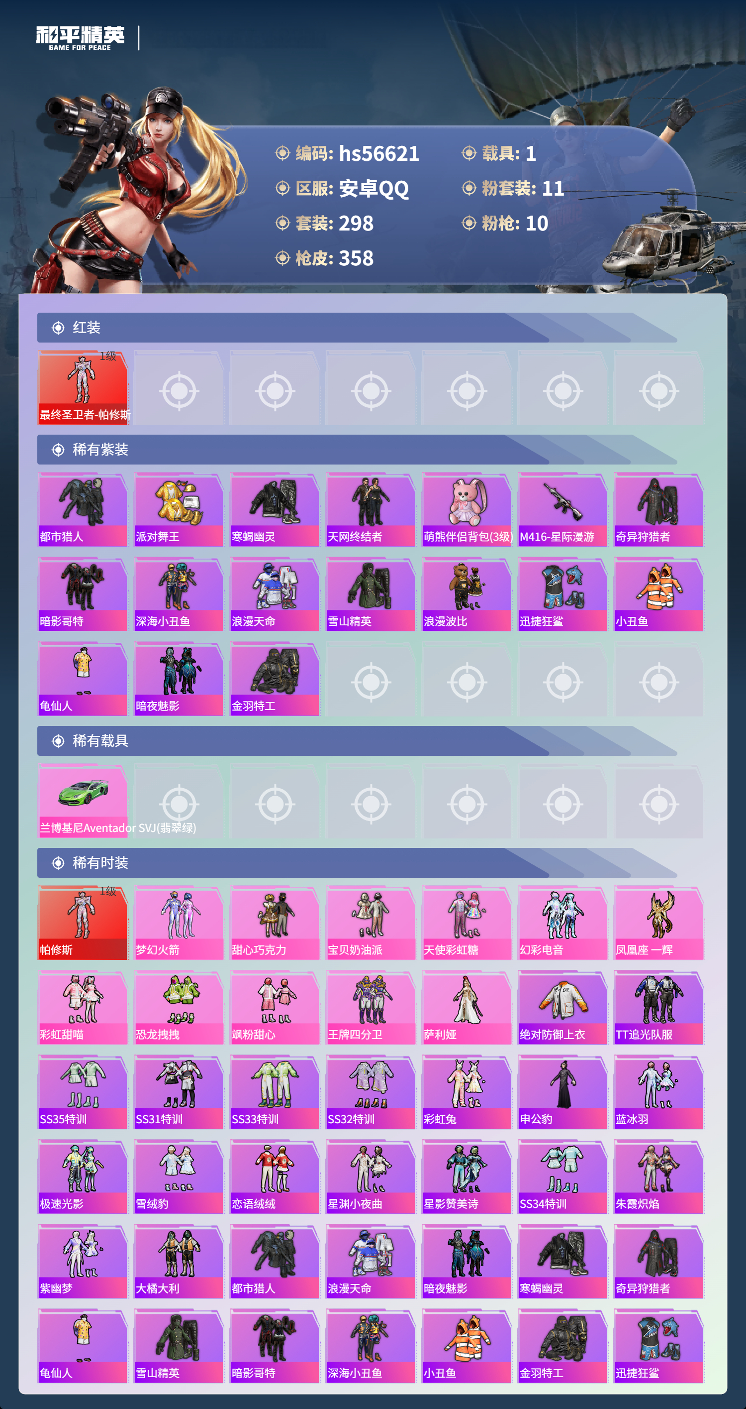 hs56621 安卓手q-17王牌印记-有战神框-1红装-11粉装-10特效呛-1载具-热力值-298套装-358呛皮-4卓越印记-2传奇印记【1红装】最终圣卫者-帕修斯/1级【11粉装】套装-王牌四分卫角色-萨利娅套装-宝贝奶油派套装-甜心巧克力套装-恐龙拽拽套装-飒粉甜心套装-天使彩虹糖套装-梦幻火箭角色-凤凰座 一辉套装-幻彩电音套装-彩虹甜喵【10特效