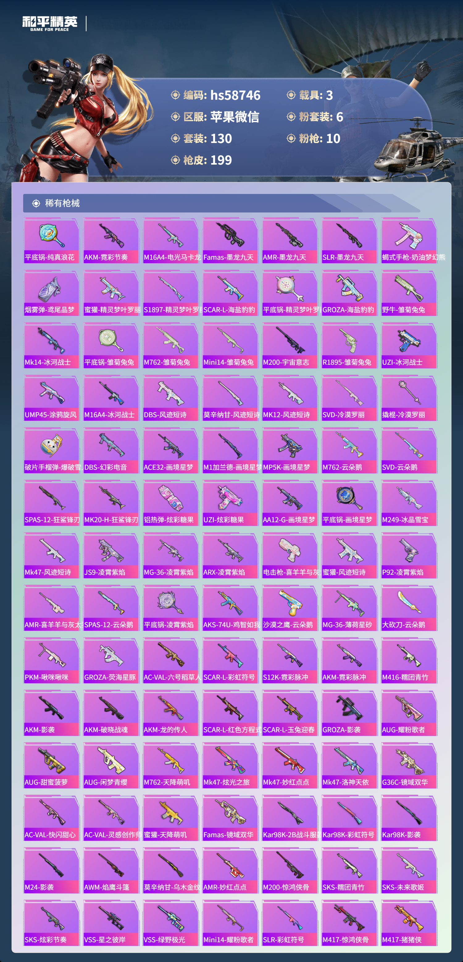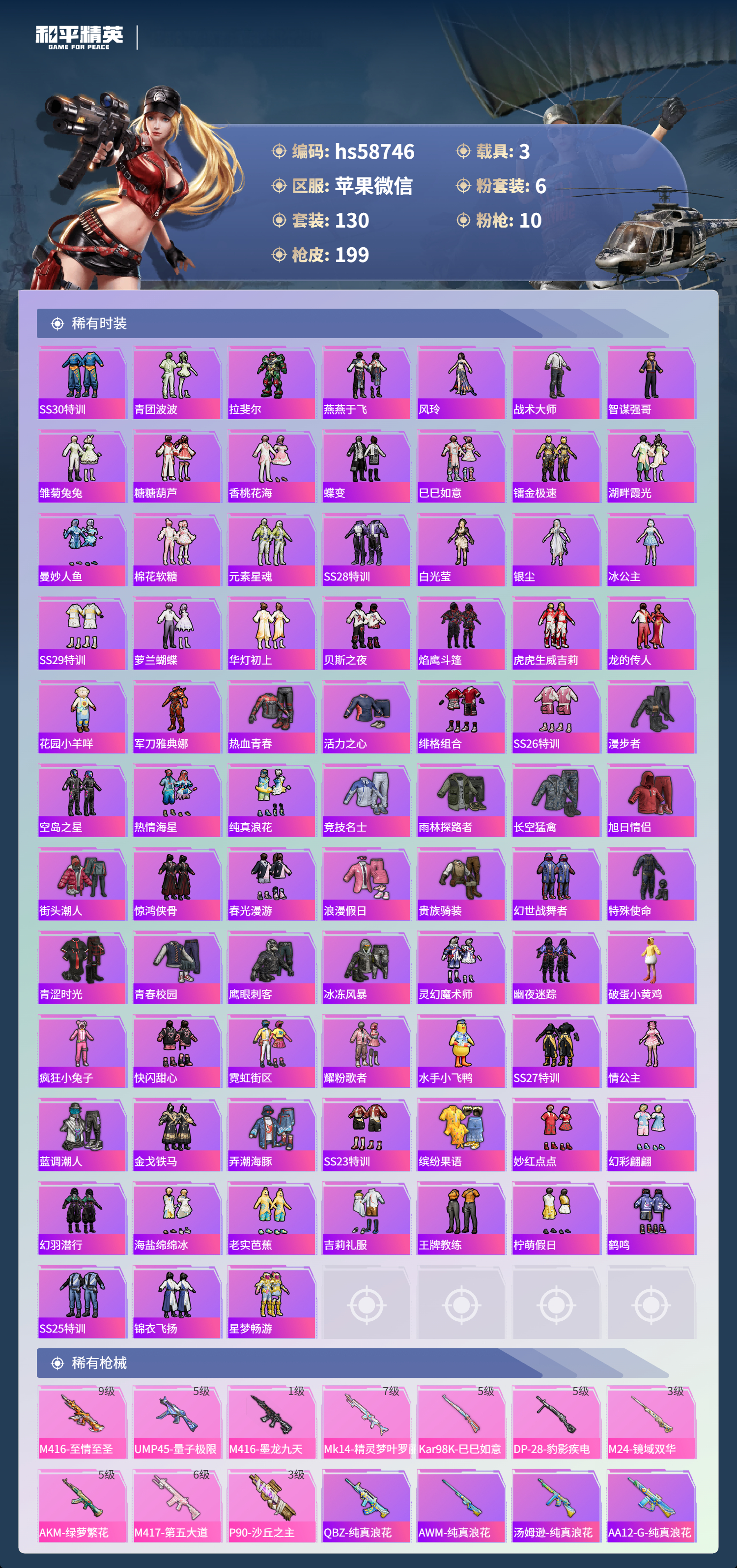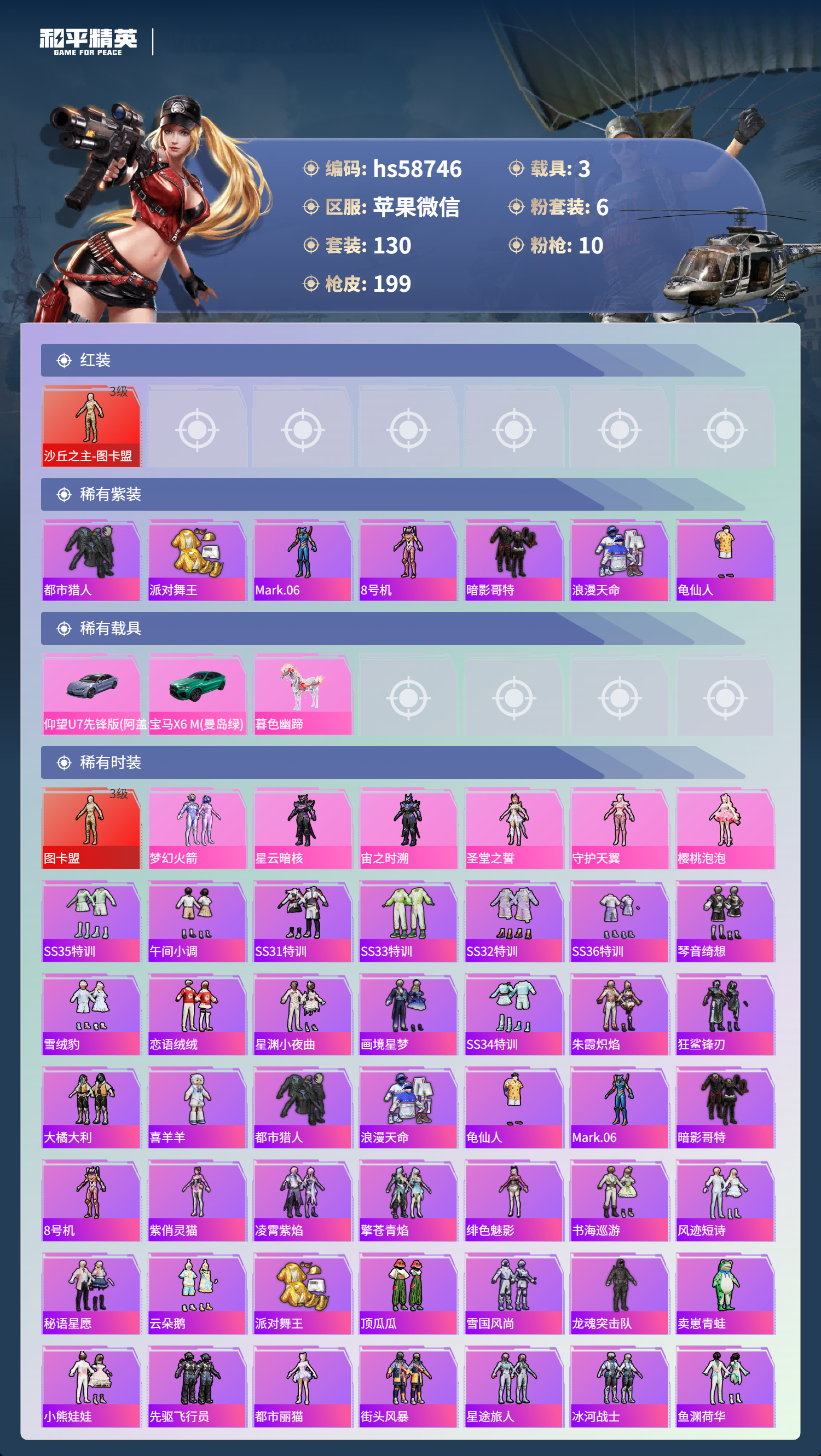 3载具-130套装-199呛皮-hs58746 苹果微信-13王牌印记-1红装-6粉装-10特效呛-3载具-72326热力值-130套装-199呛皮-7卓越印记-3传奇印记【1红装】沙丘之主-图卡盟/3级【6粉装】套装-梦幻火箭角色-樱桃泡泡角色-守护天翼角色-星云暗核角色-宙之时溯角色-圣堂之誓【10特效呛】m417-第五大道/6级p90-沙丘之主/3级ump45-量子极限/5级kar98k-巳巳如意/5