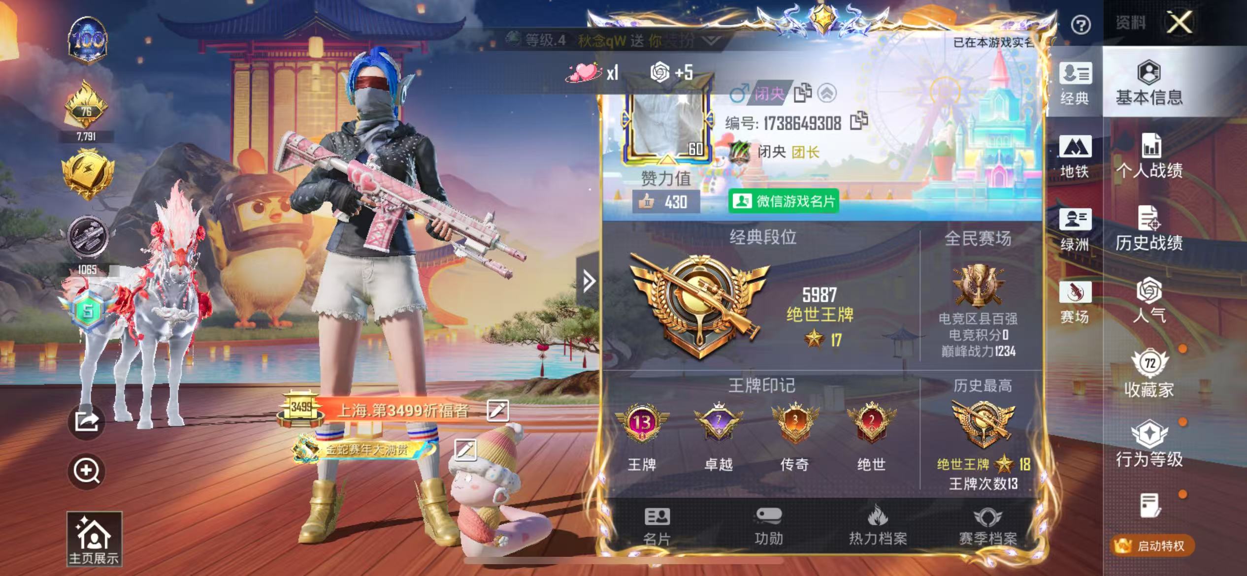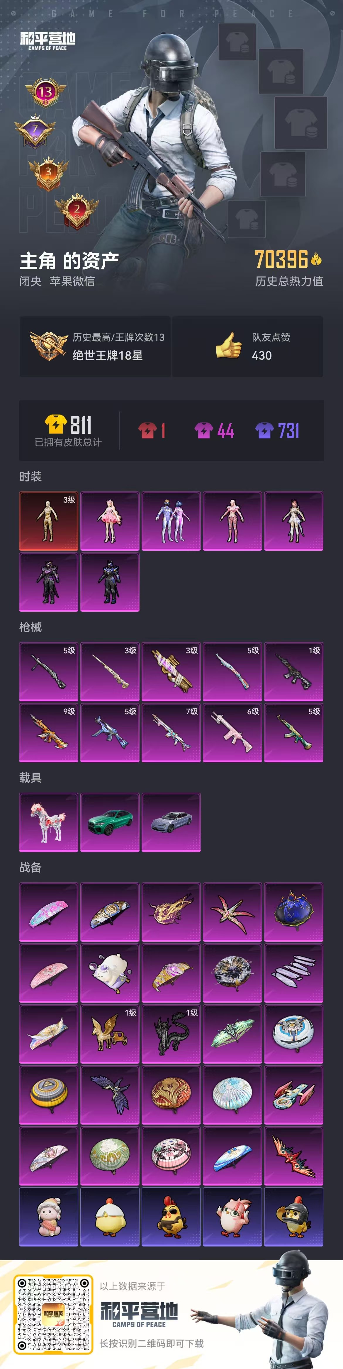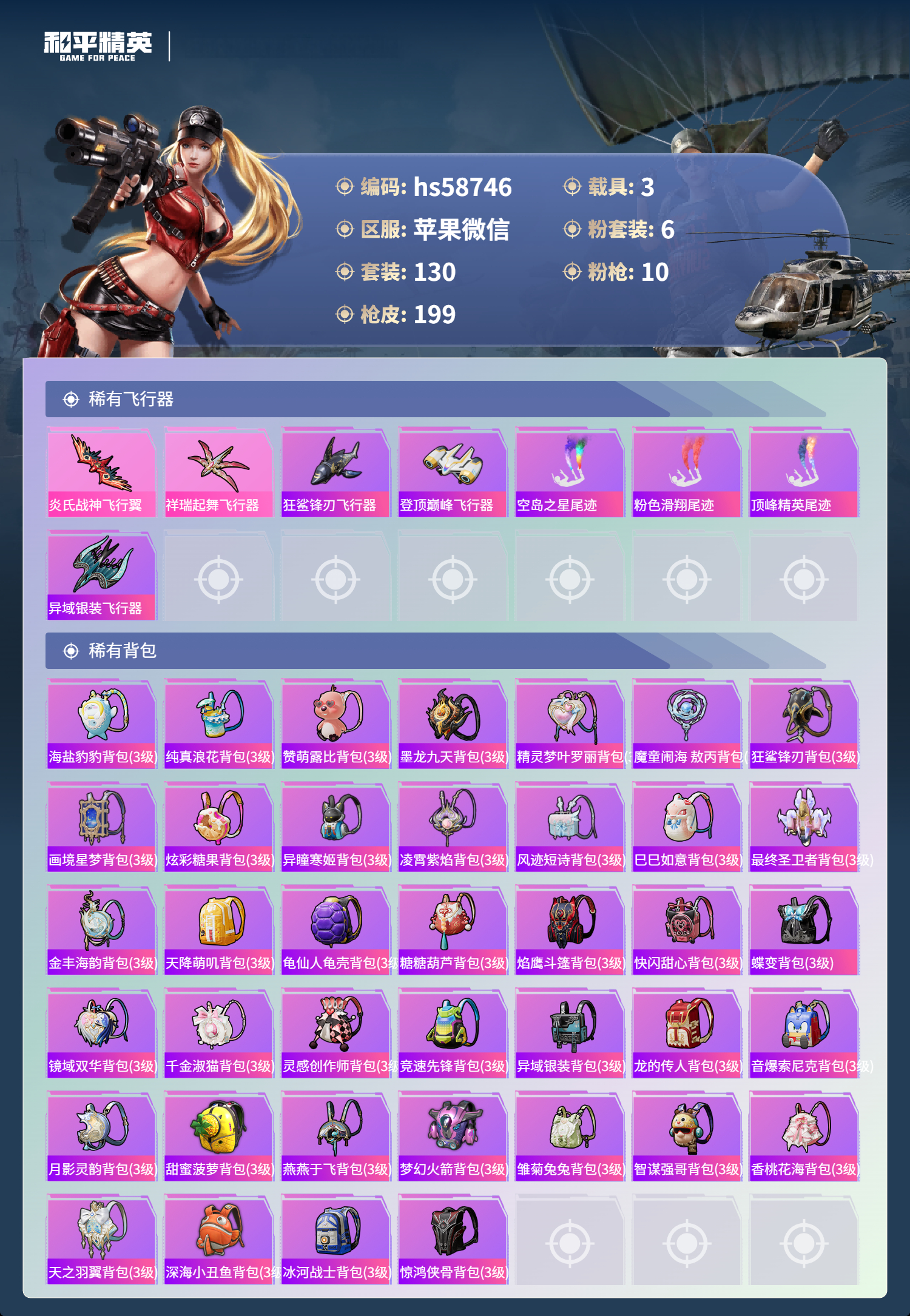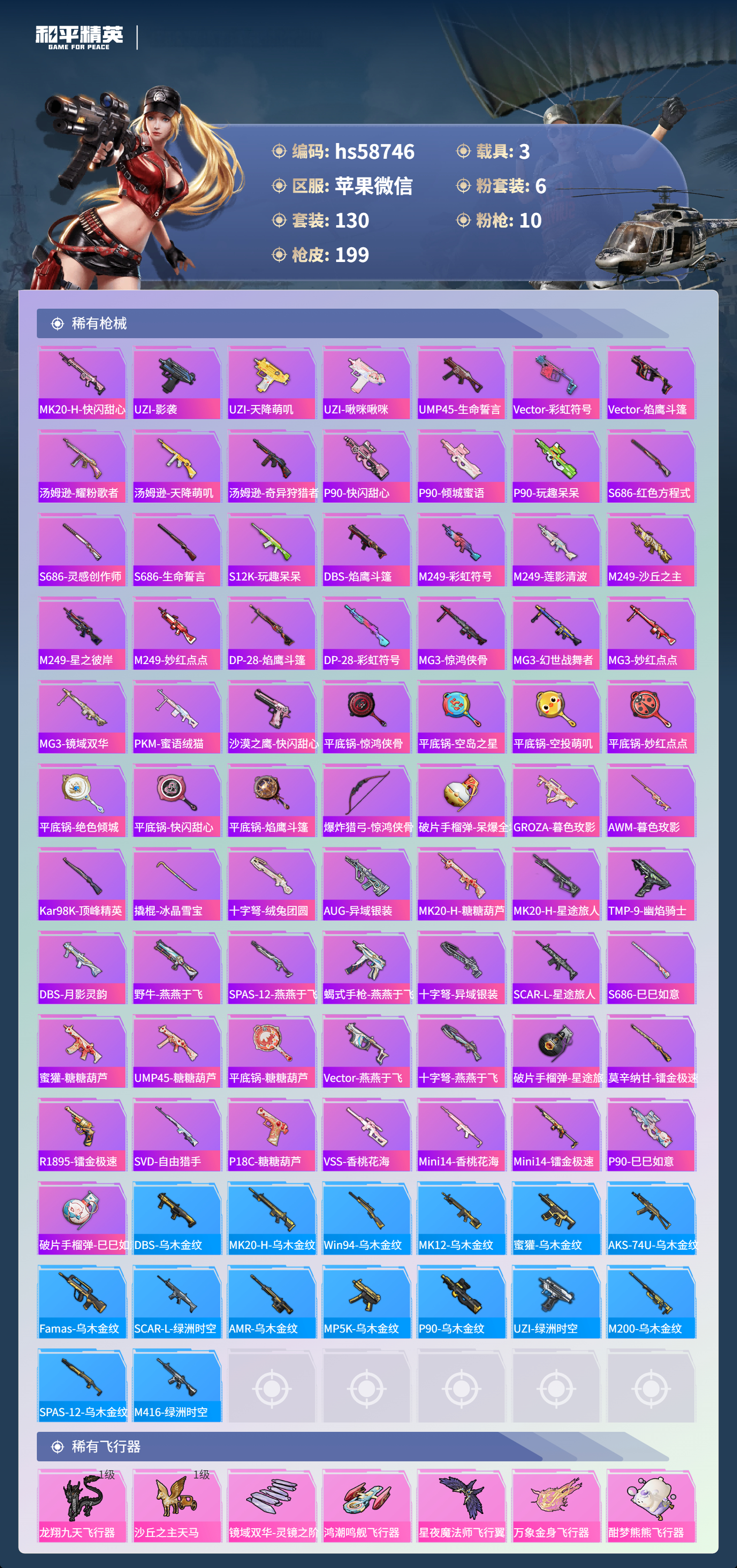 3载具-130套装-199呛皮-hs58746 苹果微信-13王牌印记-1红装-6粉装-10特效呛-3载具-72326热力值-130套装-199呛皮-7卓越印记-3传奇印记【1红装】沙丘之主-图卡盟/3级【6粉装】套装-梦幻火箭角色-樱桃泡泡角色-守护天翼角色-星云暗核角色-宙之时溯角色-圣堂之誓【10特效呛】m417-第五大道/6级p90-沙丘之主/3级ump45-量子极限/5级kar98k-巳巳如意/5