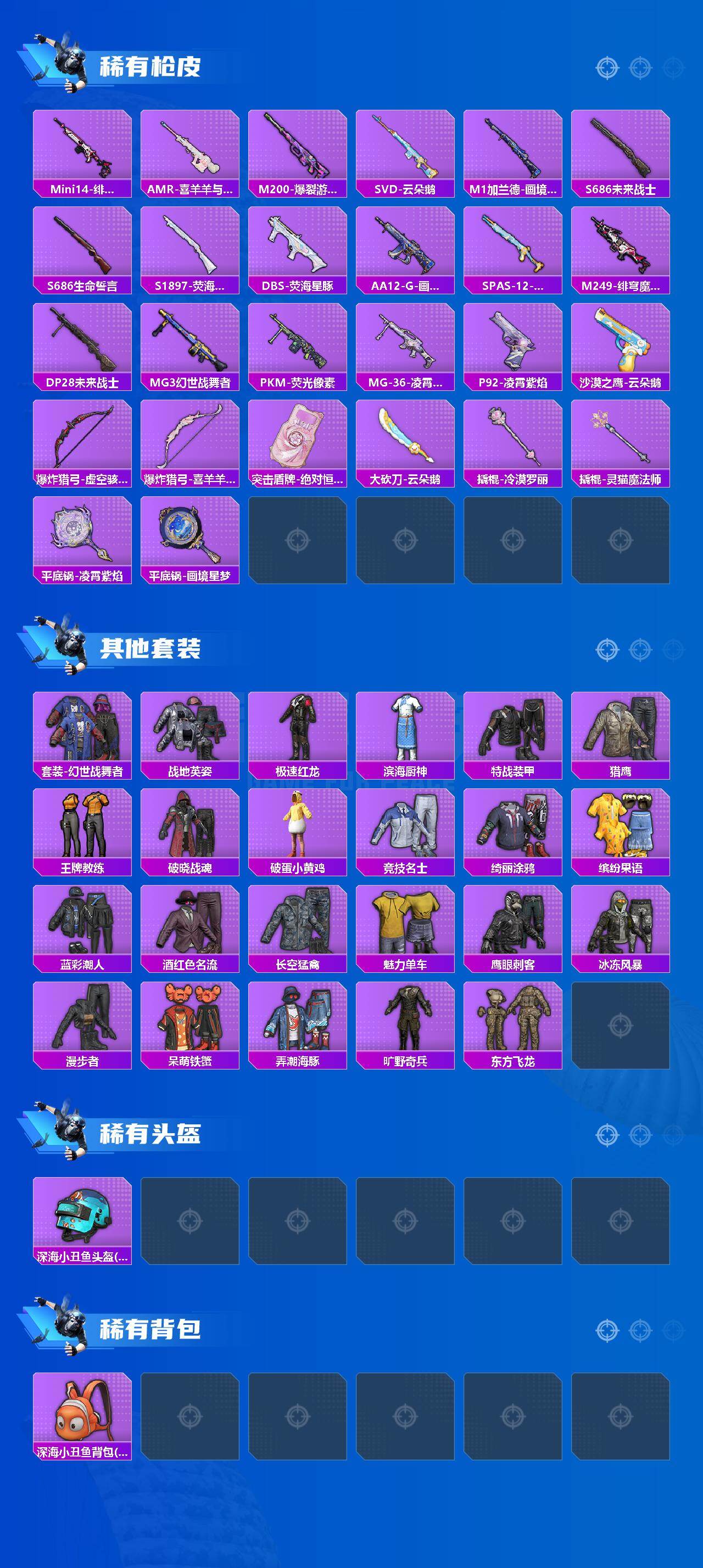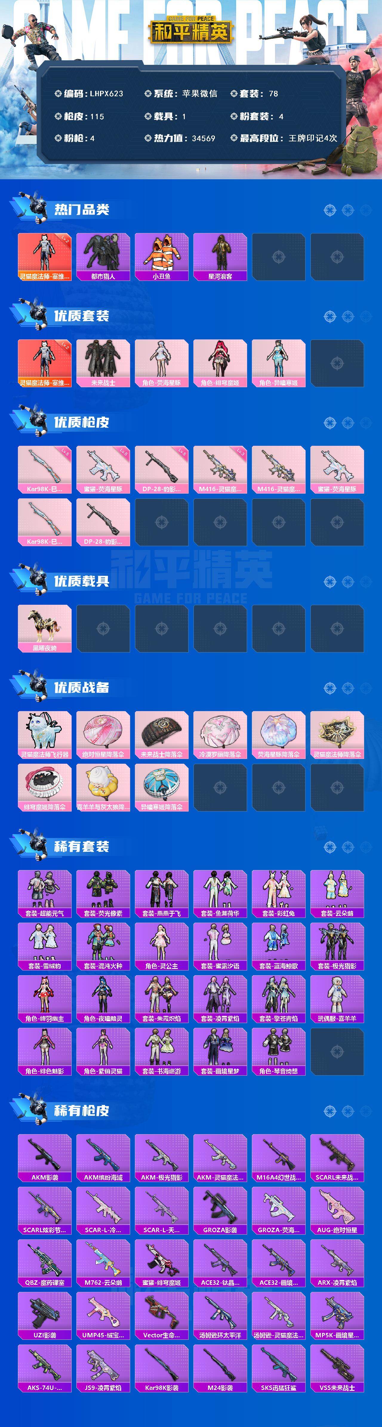 [15895837]【特价出售/店主推荐】苹果 微信-1神装-4粉装-4特效呛-1载具-2粉色飞行器-34569热力值-4王牌印记-78套装-115呛皮 【红色神装等级】:灵猫魔法师-塞维尔二级 【红色角色神装】:灵猫魔法师-塞维尔 【热门品类】:套装-都市猎人,套装-小丑鱼,套装-星河浪客 【粉色套装】:粉装-未来战士,角色-荧海星豚,角色-绯穹魔姬,角色-异瞳寒姬 【粉色呛皮等级】:m416-灵猫魔法师三级,蜜獾-荧海星豚五级,kar98k-巳巳如意五级,dp-28-豹影疾电五级 【粉色载具】:黑曜夜骑 【粉色呛皮】:m416-灵猫魔法师,蜜獾-荧海星豚,kar98k-巳巳如意,dp-28-豹影疾电 【粉色飞行器】:灵猫魔法师飞行器 【粉色降落伞】:绝对恒星降落伞,未来战士降落伞,冷漠罗丽降落伞,荧海星豚降落伞,灵猫魔法师降落伞,绯穹魔姬降落伞,喜羊羊与灰太狼降落伞,异瞳寒姬降落伞,炫彩糖果降落伞 【稀有套装】:套装-超能元气,套装-荧光像素,套装-雪国风尚,套装-炫彩糖果,套装-燕燕于飞,套装-鱼渊荷华,套装-彩虹兔,套装-云朵鹅,套装-雪绒豹,套装-混沌火种,角色-灵公主,套装-蜜露汐语,套装-蓝海鲸歌,套装-极光猎影,角色-绛羽幽主,角色-夜瞳黯灵,套装-朱霞炽焰,套装-凌霄紫焰,套装-擎苍青焰,玩偶服-喜羊羊,角色-绯色魅影,角色-紫俏灵猫,套装-书海巡游,套装-画境星梦,套装-琴音绮想 【稀有呛皮】:aug-冰晶雪宝,akm-影袭,akm-缤纷海域,akm-灵猫魔法师,akm-极光猎影,m16a4-幻世战舞者,scar-l-未来战士,scar-l-炫彩节奏,scar-l-冷漠罗丽,scar-l-天象三御,groza-影袭,groza-荧海星豚,aug-绝对恒星,q-魔药课室,m762-云朵鹅,蜜獾-绯穹魔姬,ace32-钛晶裂爪,ace32-画境星梦,arx-凌霄紫焰,uzi-影袭,ump45-绒宝小鹅,vect-生命誓言,汤姆逊-环太平洋,汤姆逊-灵猫魔法师,mp5k-画境星梦,aks-74u-极光猎影,aks-74u-荧光像素,js9-凌霄紫焰,kar98k-影袭,m24-影袭,sks-迅猛狂鲨,vss-未来战士,mini14-绯穹魔姬,amr-喜羊羊与灰太狼,m200-爆裂游戏,svd-云朵鹅,m1加兰德-画境星梦,s686-未来战士,