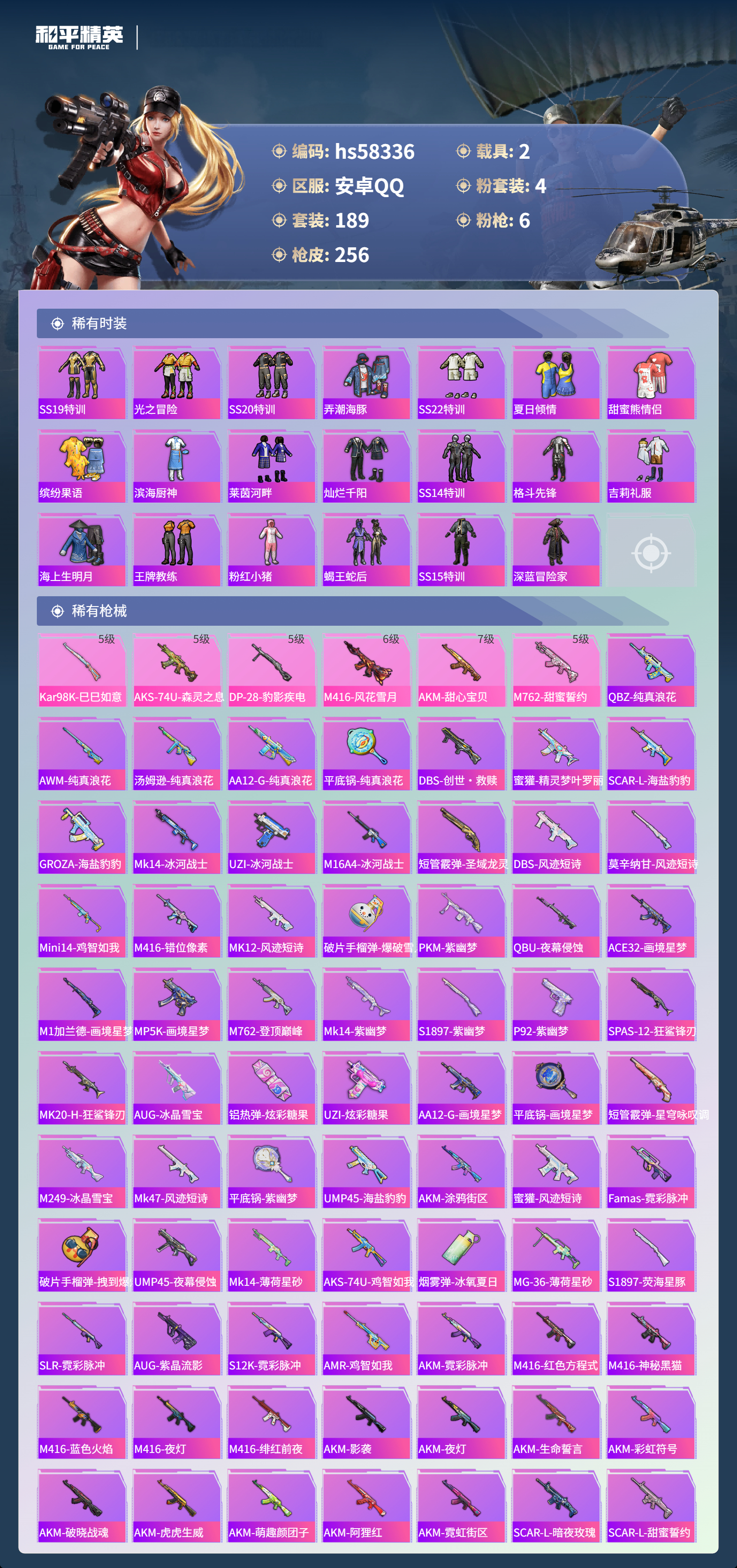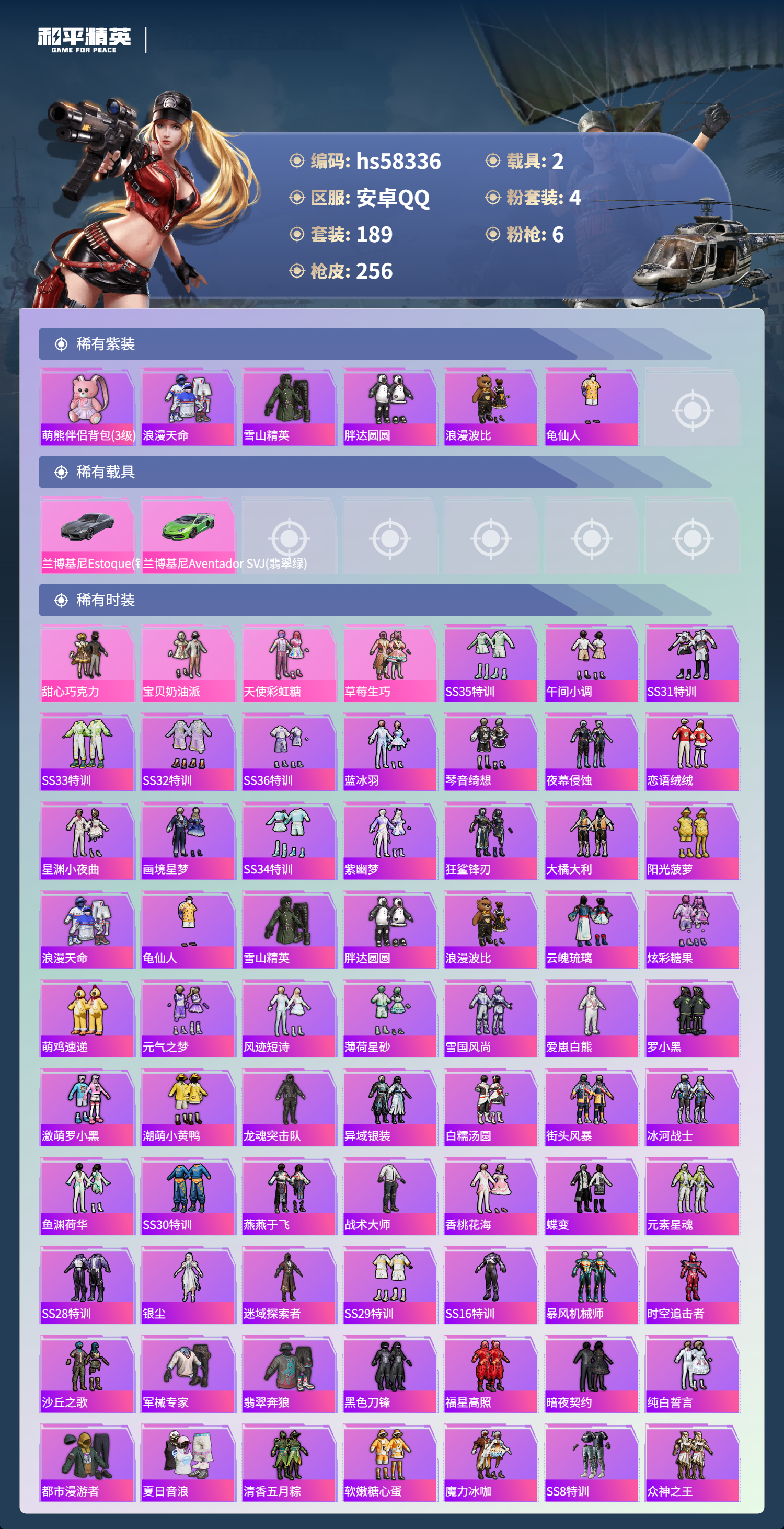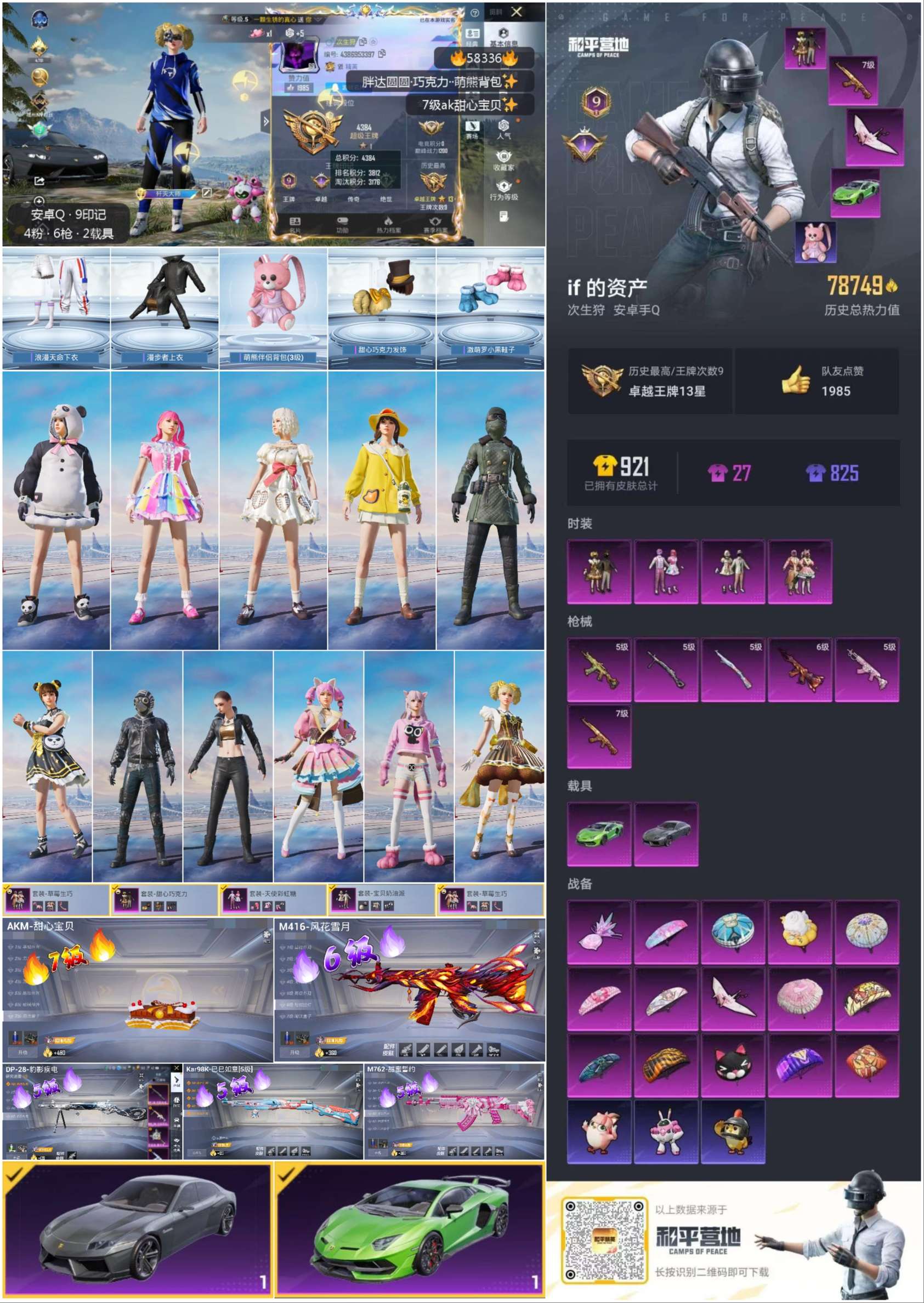 hs58336 安卓手q-9王牌印记-4粉装-6特效呛-2载具-79019热力值-189套装-256呛皮-1卓越印记【4粉装】套装-宝贝奶油派套装-甜心巧克力套装-草莓生巧套装-天使彩虹糖【6特效呛】kar98k-巳巳如意/5级m416-风花雪月/6级akm-甜心宝贝/7级m762-甜蜜誓约/5级aks-74u-森灵之息/5级dp-28-豹影疾电/5级【6稀有紫装】萌熊伴侣背