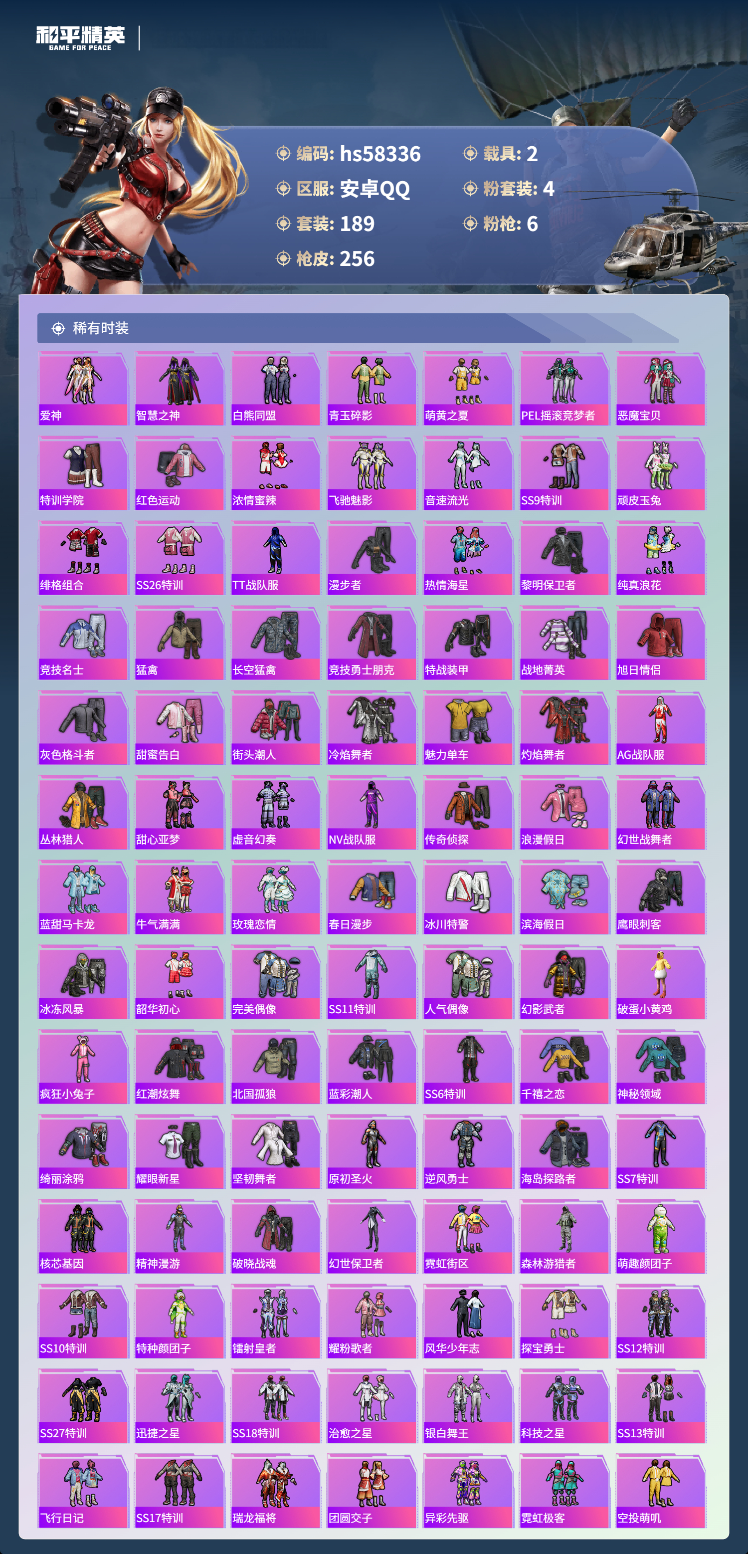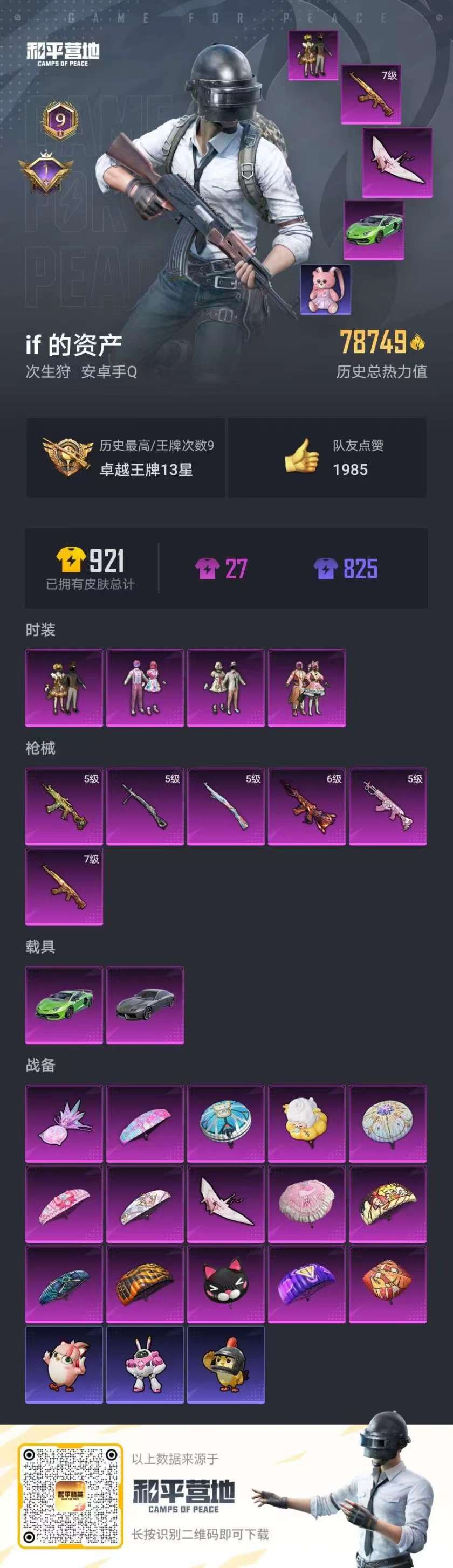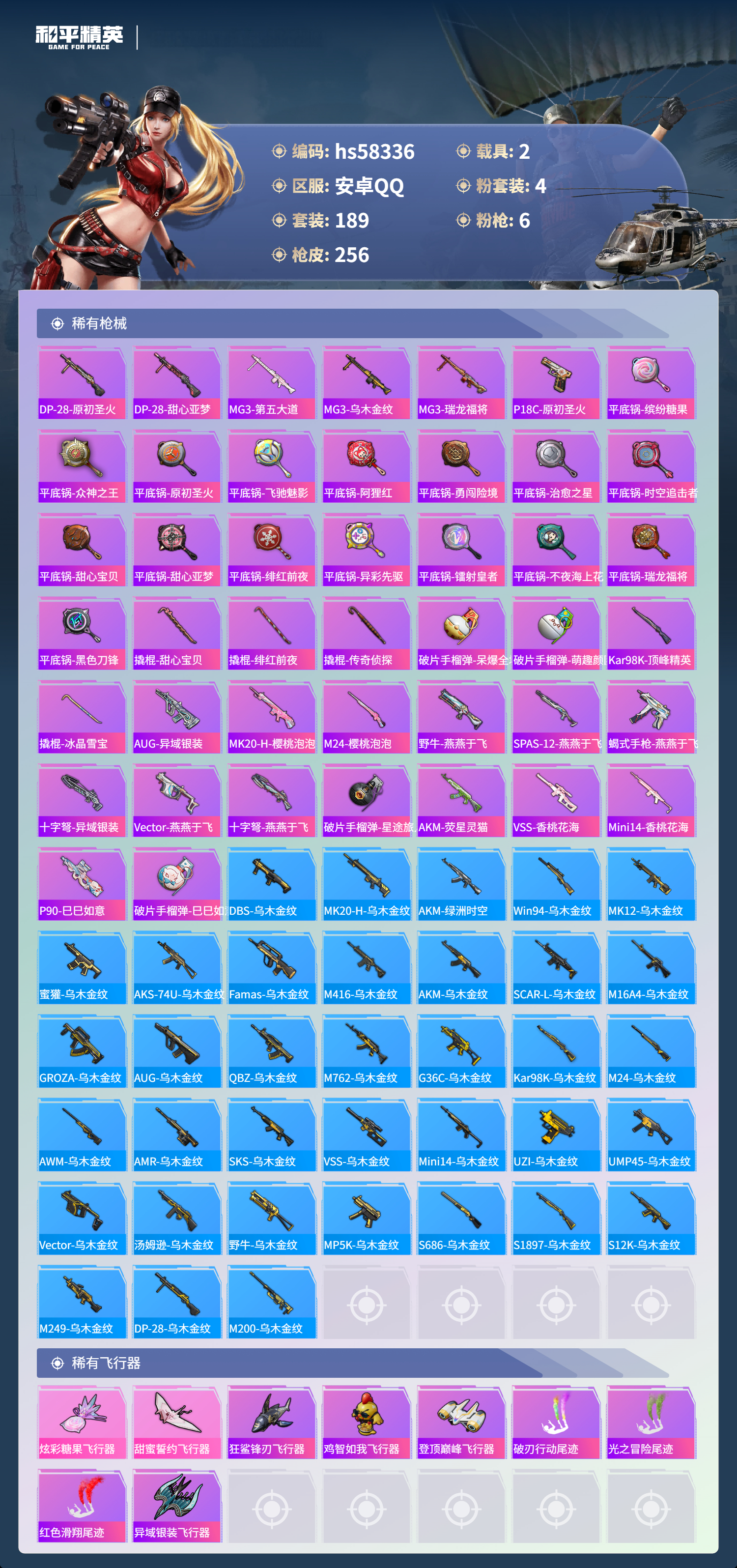 hs58336 安卓手q-9王牌印记-4粉装-6特效呛-2载具-79019热力值-189套装-256呛皮-1卓越印记【4粉装】套装-宝贝奶油派套装-甜心巧克力套装-草莓生巧套装-天使彩虹糖【6特效呛】kar98k-巳巳如意/5级m416-风花雪月/6级akm-甜心宝贝/7级m762-甜蜜誓约/5级aks-74u-森灵之息/5级dp-28-豹影疾电/5级【6稀有紫装】萌熊伴侣背