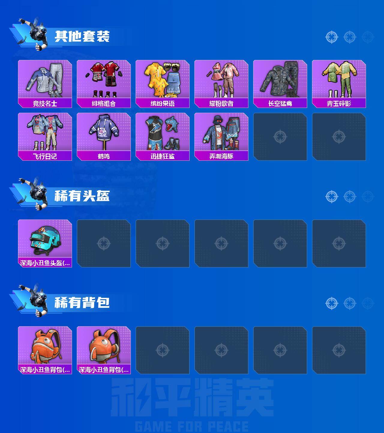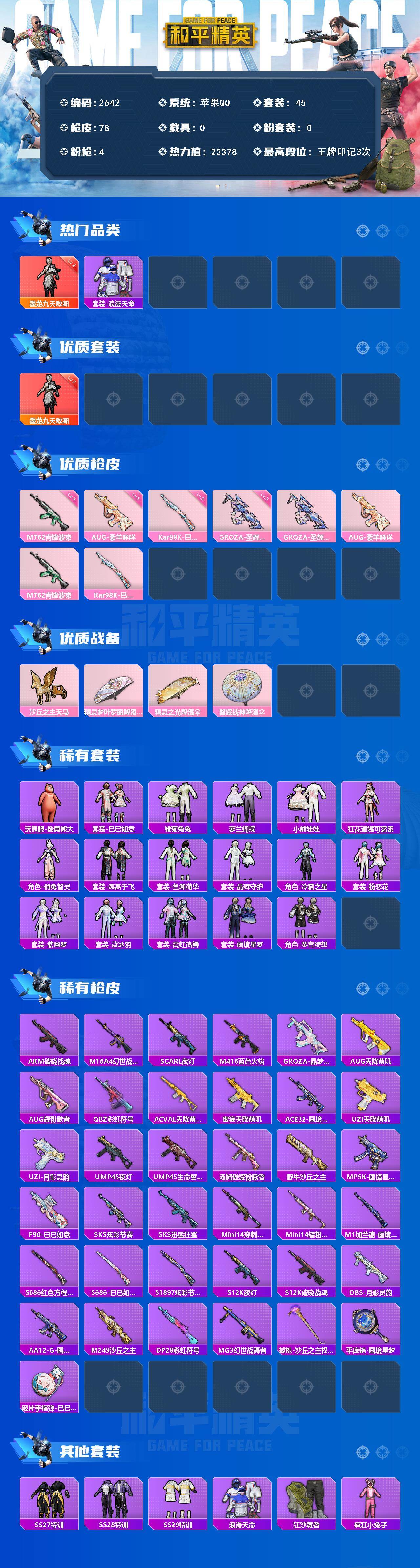0载具-45套装-78呛皮-45套装/呛械4/装备101/战备56/王牌印记3/热力值23378/三级groza-圣辉之星/五级aug-暖羊咩咩/五级m762-青锋波束/三级kar98k-巳巳如意/二级墨龙九天-敖渊/墨龙九天-敖渊/套装-浪漫天命/groza-圣辉之星/aug-暖羊咩咩/m762-青锋波束/kar98k-巳巳如意/沙丘之主天马/精灵梦叶罗丽降落伞/精灵之光降落伞/智耀战神降落伞/酷勇熊大/巳巳如意/套装