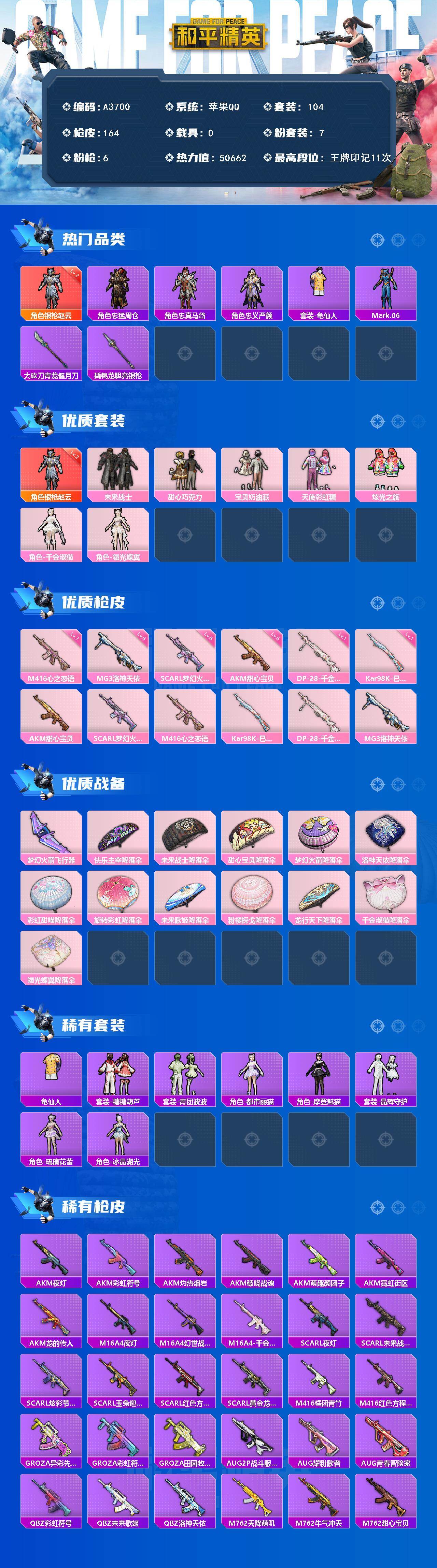 [15626912]苹果【小号/角色-银呛赵云二级/甜心巧克力】 手q-1神装-7粉装-6特效呛-0载具-1粉色飞行器-50662热力值-11王牌印记-104套装-164呛皮 【红色神装等级】:角色-银呛赵云二级 【红色角色神装】:角色-银呛赵云 【热门品类】:角色-忠猛周仓,角色-忠真马岱,角色-忠义严颜,套装-龟仙人,角色-mark.06,大砍刀-青龙偃月刀,撬棍-龙胆亮银呛 【粉色套装】:粉装-未来战士,粉装-甜心巧克力,粉装-宝贝奶油派,粉装-天使彩虹糖,粉装-炫光之旅,角色-千金淑猫,角色-翎光蝶翼 【粉色呛皮等级】:akm-甜心宝贝五级,scar-l-梦幻火箭五级,m416-心之恋语七级,kar98k-巳巳如意一级,dp-28-千金淑猫一级,mg3-洛神天依六级 【粉色呛皮】:akm-甜心宝贝,scar-l-梦幻火箭,m416-心之恋语,kar98k-巳巳如意,dp-28-千金淑猫,mg3-洛神天依 【粉色飞行器】:梦幻火箭飞行器 【粉色降落伞】:快乐主宰降落伞,未来战士降落伞,甜心宝贝降落伞,梦幻火箭降落伞,洛神天依降落伞,彩虹甜喵降落伞,旋转彩虹降落伞,未来歌姬降落伞,粉樱探戈降落伞,龙行天下降落伞,千金淑猫降落伞,翎光蝶翼降落伞 【稀有套装】:套装-龟仙人,套装-糖糖葫芦,套装-青团波波,角色-都市丽猫,角色-摩登魅猫,套装-晶辉守护,角色-琉璃花蕾,角色-冰晶湖光 【稀有呛皮】:akm-夜灯,akm-彩虹符号,akm-灼热熔岩,akm-破晓战魂,akm-萌趣颜团子,akm-霓虹街区,akm-龙的传人,m16a4-夜灯,m16a4-幻世战舞者,m16a4-千金淑猫,scar-l-夜灯,scar-l-未来战士,scar-l-炫彩节奏,scar-l-玉兔迎春,scar-l-红色方程式,scar-l-黄金龙骨,m416-糯团青竹,m416-红色方程式,groza-异彩先驱,groza-彩虹符号,groza-田园牧歌,aug-2p战斗服款,aug-耀粉歌者,aug-青春冒险家,q-彩虹符号,q-未来歌姬,q-洛神天依,m762-天降萌叽,m762-牛气冲天,m762-甜心宝贝,mk47-妙红点点,mk47-洛神天依,mk47-炫光之旅,ac-val-天降萌叽,ac-val-彩虹甜喵,蜜獾-垂柳戏鸭,蜜獾-天降萌叽,蜜獾-娇憨猪猪,