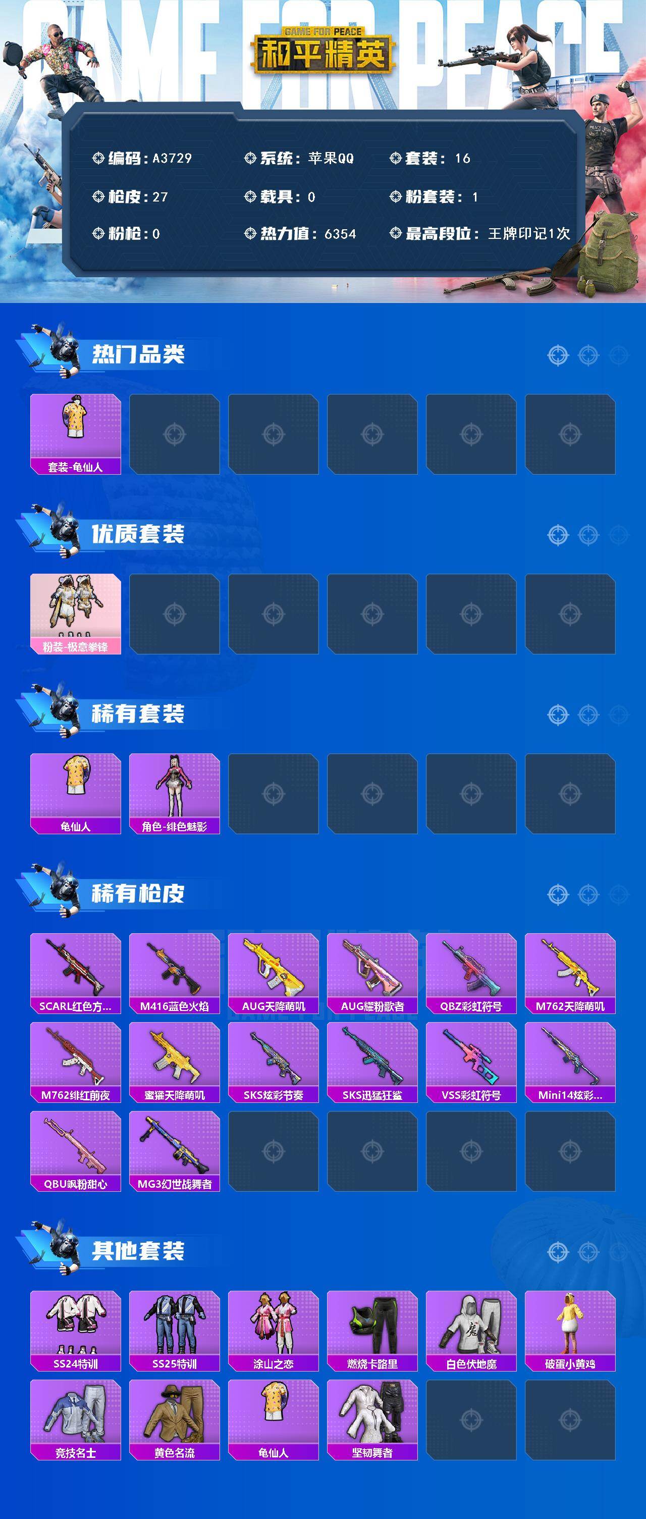 [15634752]苹果【小号 粉装-极意拳锋/scar-l-红色方程式/m416-蓝色火焰/套装-龟仙人/炫彩糖果降落伞】 手q-1粉装-0特效呛-0载具-1粉色飞行器-6354热力值-1王牌印记-16套装-27呛皮 【热门品类】:套装-龟仙人 【粉色套装】:粉装-极意拳锋 【粉色降落伞】:炫彩糖果降落伞 【稀有套装】:套装-龟仙人,套装-雪国风尚,角色-绯色魅影,套装-炫彩糖果 【稀有呛皮】:scar-l-红色方程式,m416-蓝色火焰,aug-天降萌叽,aug-耀粉歌者,q-彩虹符号,m762-天降萌叽,m762-绯红前夜,蜜獾-天降萌叽,sks-炫彩节奏,sks-迅猛狂鲨,vss-彩虹符号,mini14-炫彩节奏,qbu-飒粉甜心,mg3-幻世战舞者 【其他套装】:套装-ss24特训,套装-ss25特训,套装-涂山之恋,套装-燃烧卡路里,套装-白色伏地魔,套装-破蛋小黄鸡,套装-竞技名士,套装-黄色名流,套装-龟仙人,套装-坚韧舞者 【营地id】:934144712