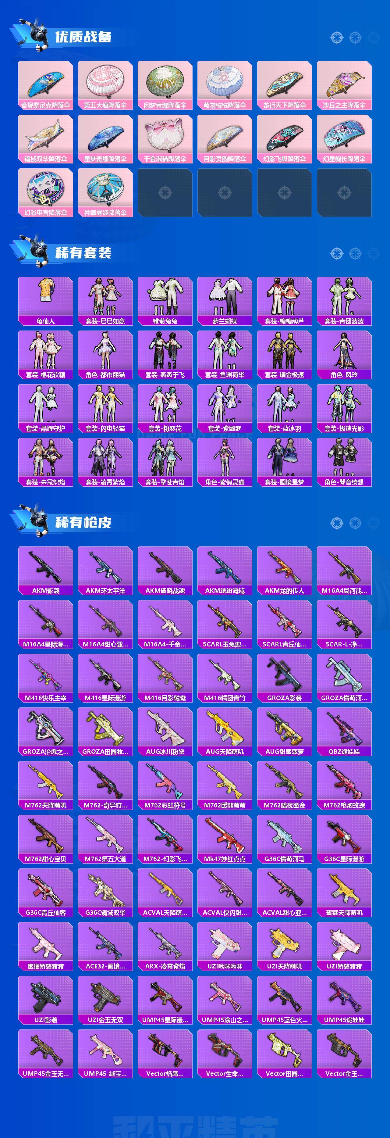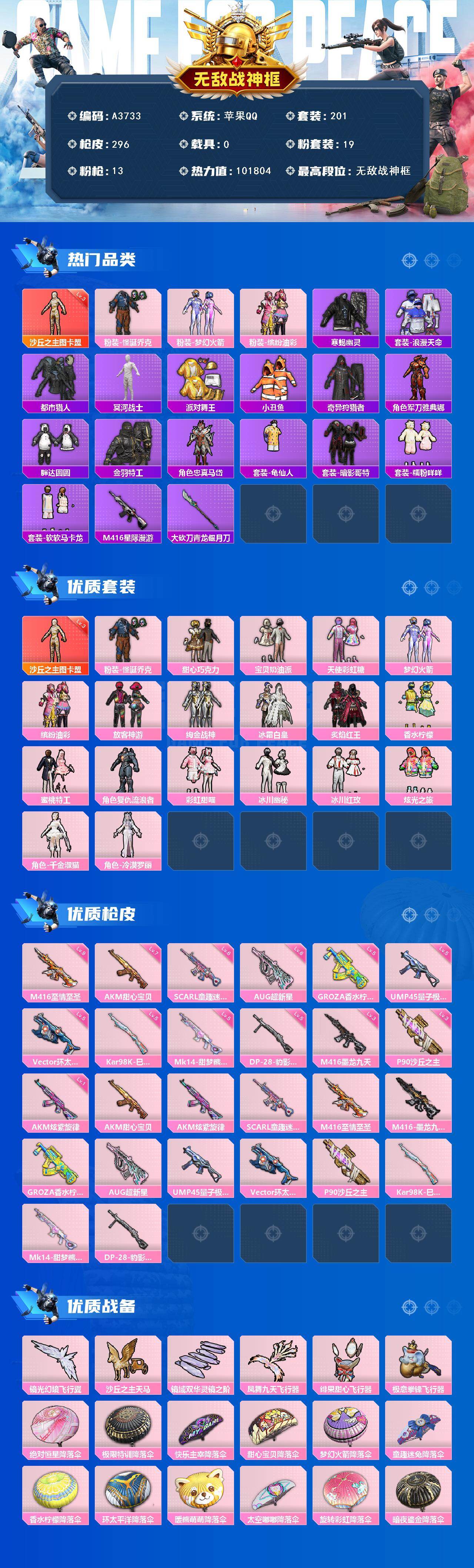 [15634920]苹果【极品男神号 沙丘之主-图卡盟/粉装-怪诞乔克/粉装-梦幻火箭/akm-甜心宝贝/akm-炫紫旋律】 手q-无敌战神框-1神装-19粉装-13特效呛-0载具-8粉色飞行器-101804热力值-17王牌印记-201套装-296呛皮 【红色神装等级】:沙丘之主-图卡盟三级 【红色角色神装】:沙丘之主-图卡盟 【热门品类】:粉装-怪诞乔克,粉装-梦幻火箭,粉装-缤纷油彩,套装-寒蝎幽灵,套装-浪漫天命,套装-都市猎人,套装-冥河战士,套装-派对舞王,套装-小丑鱼,套装-奇异狩猎者,角色-军刀雅典娜,套装-胖达圆圆,套装-金羽特工,角色-忠真马岱,套装-龟仙人,套装-暗影哥特,套装-糯粉咩咩,套装-软软马卡龙,m416-星际漫游,大砍刀-青龙偃月刀 【粉色套装】:粉装-怪诞乔克,粉装-甜心巧克力,粉装-宝贝奶油派,粉装-天使彩虹糖,粉装-梦幻火箭,粉装-缤纷油彩,粉装-放客神游,粉装-绚金战神,粉装-冰霜白皇,粉装-炙焰红王,粉装-香水柠檬,粉装-蜜桃特工,角色-复仇流浪者,粉装-彩虹甜喵,粉装-冰川幽秘,粉装-冰川红玫,粉装-炫光之旅,角色-千金淑猫,角色-冷漠罗丽 【粉色呛皮等级】:akm-甜心宝贝七级,akm-炫紫旋律一级,scar-l-童趣迷兔六级,m416-至情至圣九级,m416-墨龙九天三级,groza-香水柠檬五级,aug-超新星六级,ump45-量子极限五级,vect-环太平洋五级,p90-沙丘之主三级,kar98k-巳巳如意五级,mk14-甜梦熊击五级,dp-28-豹影疾电五级 【粉色呛皮】:akm-甜心宝贝,akm-炫紫旋律,scar-l-童趣迷兔,m416-至情至圣,m416-墨龙九天,groza-香水柠檬,aug-超新星,ump45-量子极限,vect-环太平洋,p90-沙丘之主,kar98k-巳巳如意,mk14-甜梦熊击,dp-28-豹影疾电 【粉色飞行器】:镜光幻境飞行翼,沙丘之主天马,镜域双华-灵镜之阶,凤舞九天飞行器,绯果甜心飞行器,极意拳锋飞行器 【粉色降落伞】:绝对恒星降落伞,极限特训降落伞,快乐主宰降落伞,甜心宝贝降落伞,梦幻火箭降落伞,童趣迷兔降落伞,香水柠檬降落伞,环太平洋降落伞,暖熊萌萌降落伞,太空嘟嘟降落伞,旋转彩虹降落伞,暗夜鎏金降落伞,音爆索尼克降落伞,第