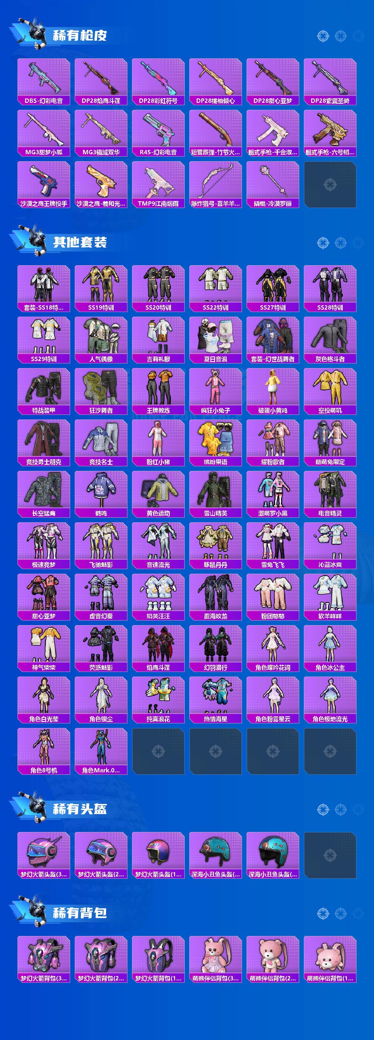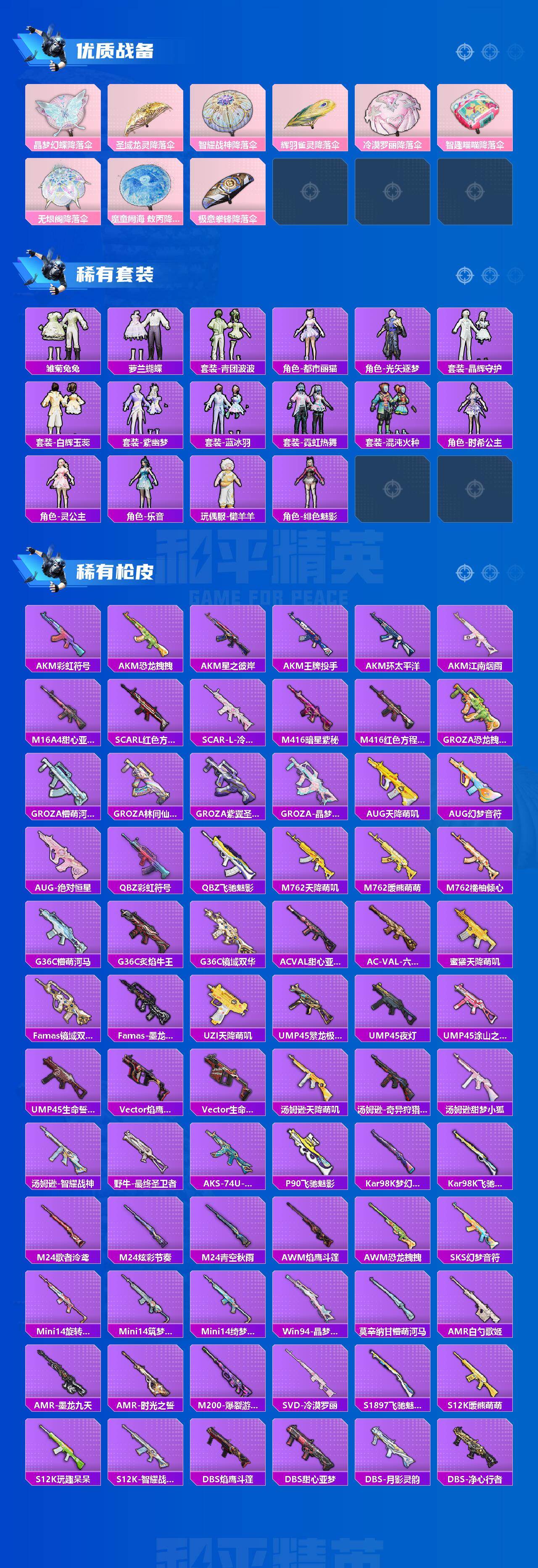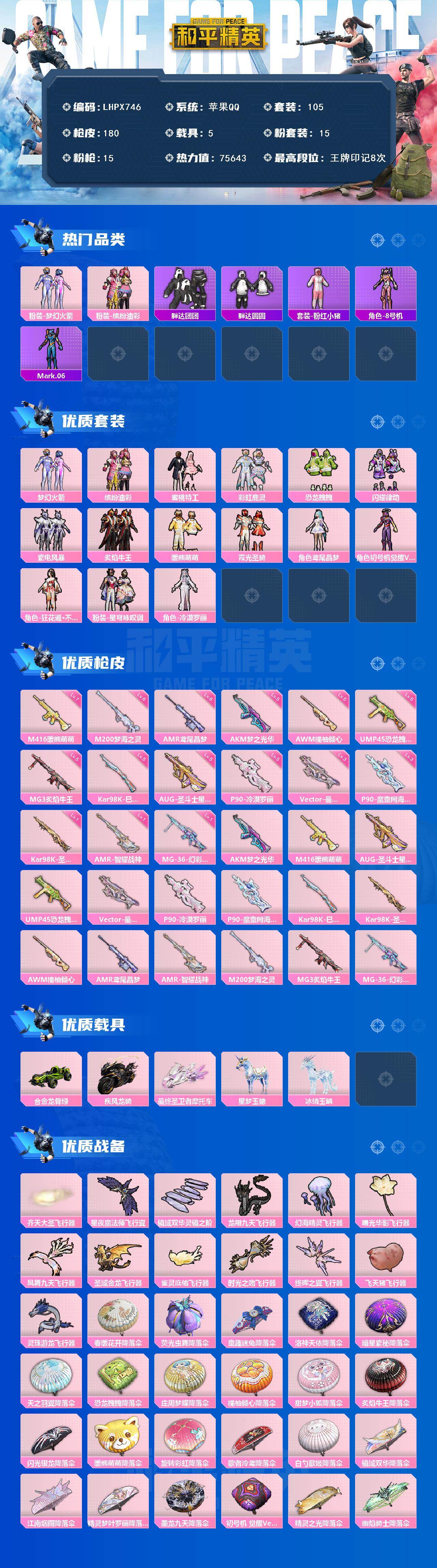 [15913876]连体王者v8苹果 手q-15粉装-15特效呛-5载具-14粉色飞行器-75643热力值-8王牌印记-105套装-180呛皮 【热门品类】:粉装-梦幻火箭,粉装-缤纷油彩,套装-胖达团团,套装-胖达圆圆,套装-粉红小猪,角色-8号机,角色-mark.06 【粉色套装】:粉装-梦幻火箭,粉装-缤纷油彩,粉装-蜜桃特工,粉装-彩虹鹿灵,粉装-恐龙拽拽,粉装-闪耀律动,粉装-紫电风暴,粉装-炙焰牛王,粉装-暖熊萌萌,粉装-霞光圣骑,角色-鸢尾晶梦,角色-初号机 觉醒ver.,角色-狂花道·不知火舞,粉装-星穹咏叹调,角色-冷漠罗丽 【粉色呛皮等级】:akm-梦之光华五级,m416-暖熊萌萌七级,aug-圣斗士星矢五级,ump45-恐龙拽拽五级,vect-最终圣卫者三级,p90-冷漠罗丽五级,p90-魔童闹海 敖丙三级,kar98k-巳巳如意五级,kar98k-圣域龙灵一级,awm-橘柚倾心五级,amr-鸢尾晶梦六级,amr-智耀战神一级,m200-梦海之灵六级,mg3-炙焰牛王五级,mg-36-幻彩电音一级 【粉色载具】:合金龙骨(绿),疾风龙骑,最终圣卫者摩托车,星梦玉骢,冰绡玉鳞 【粉色呛皮】:akm-梦之光华,m416-暖熊萌萌,aug-圣斗士星矢,ump45-恐龙拽拽,vect-最终圣卫者,p90-冷漠罗丽,p90-魔童闹海 敖丙,kar98k-巳巳如意,kar98k-圣域龙灵,awm-橘柚倾心,amr-鸢尾晶梦,amr-智耀战神,m200-梦海之灵,mg3-炙焰牛王,mg-36-幻彩电音 【粉色飞行器】:齐天大圣飞行器,星夜魔法师飞行翼,镜域双华-灵镜之阶,龙翔九天飞行器,幻海精灵飞行器,曦光华影飞行器,凤舞九天飞行器,圣域金龙飞行器,雀灵庇佑飞行器,时光之吻飞行器,终晖之翼飞行器,飞天猪飞行器,灵珠游龙飞行器 【粉色降落伞】:春暖花开降落伞,荧光虫舞降落伞,童趣迷兔降落伞,洛神天依降落伞,暗星紫秘降落伞,天之羽翼降落伞,恐龙拽拽降落伞,庄周梦蝶降落伞,橘柚倾心降落伞,甜梦小狐降落伞,炙焰牛王降落伞,闪光银龙降落伞,暖熊萌萌降落伞,旋转彩虹降落伞,歌者泠鸢降落伞,白勺歌姬降落伞,镜域双华降落伞,江南烟雨降落伞,精灵梦叶罗丽降落伞,墨龙九天降落伞,初号机 觉醒ver.降落伞,精灵之光降落伞,幽焰骑