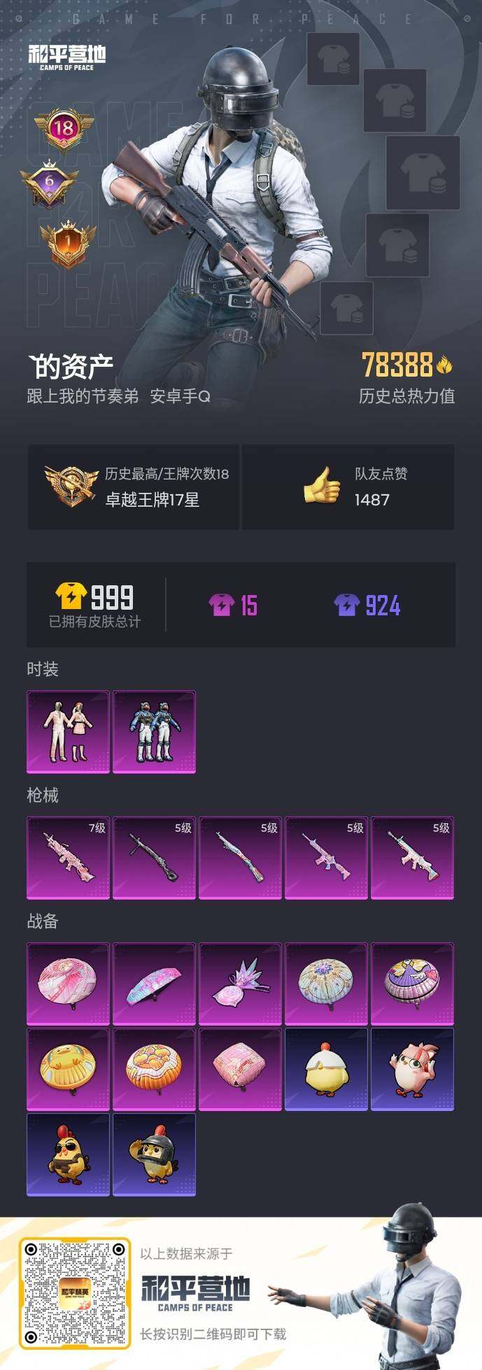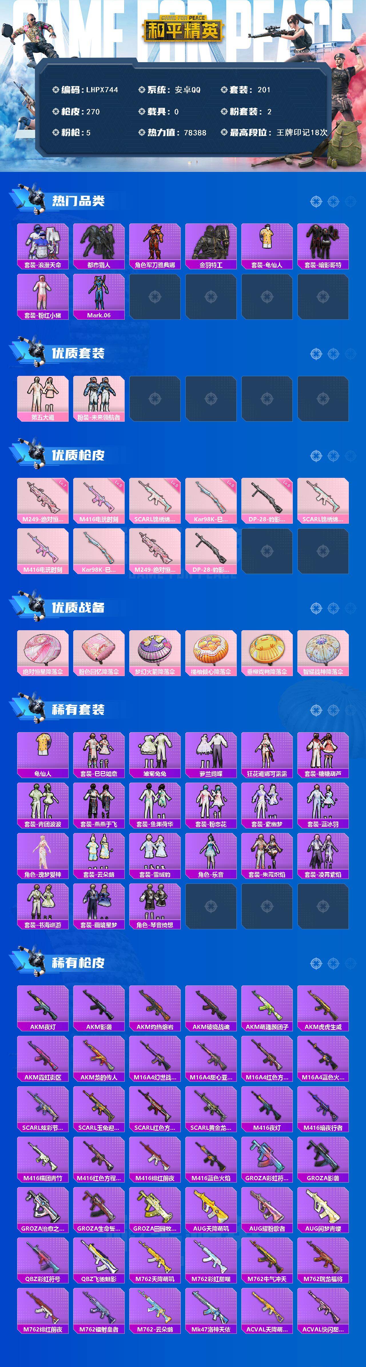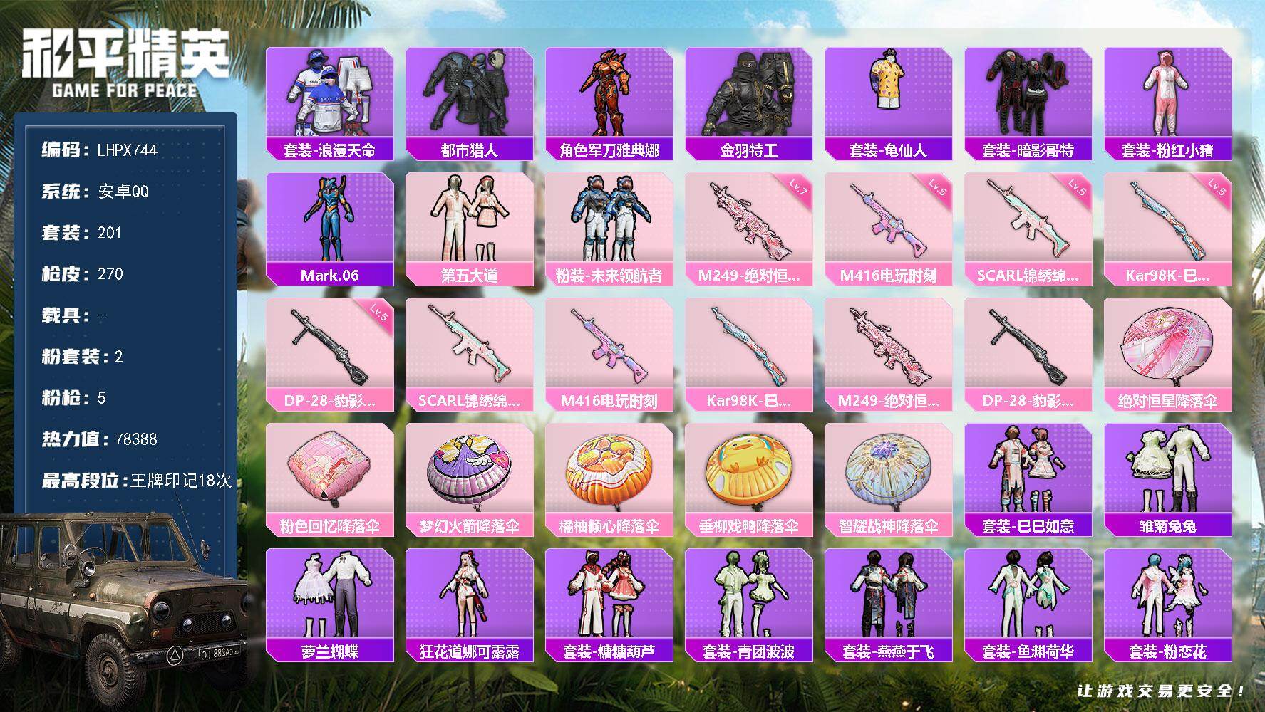 [15913877]【店主推荐捡漏号!可直接换绑】安卓 手q-2粉装-5特效呛-0载具-1粉色飞行器-78388热力值-18王牌印记-201套装-270呛皮 【热门品类】:套装-浪漫天命,套装-都市猎人,角色-军刀雅典娜,套装-金羽特工,套装-龟仙人,套装-暗影哥特,套装-粉红小猪,角色-mark.06 【粉色套装】:粉装-第五大道,粉装-未来领航者 【粉色呛皮等级】:scar-l-锦绣绵绵五级,m416-电玩时刻五级,kar98k-巳巳如意五级,m249-绝对恒星七级,dp-28-豹影疾电五级 【粉色呛皮】:scar-l-锦绣绵绵,m416-电玩时刻,kar98k-巳巳如意,m249-绝对恒星,dp-28-豹影疾电 【粉色降落伞】:绝对恒星降落伞,粉色回忆降落伞,梦幻火箭降落伞,橘柚倾心降落伞,垂柳戏鸭降落伞,智耀战神降落伞,炫彩糖果降落伞 【稀有套装】:套装-龟仙人,套装-巳巳如意,套装-雪国风尚,套装-炫彩糖果,套装-雏菊兔兔,套装-萝兰蝴蝶,角色-狂花道·娜可露露,套装-糖糖葫芦,套装-青团波波,套装-燕燕于飞,套装-鱼渊荷华,套装-粉恋花,套装-紫幽梦,套装-蓝冰羽,角色-瑰梦爱神,套装-云朵鹅,套装-雪绒豹,角色-乐音,套装-朱霞炽焰,套装-凌霄紫焰,套装-书海巡游,套装-画境星梦,套装-琴音绮想 【稀有呛皮】:aug-冰晶雪宝,akm-夜灯,akm-影袭,akm-灼热熔岩,akm-破晓战魂,akm-萌趣颜团子,akm-虎虎生威,akm-霓虹街区,akm-龙的传人,m16a4-幻世战舞者,m16a4-甜心亚梦,m16a4-红色方程式,m16a4-蓝色火焰,scar-l-炫彩节奏,scar-l-玉兔迎春,scar-l-红色方程式,scar-l-黄金龙骨,m416-夜灯,m416-暗夜行者,m416-糯团青竹,m416-红色方程式,m416-绯红前夜,m416-蓝色火焰,groza-彩虹符号,groza-影袭,groza-治愈之星,groza-生命誓言,groza-田园牧歌,aug-天降萌叽,aug-耀粉歌者,aug-闲梦青缨,q-彩虹符号,q-飞驰魅影,m762-天降萌叽,m762-彩虹甜喵,m762-牛气冲天,m762-瑞龙福将,m762-绯红前夜,m762-镭射皇者,m762-云朵鹅,mk47-洛神天依,ac-val-天降萌叽,ac-val-