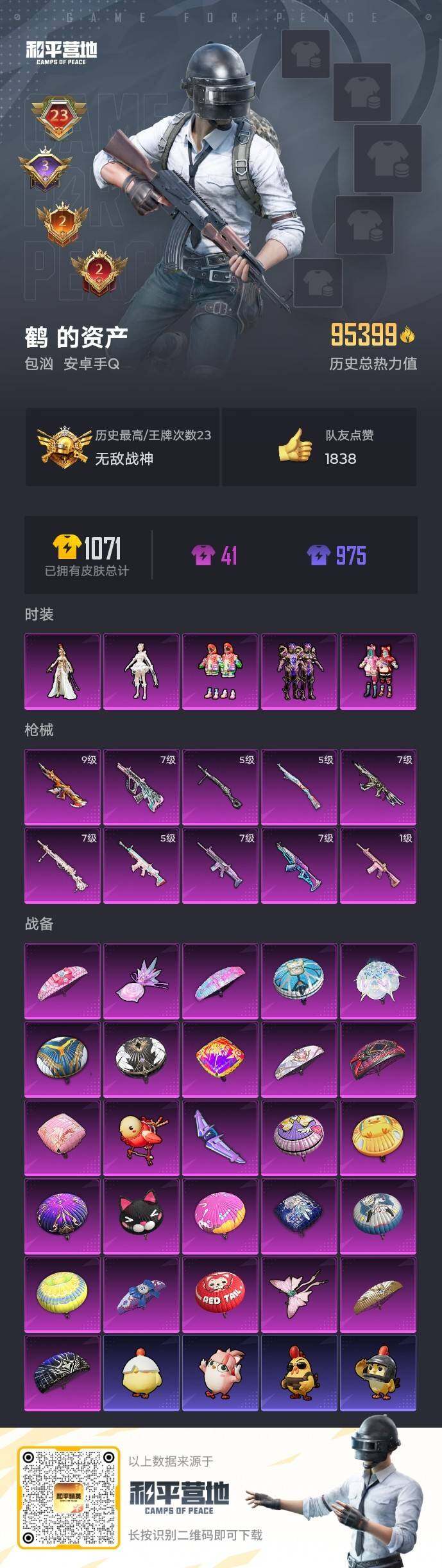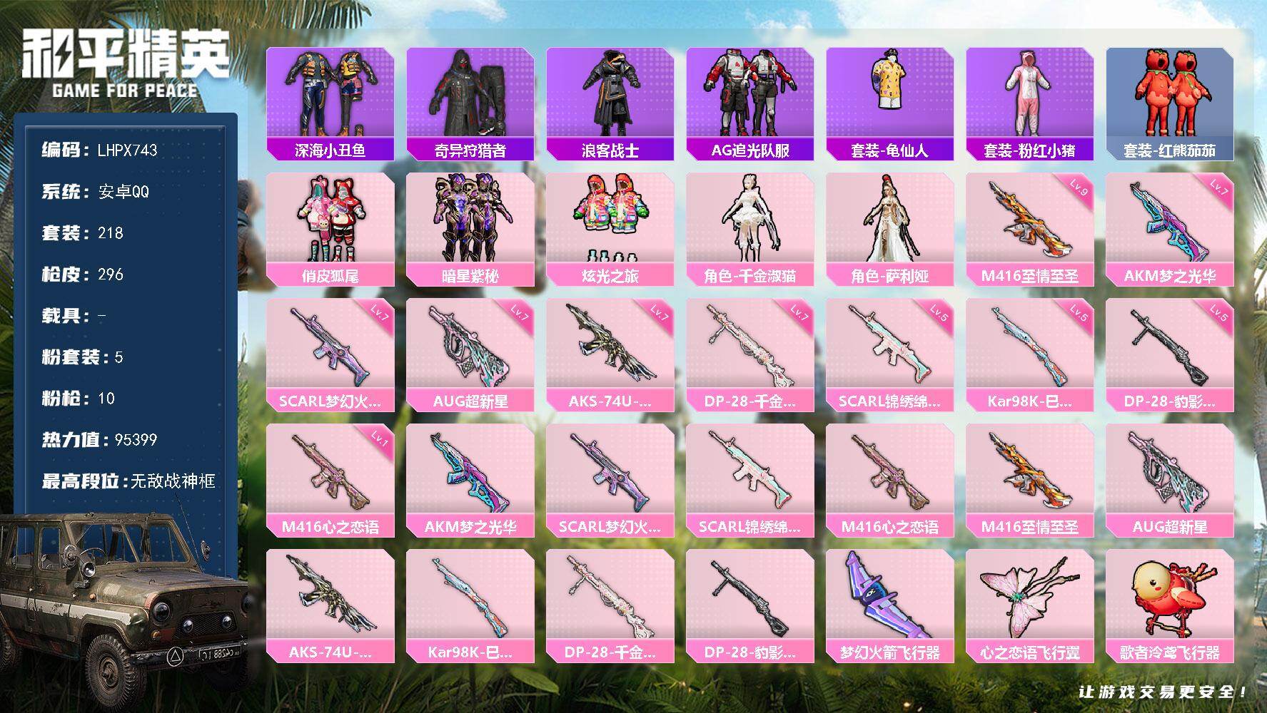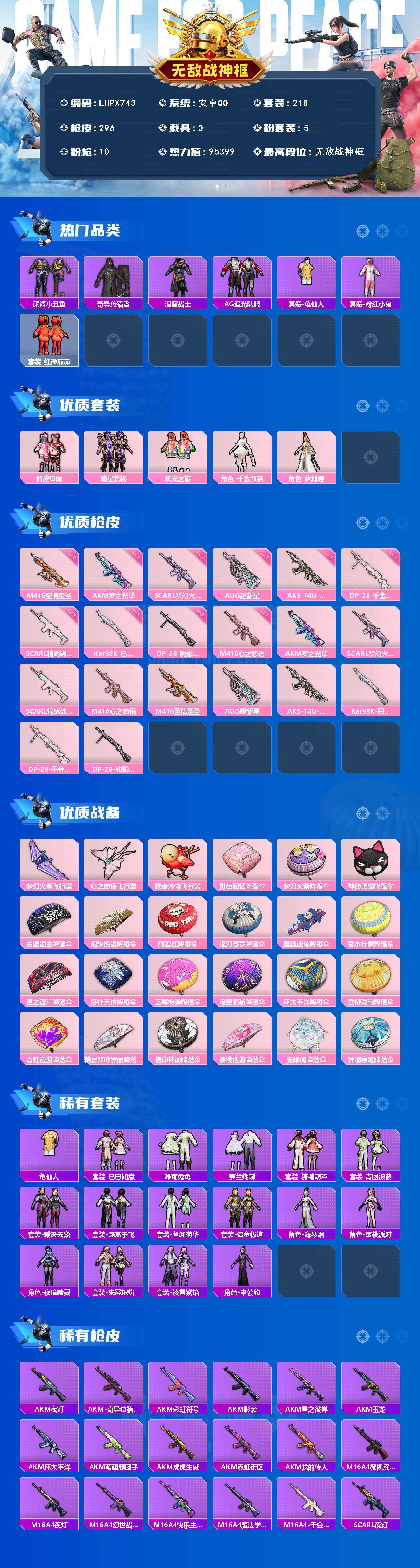 [15913891]【特价出售/店主推荐】安卓 手q-无敌战神框-5粉装-10特效呛-0载具-4粉色飞行器-95399热力值-23王牌印记-218套装-296呛皮 【热门品类】:套装-深海小丑鱼,套装-奇异狩猎者,套装-浪客战士,套装-ag追光队服,套装-龟仙人,套装-粉红小猪,套装-红熊茄茄 【粉色套装】:粉装-俏皮狐尾,粉装-暗星紫秘,粉装-炫光之旅,角色-千金淑猫,角色-萨利娅 【粉色呛皮等级】:akm-梦之光华七级,scar-l-梦幻火箭七级,scar-l-锦绣绵绵五级,m416-心之恋语一级,m416-至情至圣九级,aug-超新星七级,aks-74u-信仰神谕七级,kar98k-巳巳如意五级,dp-28-千金淑猫七级,dp-28-豹影疾电五级 【粉色呛皮】:akm-梦之光华,scar-l-梦幻火箭,scar-l-锦绣绵绵,m416-心之恋语,m416-至情至圣,aug-超新星,aks-74u-信仰神谕,kar98k-巳巳如意,dp-28-千金淑猫,dp-28-豹影疾电 【粉色飞行器】:梦幻火箭飞行器,心之恋语飞行翼,歌者泠鸢飞行器 【粉色降落伞】:粉色回忆降落伞,梦幻火箭降落伞,神秘黑猫降落伞,古堡领主降落伞,潮汐统领降落伞,阿狸红降落伞,银刃赛罗降落伞,童趣迷兔降落伞,香水柠檬降落伞,星之彼岸降落伞,洛神天依降落伞,蓝莓炮弹降落伞,暗星紫秘降落伞,环太平洋降落伞,垂柳戏鸭降落伞,霓虹漫游降落伞,精灵梦叶罗丽降落伞,信仰神谕降落伞,樱桃泡泡降落伞,无垠阁降落伞,异瞳寒姬降落伞,炫彩糖果降落伞 【稀有套装】:套装-龟仙人,套装-巳巳如意,套装-雪国风尚,套装-炫彩糖果,套装-雏菊兔兔,套装-萝兰蝴蝶,套装-糖糖葫芦,套装-青团波波,套装-裁决天象,套装-燕燕于飞,套装-鱼渊荷华,套装-镭金极速,角色-海琴烟,角色-蜜桃派对,角色-夜瞳黯灵,套装-朱霞炽焰,套装-凌霄紫焰,角色-申公豹 【稀有呛皮】:aug-冰晶雪宝,akm-夜灯,akm-奇异狩猎者,akm-彩虹符号,akm-影袭,akm-星之彼岸,akm-玉龙,akm-环太平洋,akm-萌趣颜团子,akm-虎虎生威,akm-霓虹街区,akm-龙的传人,m16a4-凝视深渊,m16a4-夜灯,m16a4-幻世战舞者,m16a4-快乐主宰,m16a4-魔法学院,m16a4-千金淑猫,sca