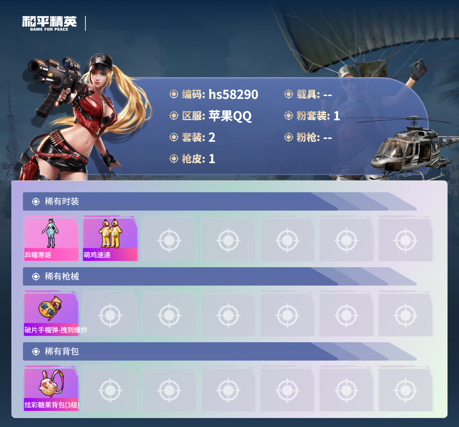 hs58290 苹果手q-0王牌印记-1粉装-908热力值-2套装-1呛皮【1粉装】角色-异瞳寒姬【2稀有时装】异瞳寒姬萌鸡速递【1稀有呛械】破片手留单-拽到爆炸【1稀有背包】炫彩糖果背包3级