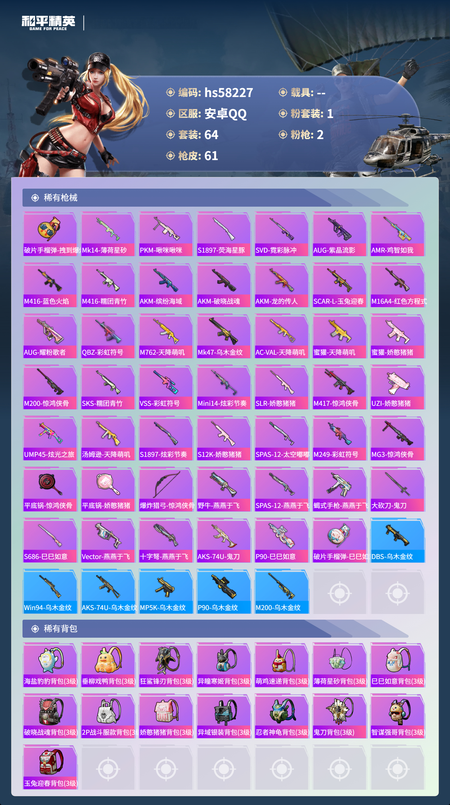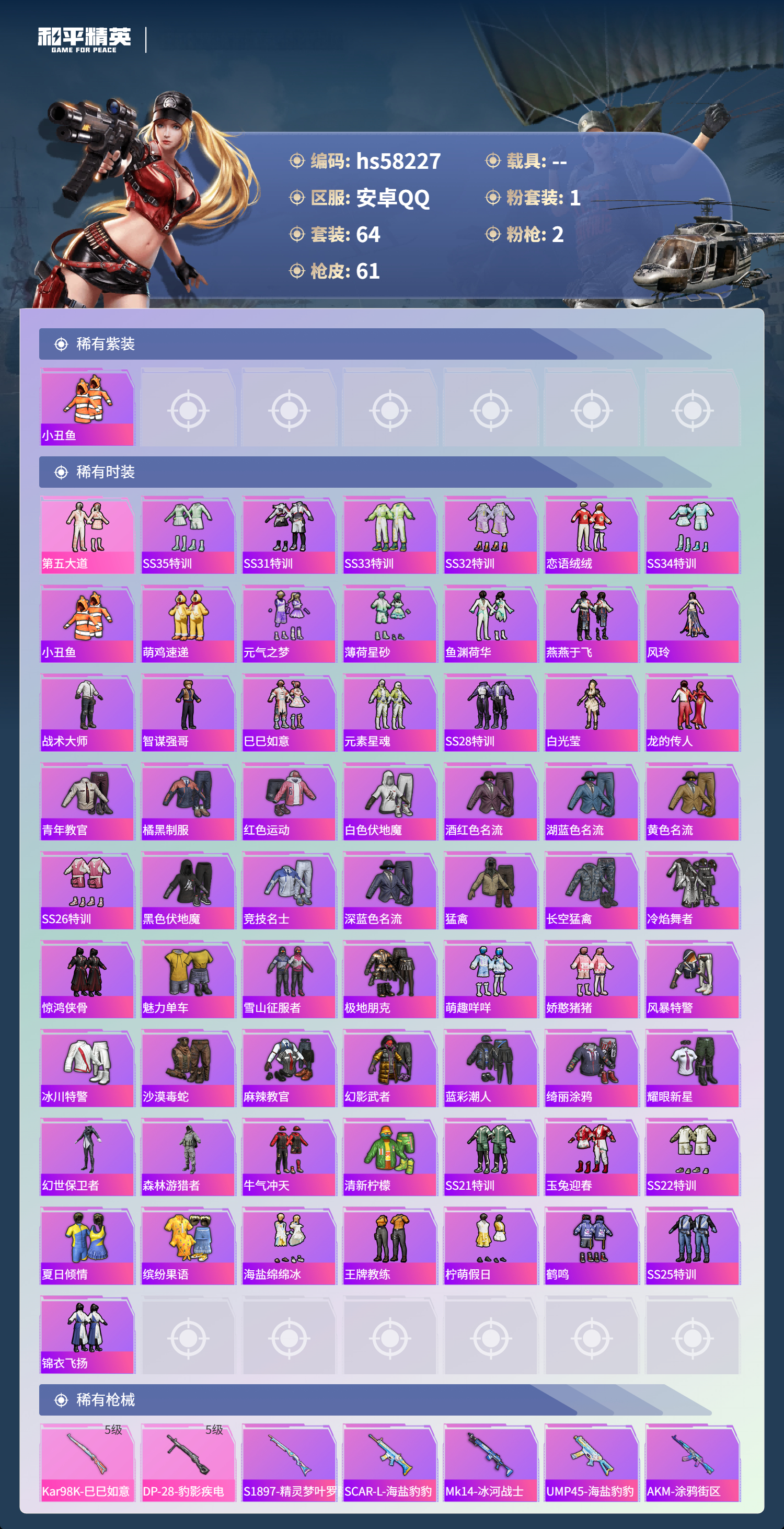 hs58227 安卓手q-2王牌印记-1粉装-2特效呛-17245热力值-64套装-61呛皮-1卓越印记【1粉装】套装-第五大道【2特效呛】kar98k-巳巳如意/5级dp-28-豹影疾电/5级【1稀有紫装】小丑鱼【64稀有时装】第五大道ss35特训ss31特训ss33特训ss32特训恋语绒绒ss34特训小丑鱼萌鸡速递元气之梦薄荷星砂鱼渊荷华燕燕于飞风玲战术大