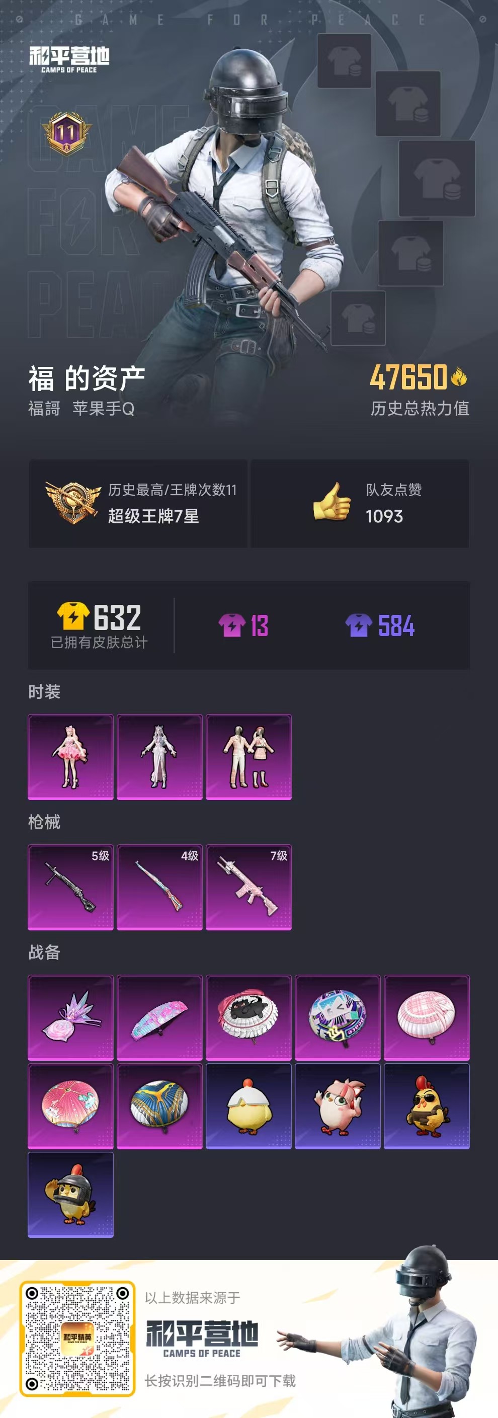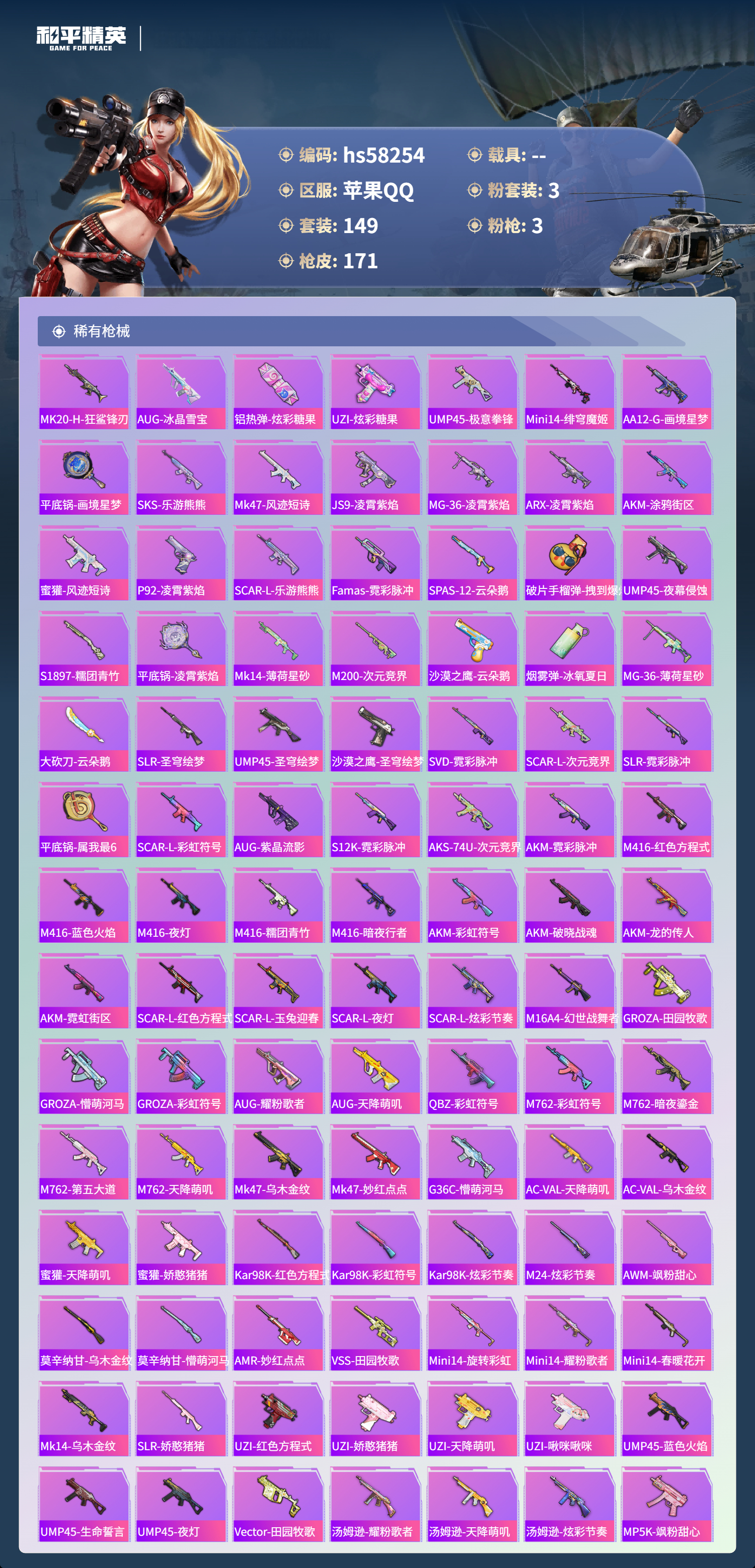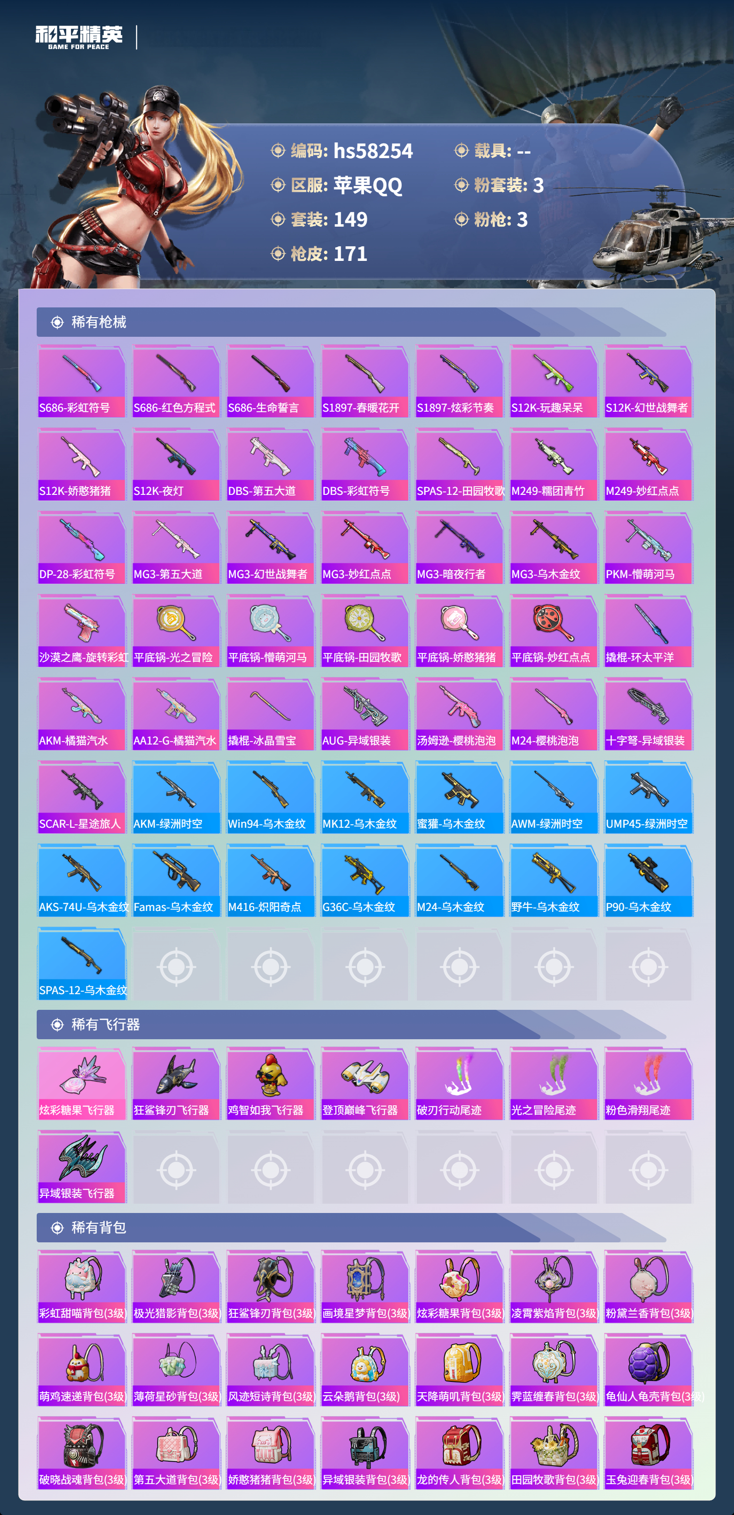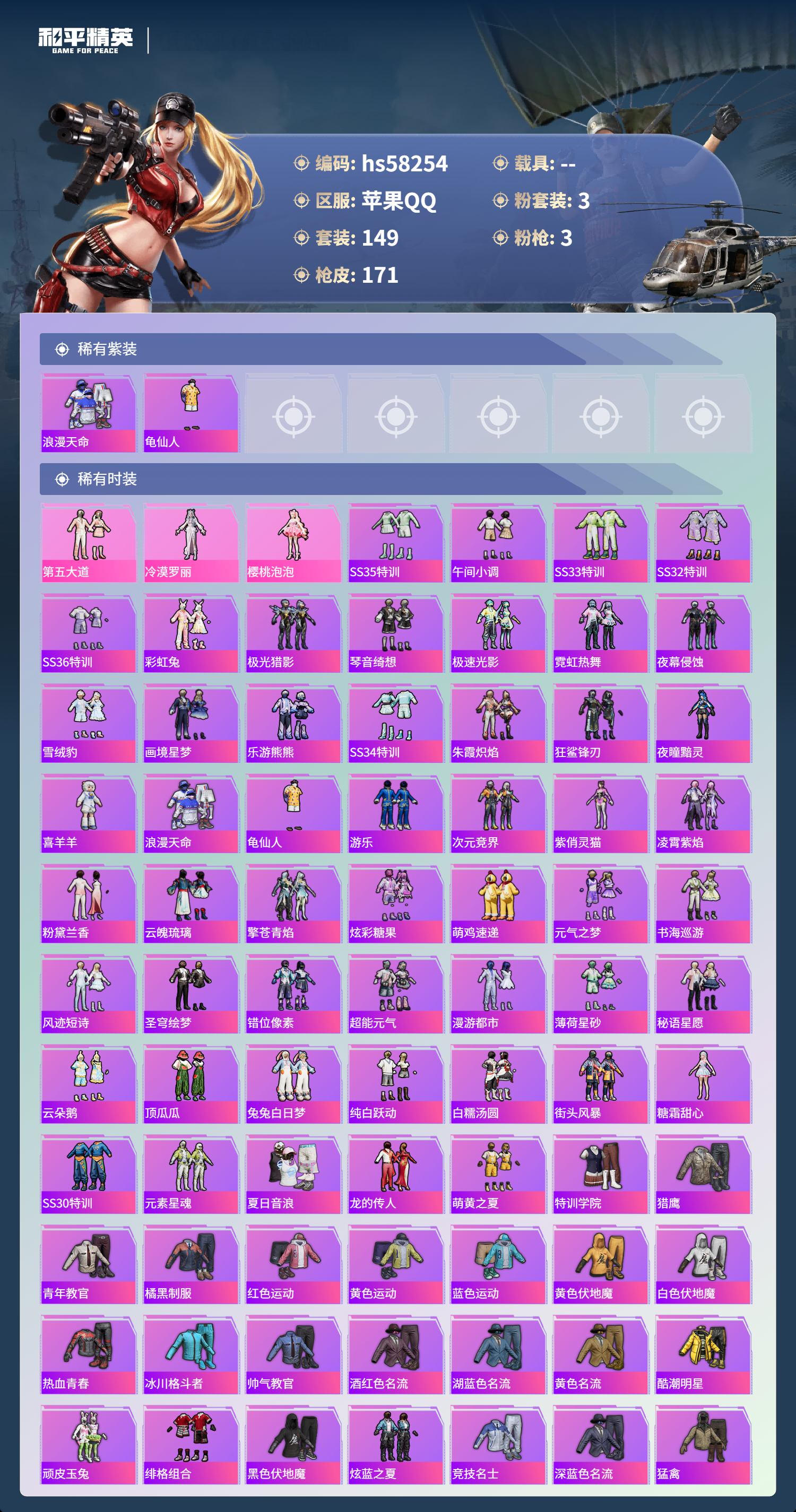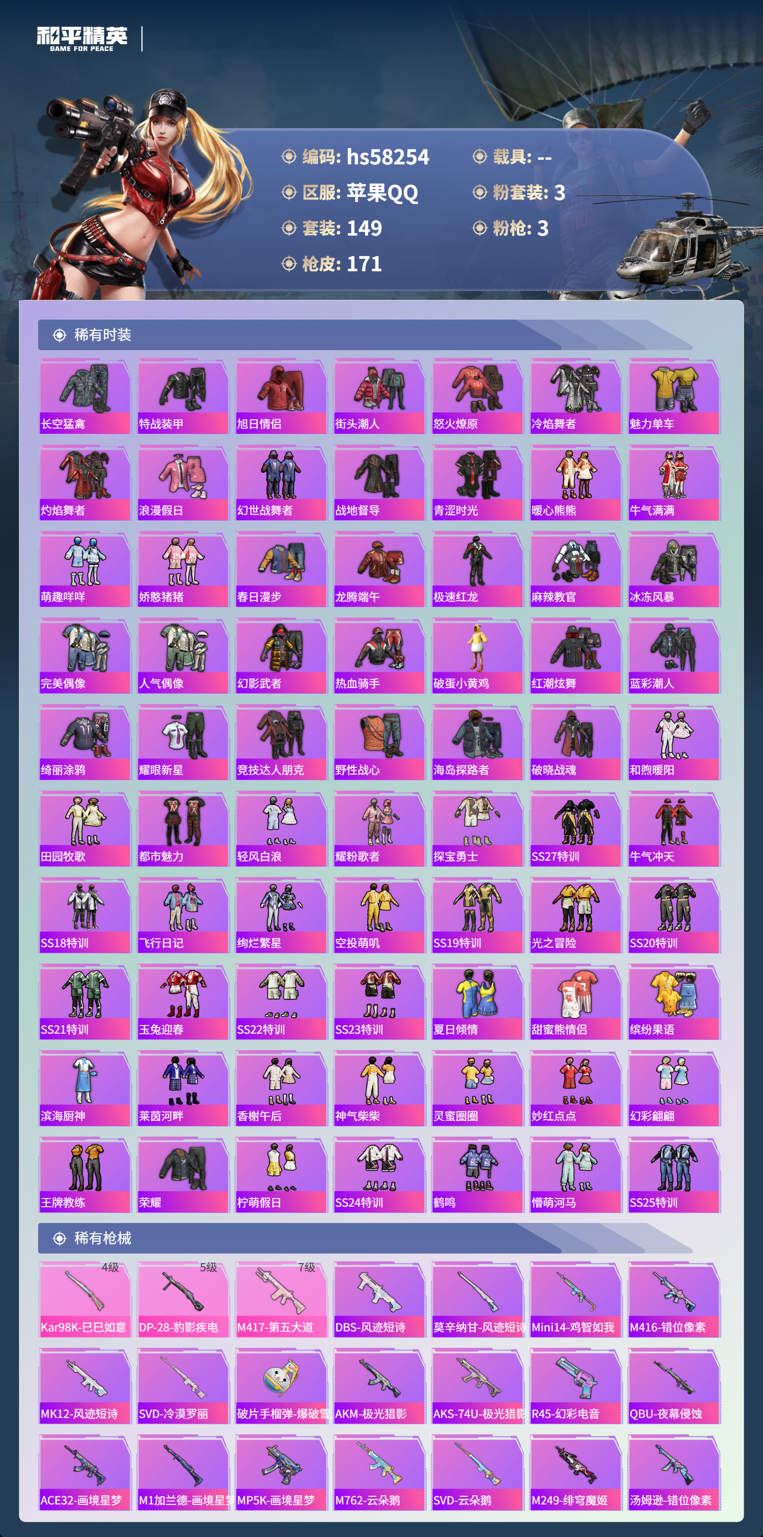 hs58254 苹果手q-11王牌印记-3粉装-3特效呛-47650热力值-149套装-171呛皮【3粉装】角色-樱桃泡泡角色-冷漠罗丽套装-第五大道【3特效呛】m417-第五大道/7级dp-28-豹影疾电/5级kar98k-巳巳如意/4级【2稀有紫装】浪漫天命龟仙人【147稀有时装】第五大道冷漠罗丽ss35特训午间小调ss33特训ss32特训ss36特训彩虹兔极