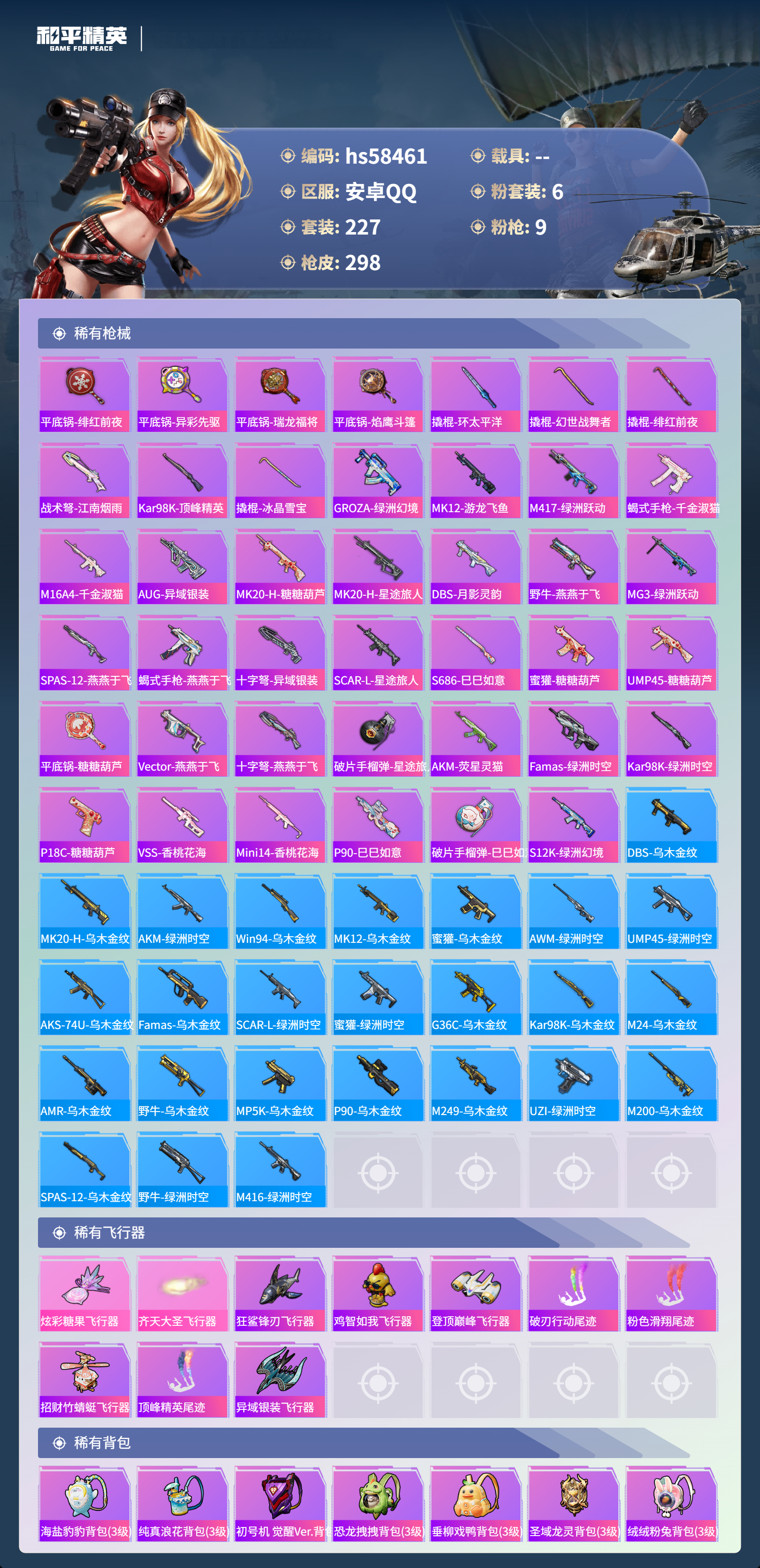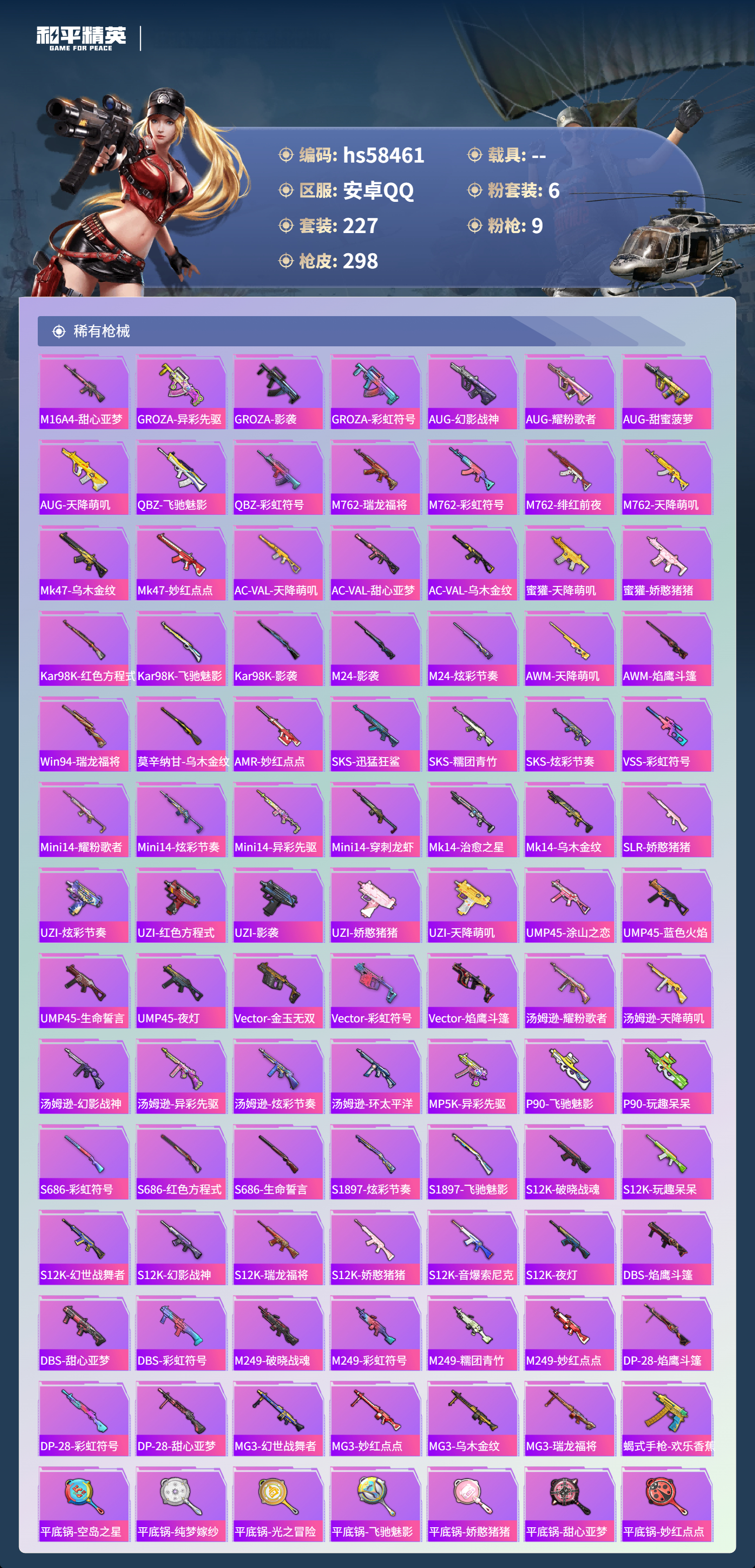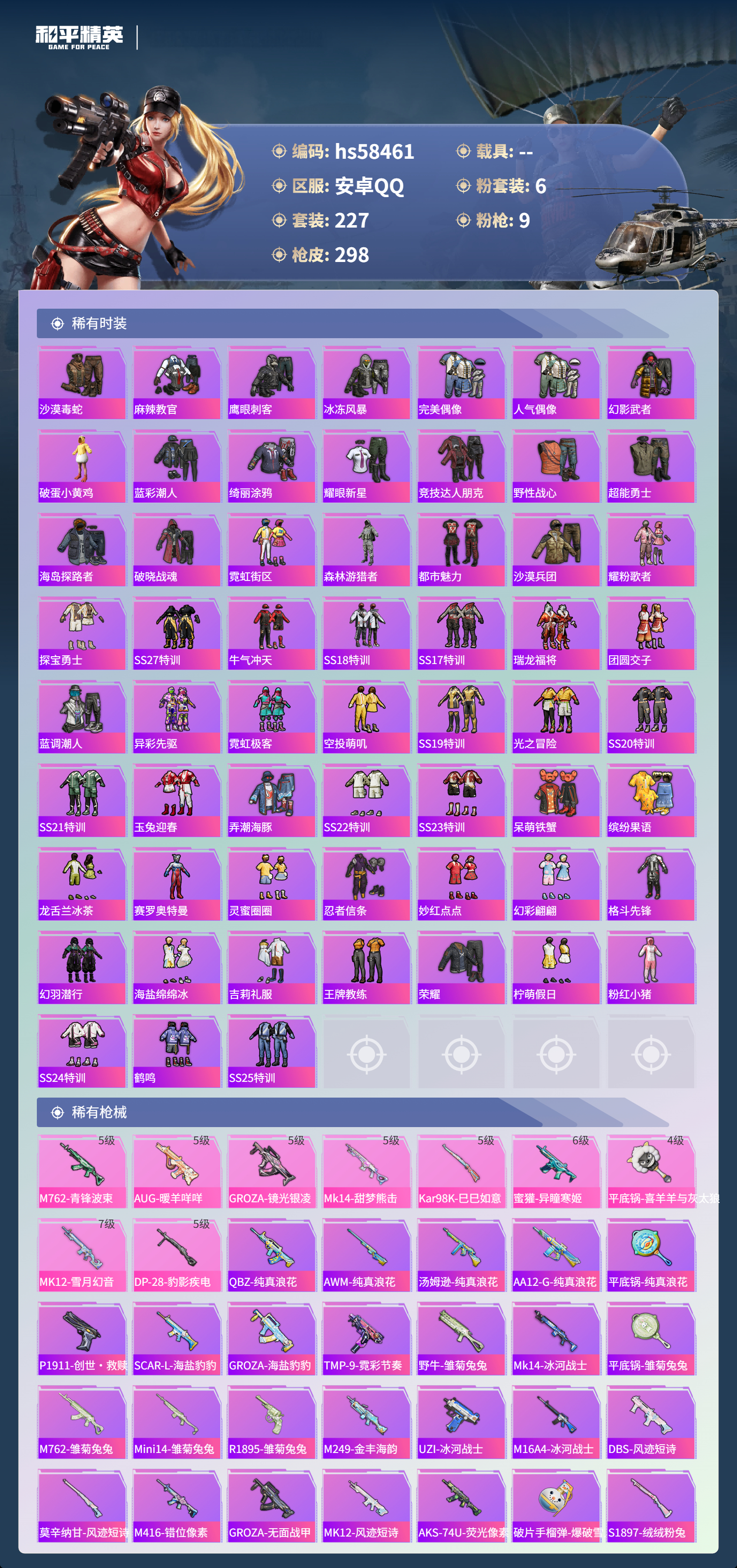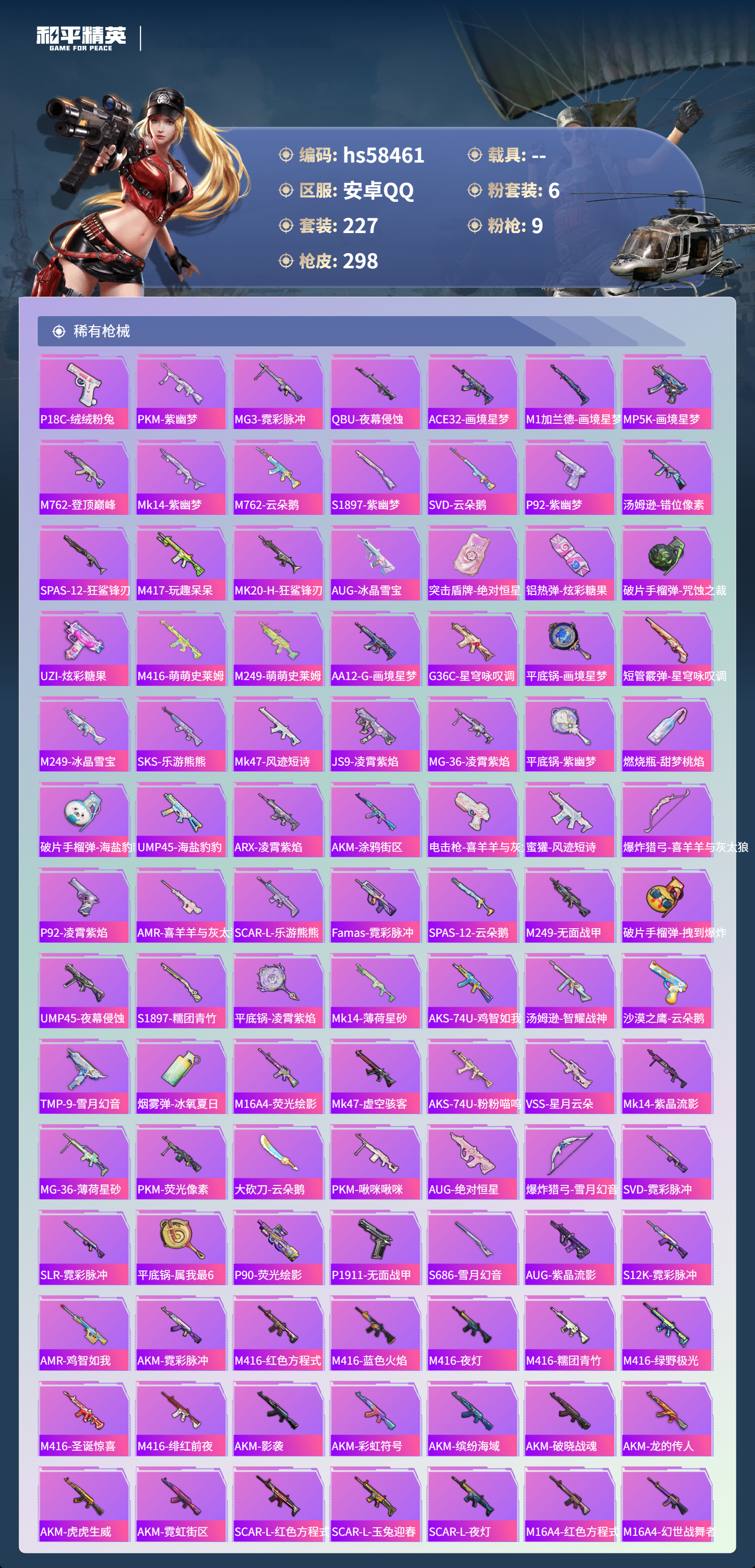0载具-227套装-298呛皮-hs58461 安卓手q-13王牌印记-6粉装-9特效呛-84758热力值-227套装-298呛皮-2卓越印记【6粉装】套装-幻影战神角色-羊梦糖心角色-千金淑猫套装-暗夜鎏金套装-幻彩电音套装-缤纷油彩【9特效呛】蜜獾-异瞳寒姬/6级groza-镜光银凌/5级aug-暖羊咩咩/5级dp-28-豹影疾电/5级mk14-甜梦熊击/5级mk12-雪月幻音/7级m762-青锋波
