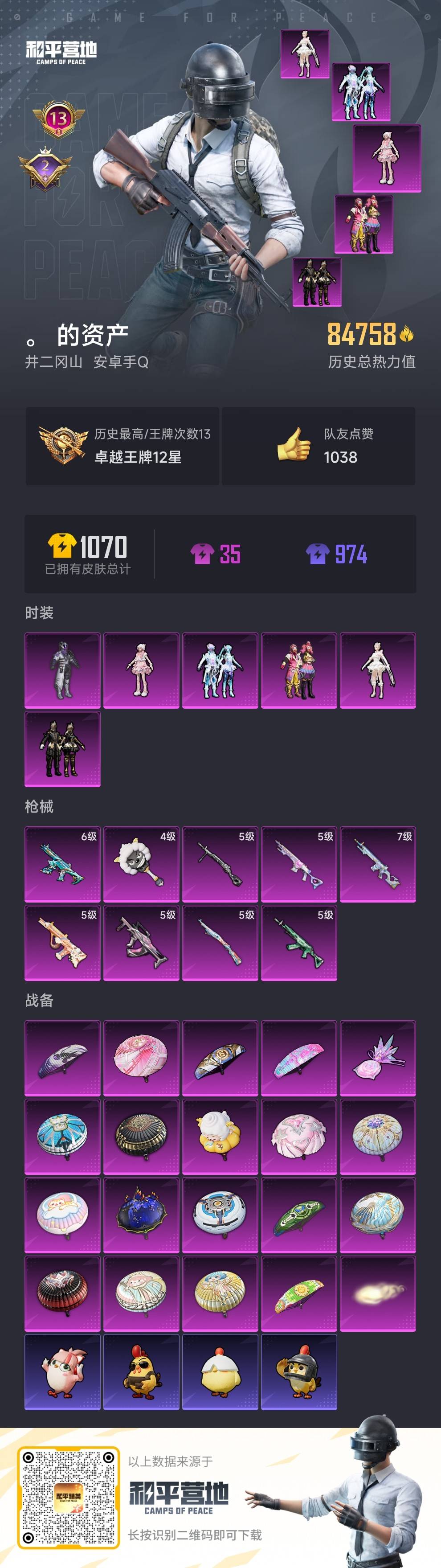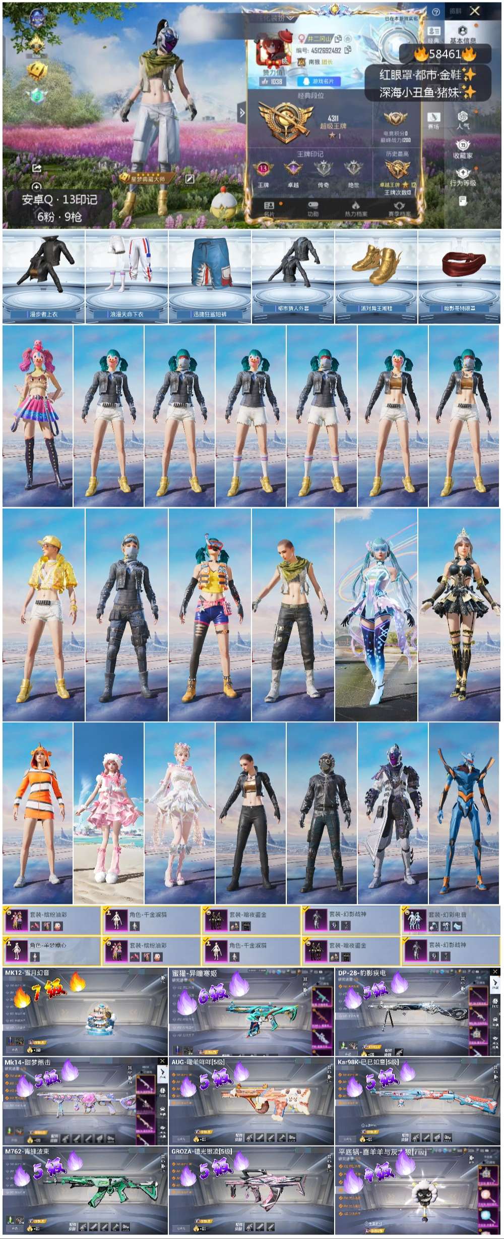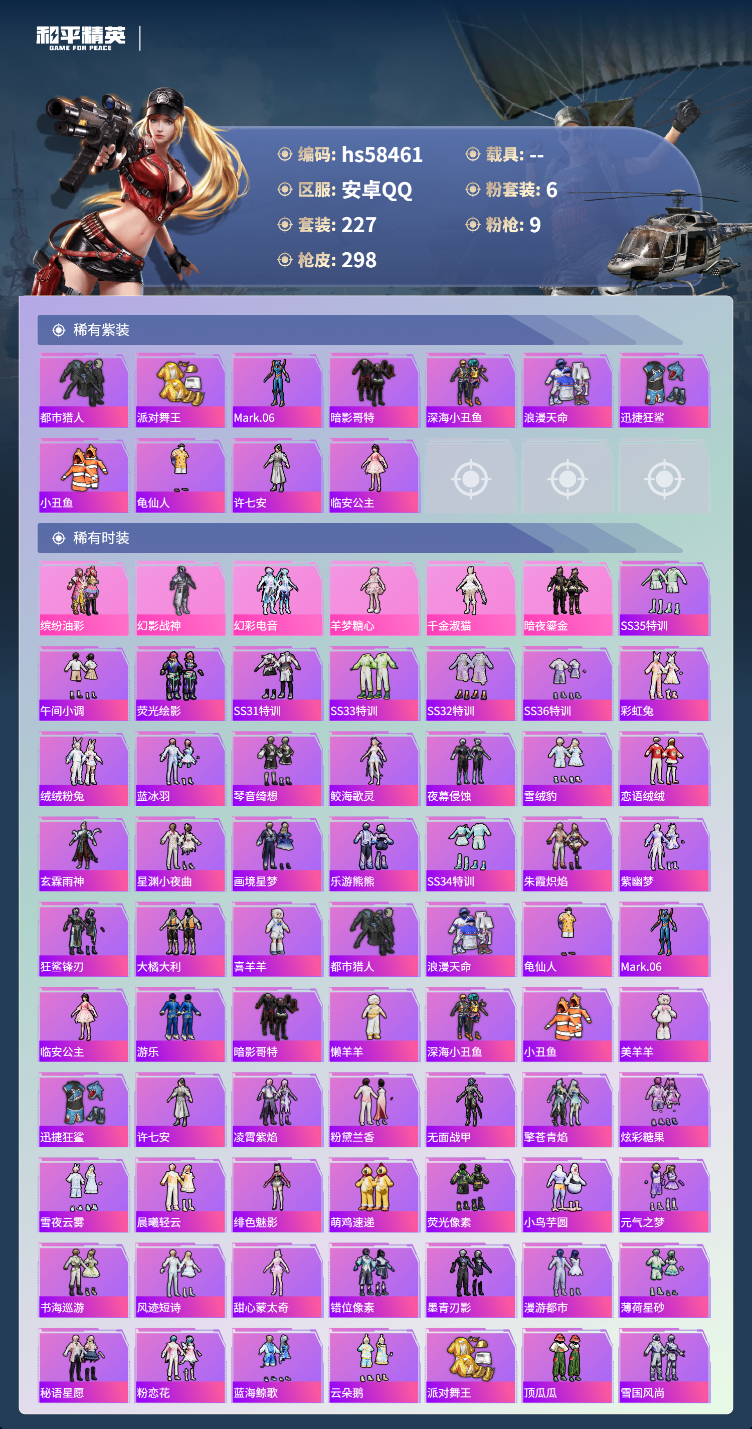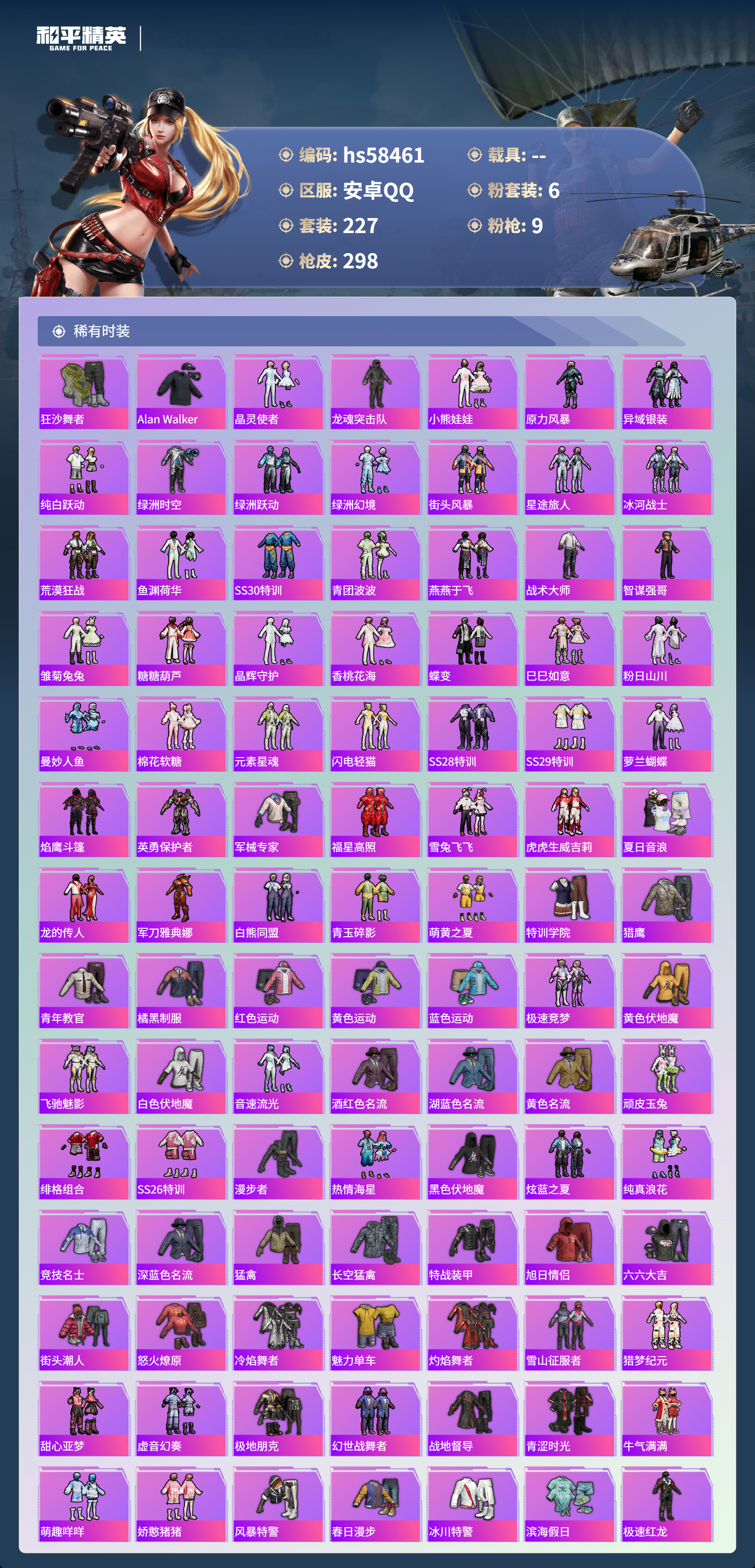 0载具-227套装-298呛皮-hs58461 安卓手q-13王牌印记-6粉装-9特效呛-84758热力值-227套装-298呛皮-2卓越印记【6粉装】套装-幻影战神角色-羊梦糖心角色-千金淑猫套装-暗夜鎏金套装-幻彩电音套装-缤纷油彩【9特效呛】蜜獾-异瞳寒姬/6级groza-镜光银凌/5级aug-暖羊咩咩/5级dp-28-豹影疾电/5级mk14-甜梦熊击/5级mk12-雪月幻音/7级m762-青锋波