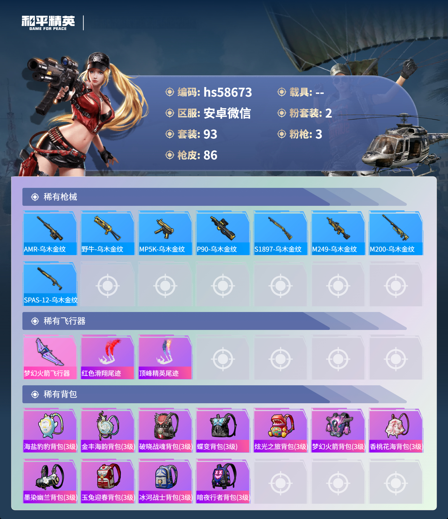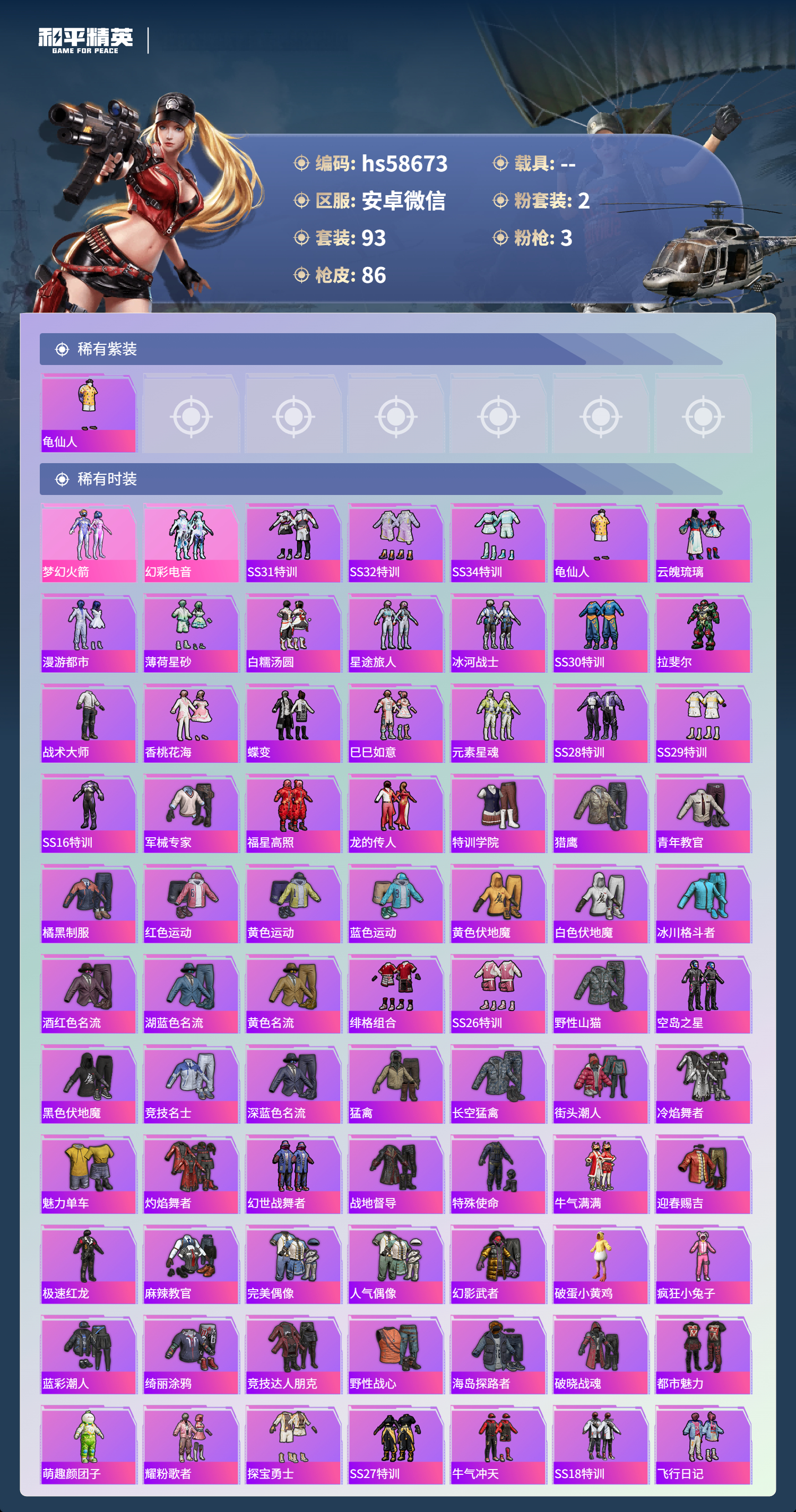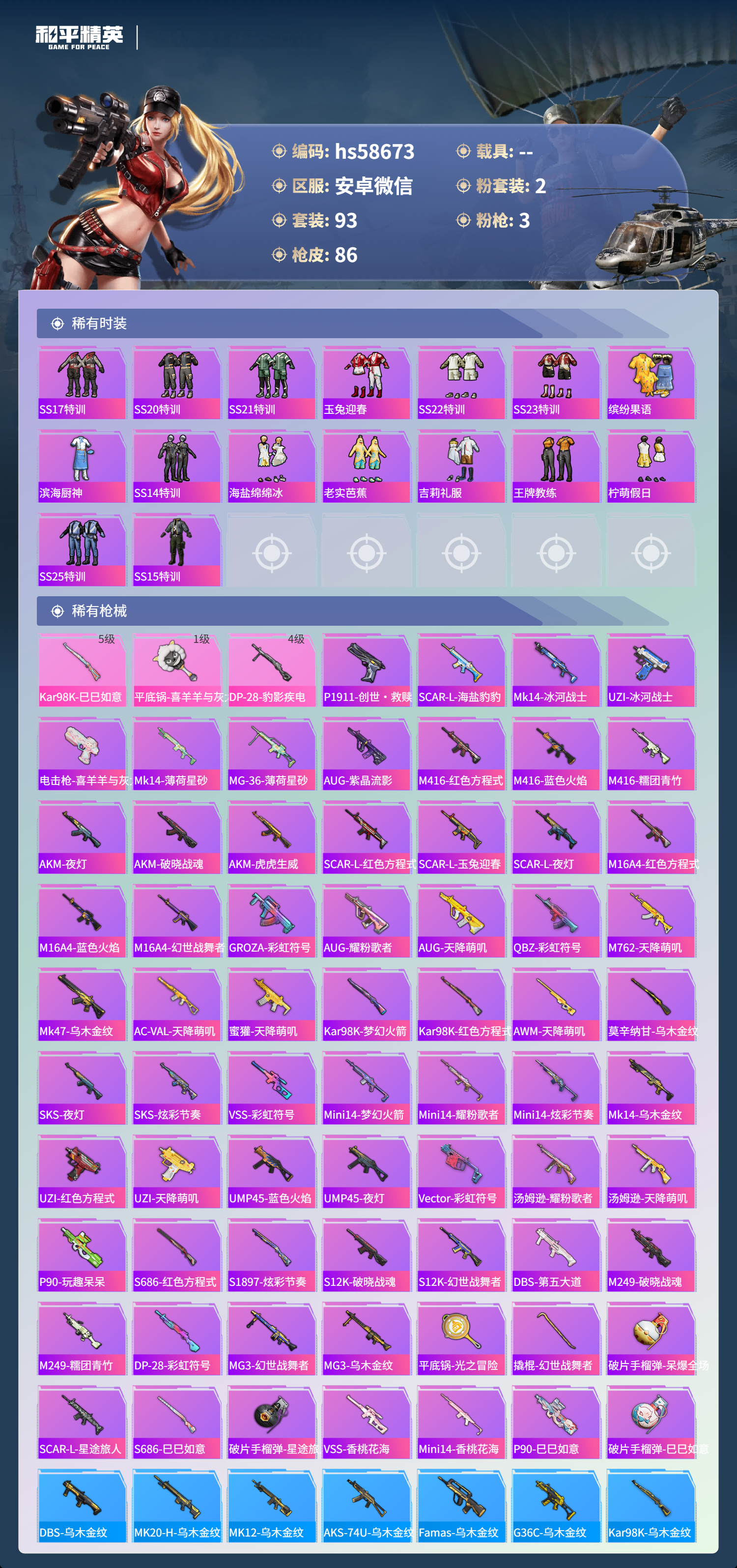 hs58673 安卓微信-4王牌印记-2粉装-3特效呛-26914热力值-93套装-86呛皮【2粉装】套装-幻彩电音套装-梦幻火箭【3特效呛】dp-28-豹影疾电/4级平底锅-喜羊羊与灰太狼/1级kar98k-巳巳如意/5级【1稀有紫装】龟仙人【93稀有时装】梦幻火箭幻彩电音ss31特训ss32特训ss34特训龟仙人云魄琉璃漫游都市薄荷星砂白糯汤圆星途旅人冰河战
