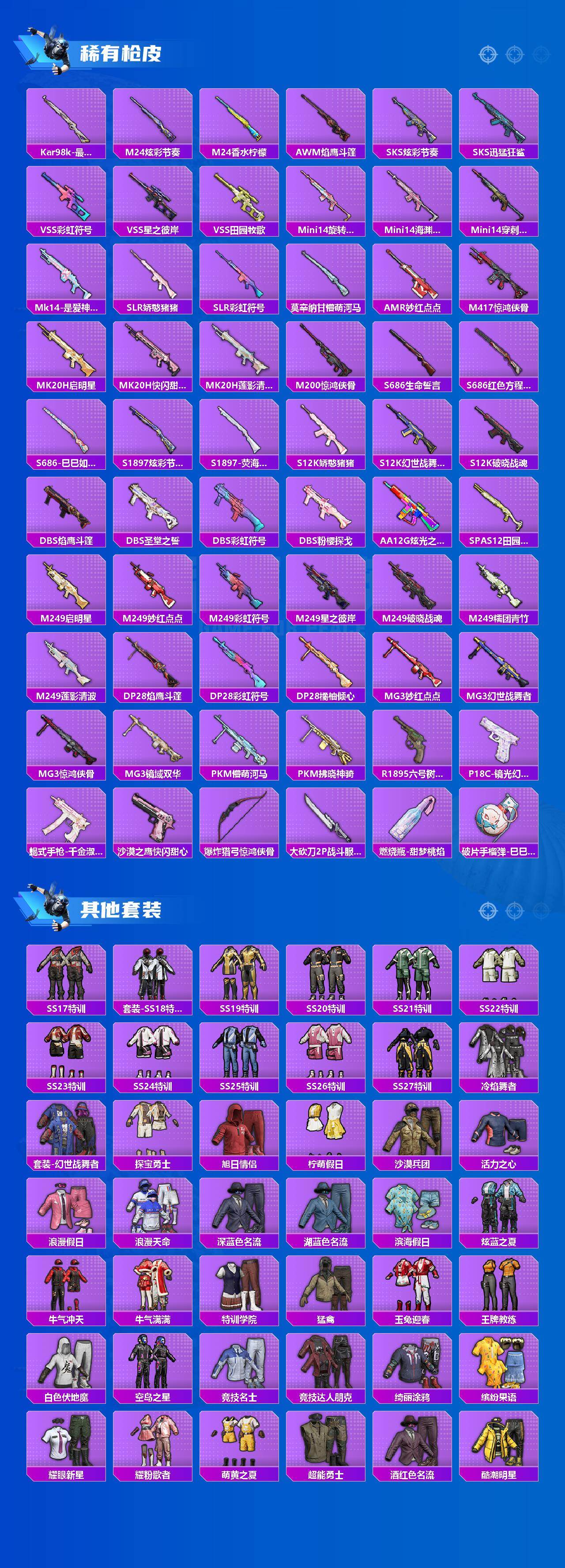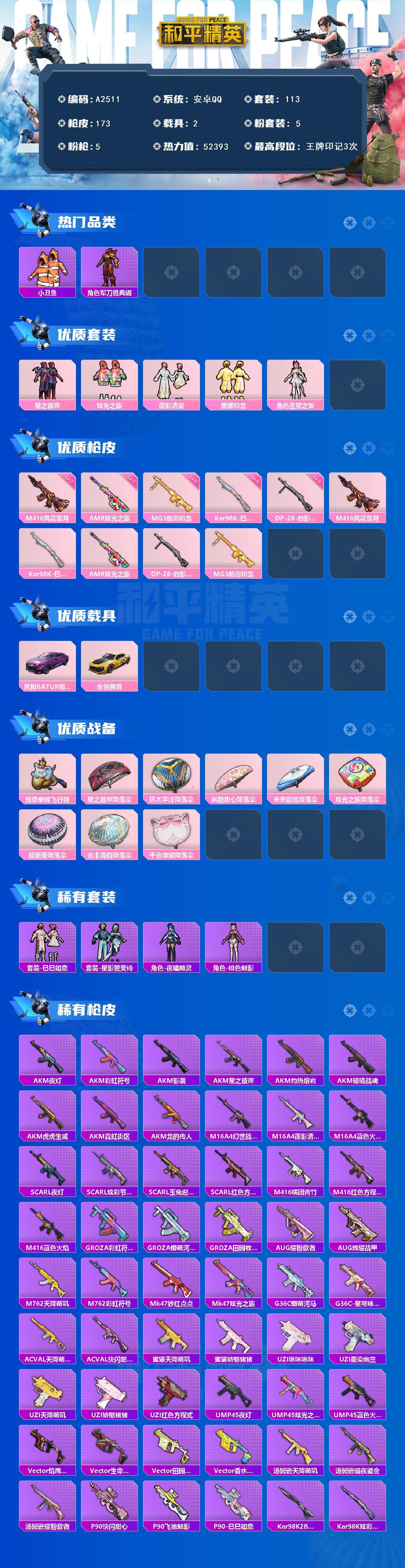 [15920900]安卓 【公主号 小丑鱼/浪漫天命/星之彼岸/炫光之旅/m416-风花雪月七级/宾利batur(极速紫)】手q-5粉装-5特效呛-2载具-2粉色飞行器-52393热力值-3王牌印记-113套装-173呛皮 【热门品类】:套装-浪漫天命,套装-小丑鱼,角色-军刀雅典娜,套装-龟仙人 【粉色套装】:粉装-星之彼岸,粉装-炫光之旅,粉装-莲影清波,粉装-暖暖奶龙,角色-圣堂之誓 【粉色呛皮等级】:m416-风花雪月七级,kar98k-巳巳如意五级,amr-炫光之旅七级,dp-28-豹影疾电五级,mg3-酷泡奶龙五级 【粉色载具】:宾利batur(极速紫),永恒黄蜂 【粉色呛皮】:m416-风花雪月,kar98k-巳巳如意,amr-炫光之旅,dp-28-豹影疾电,mg3-酷泡奶龙 【粉色飞行器】:极意拳锋飞行器 【粉色降落伞】:星之彼岸降落伞,环太平洋降落伞,飒粉甜心降落伞,未来歌姬降落伞,炫光之旅降落伞,超新星降落伞,金丰海韵降落伞,千金淑猫降落伞,炫彩糖果降落伞 【稀有套装】:套装-龟仙人,套装-巳巳如意,套装-雪国风尚,套装-星影赞美诗,角色-夜瞳黯灵,角色-绯色魅影 【稀有呛皮】:akm-夜灯,akm-彩虹符号,akm-影袭,akm-星之彼岸,akm-灼热熔岩,akm-破晓战魂,akm-虎虎生威,akm-霓虹街区,akm-龙的传人,m16a4-幻世战舞者,m16a4-莲影清波,m16a4-蓝色火焰,scar-l-夜灯,scar-l-炫彩节奏,scar-l-玉兔迎春,scar-l-红色方程式,m416-糯团青竹,m416-红色方程式,m416-蓝色火焰,groza-彩虹符号,groza-懵萌河马,groza-田园牧歌,aug-辉耀战甲,aug-耀粉歌者,m762-天降萌叽,m762-彩虹符号,mk47-妙红点点,mk47-炫光之旅,g36c-懵萌河马,g36c-星穹咏叹调,ac-val-天降萌叽,ac-val-快闪甜心,蜜獾-天降萌叽,蜜獾-娇憨猪猪,uzi-啾咪啾咪,uzi-墨染幽兰,uzi-天降萌叽,uzi-娇憨猪猪,uzi-红色方程式,ump45-夜灯,ump45-炫光之旅,ump45-蓝色火焰,vect-焰鹰斗篷,vect-生命誓言,vect-田园牧歌,vect-香水柠檬,汤姆逊-天降萌叽,汤姆逊-暗夜鎏金,汤姆逊-耀粉
