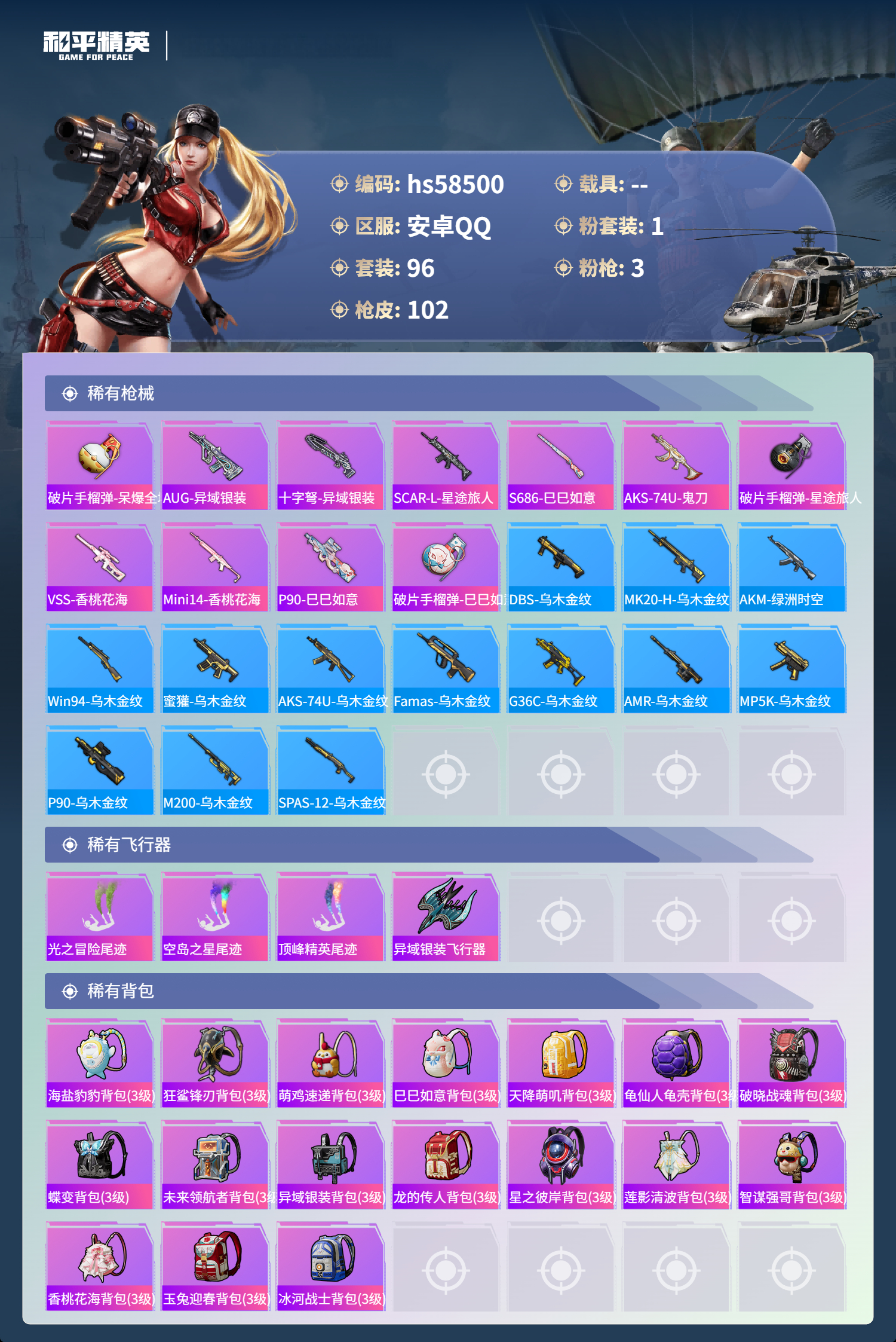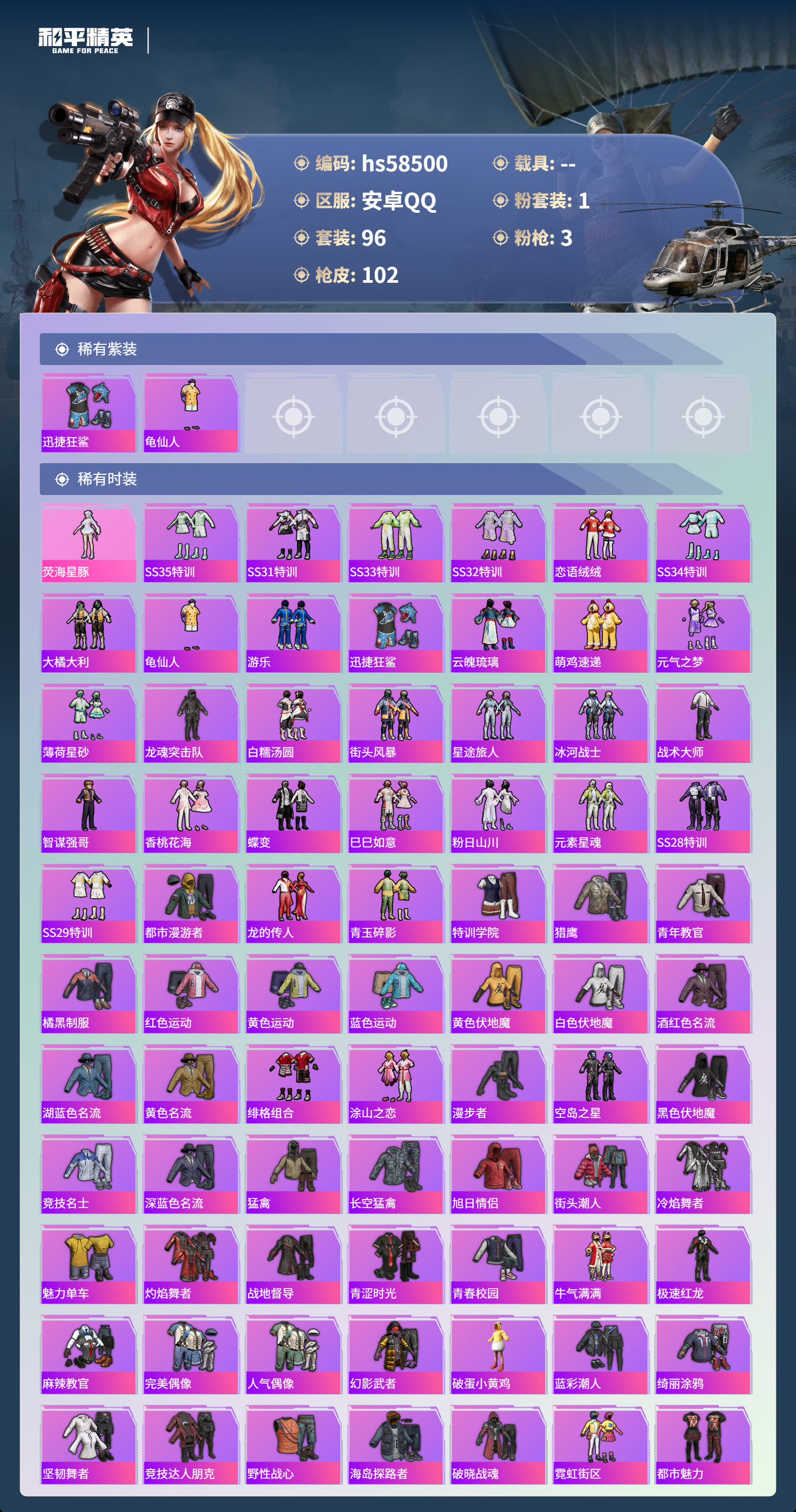 0载具-96套装-102呛皮-hs58500 安卓手q-3王牌印记-1粉装-3特效呛-28182热力值-96套装-102呛皮-2卓越印记【1粉装】角色-荧海星豚【3特效呛】kar98k-巳巳如意/5级aks-74u-星穹咏叹调/4级dp-28-豹影疾电/5级【2稀有紫装】迅捷狂鲨龟仙人【96稀有时装】荧海星豚ss35特训ss31特训ss33特训ss32特训恋语绒绒ss34特训大橘大利龟仙人游乐